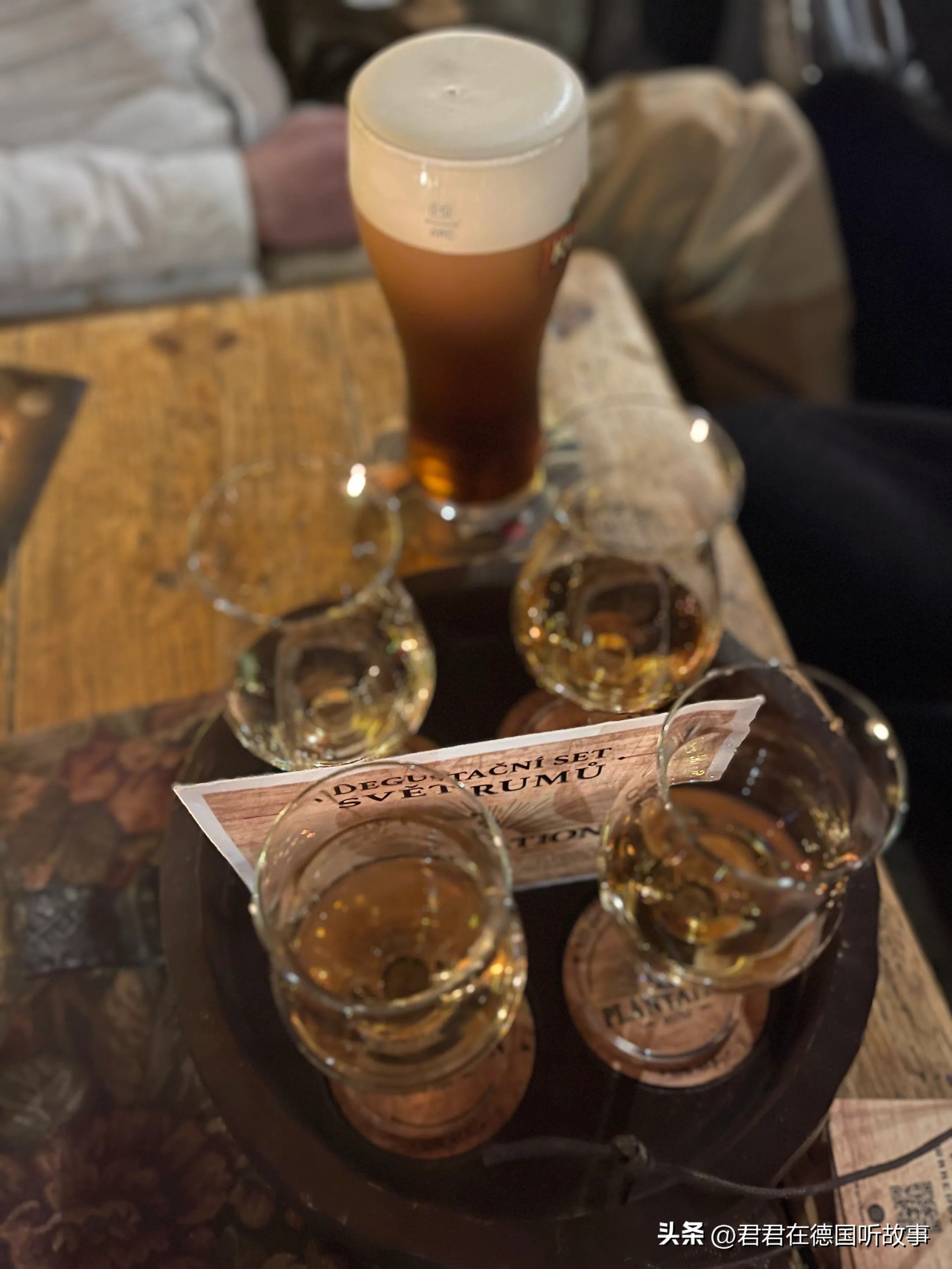 5、来捷克一定要喝黑啤,捷克一年啤酒销量居然超过了德国!确实没想到德国人喝不过捷克人。我们在酒店附近600米找到两家很不错的小酒馆,服务员既不会英语也不会德语,他们说俄语和捷克语。好吧,我们根据网上评论来点啤酒,英国精酿啤酒是当地黑啤的两倍价格,我们品尝了四种不同的威士忌,今日消费97欧元。