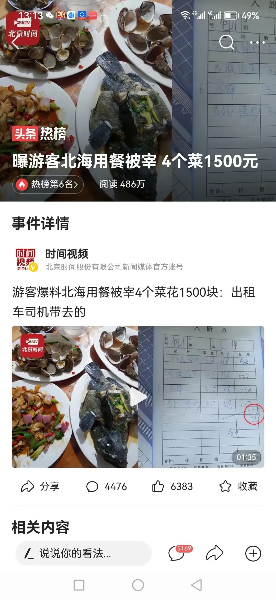4个菜1500元,一游客被出租车司机带进广西北海饭店消费,买单后才知道价格不对