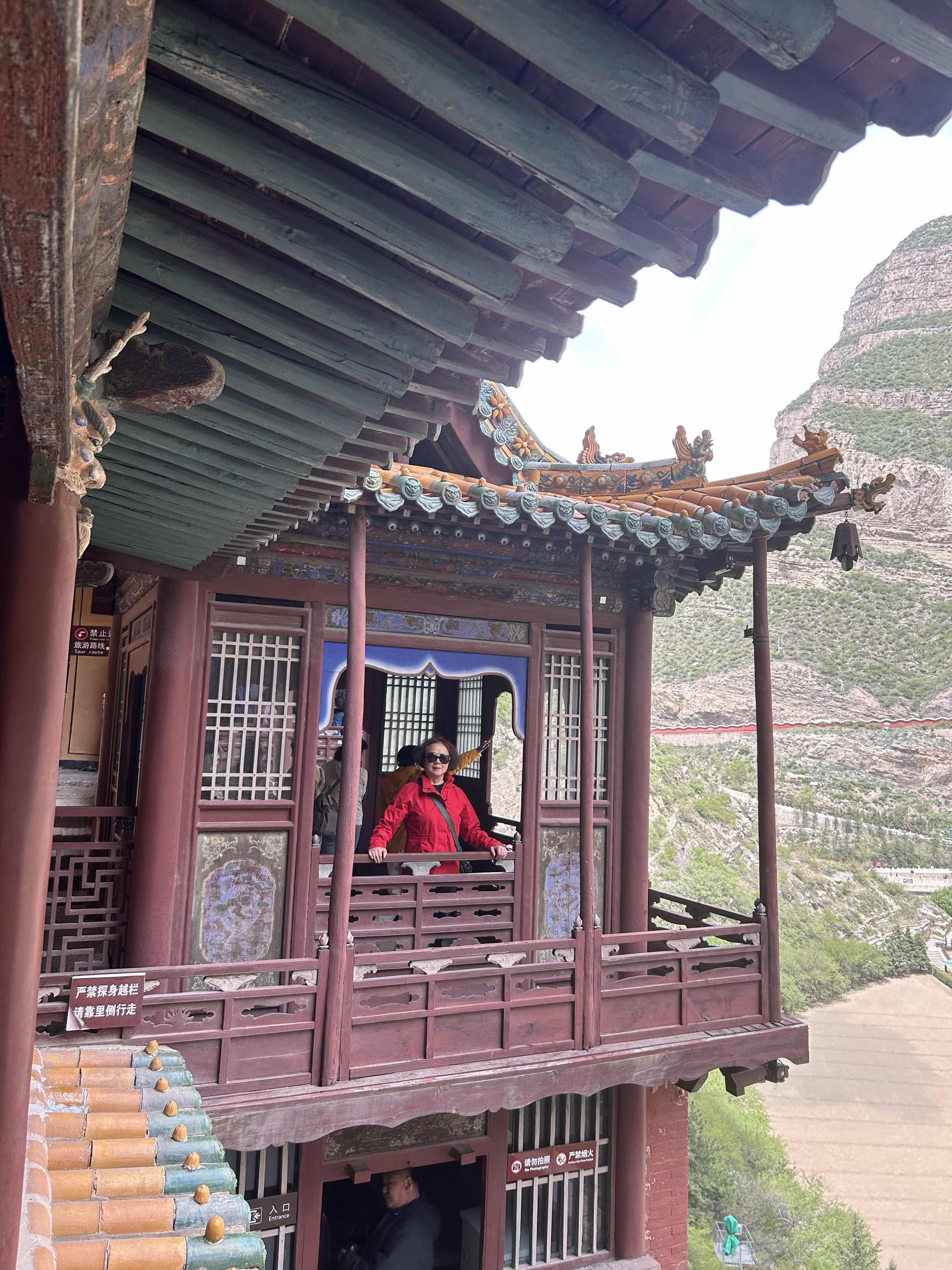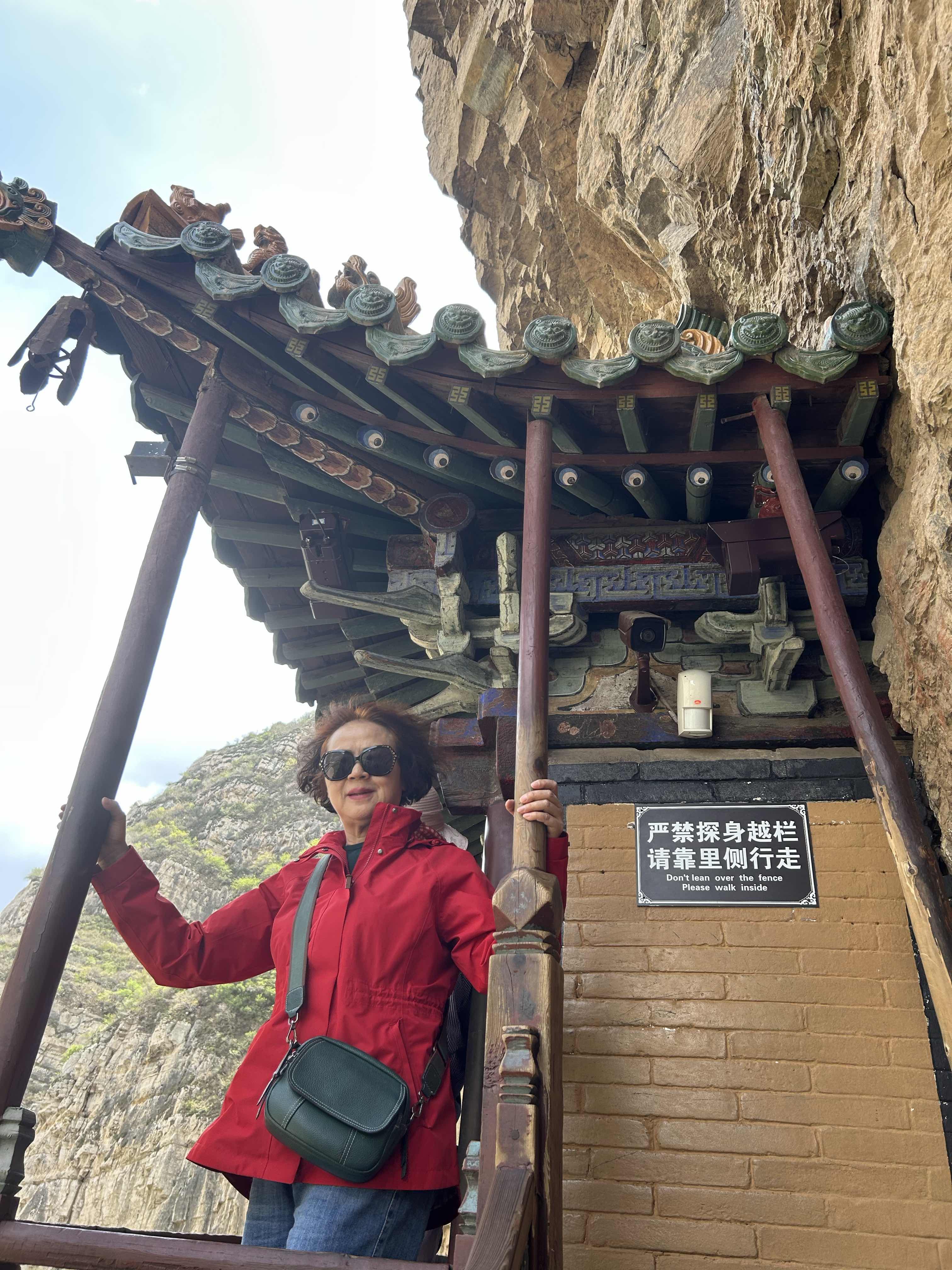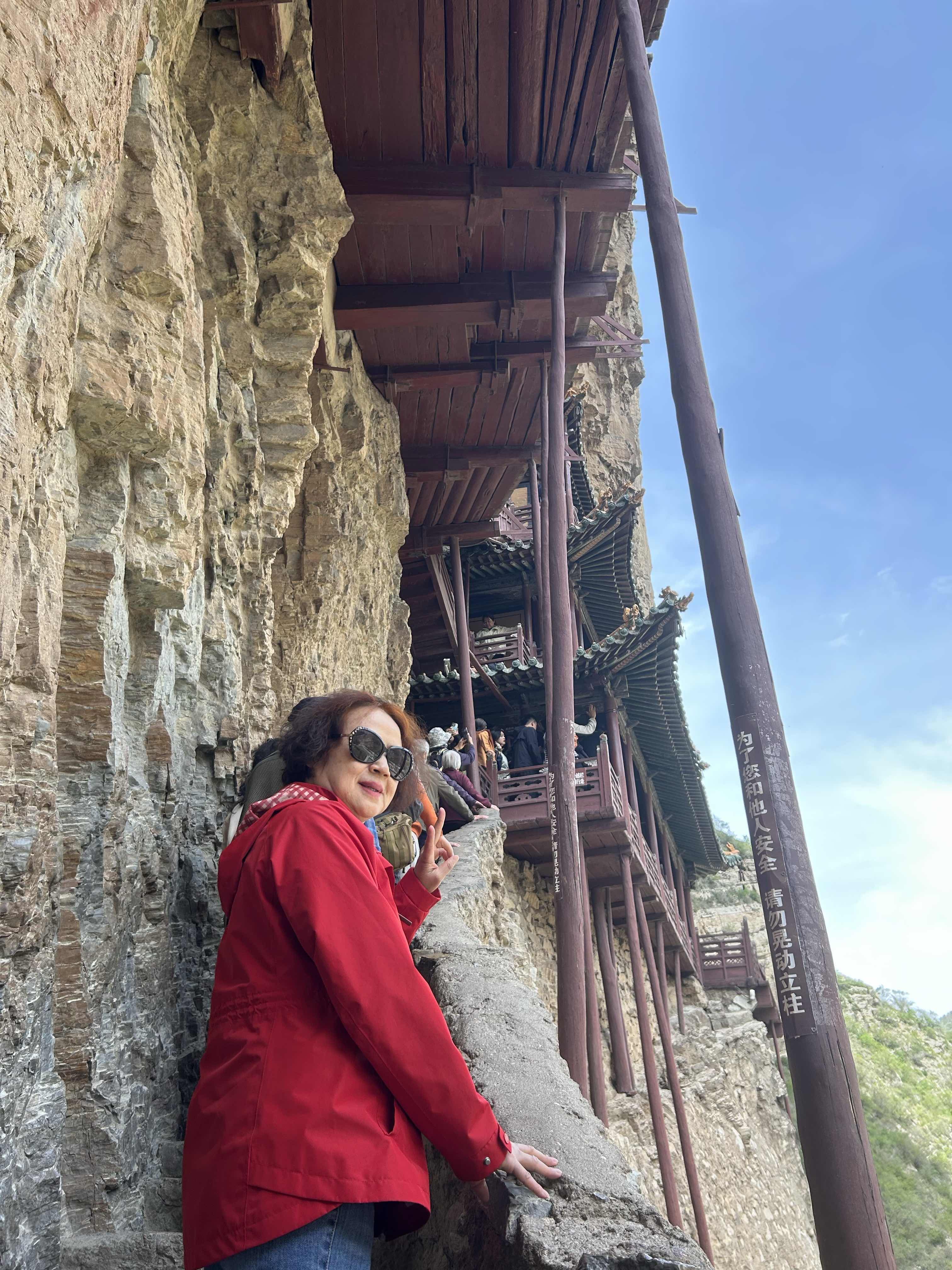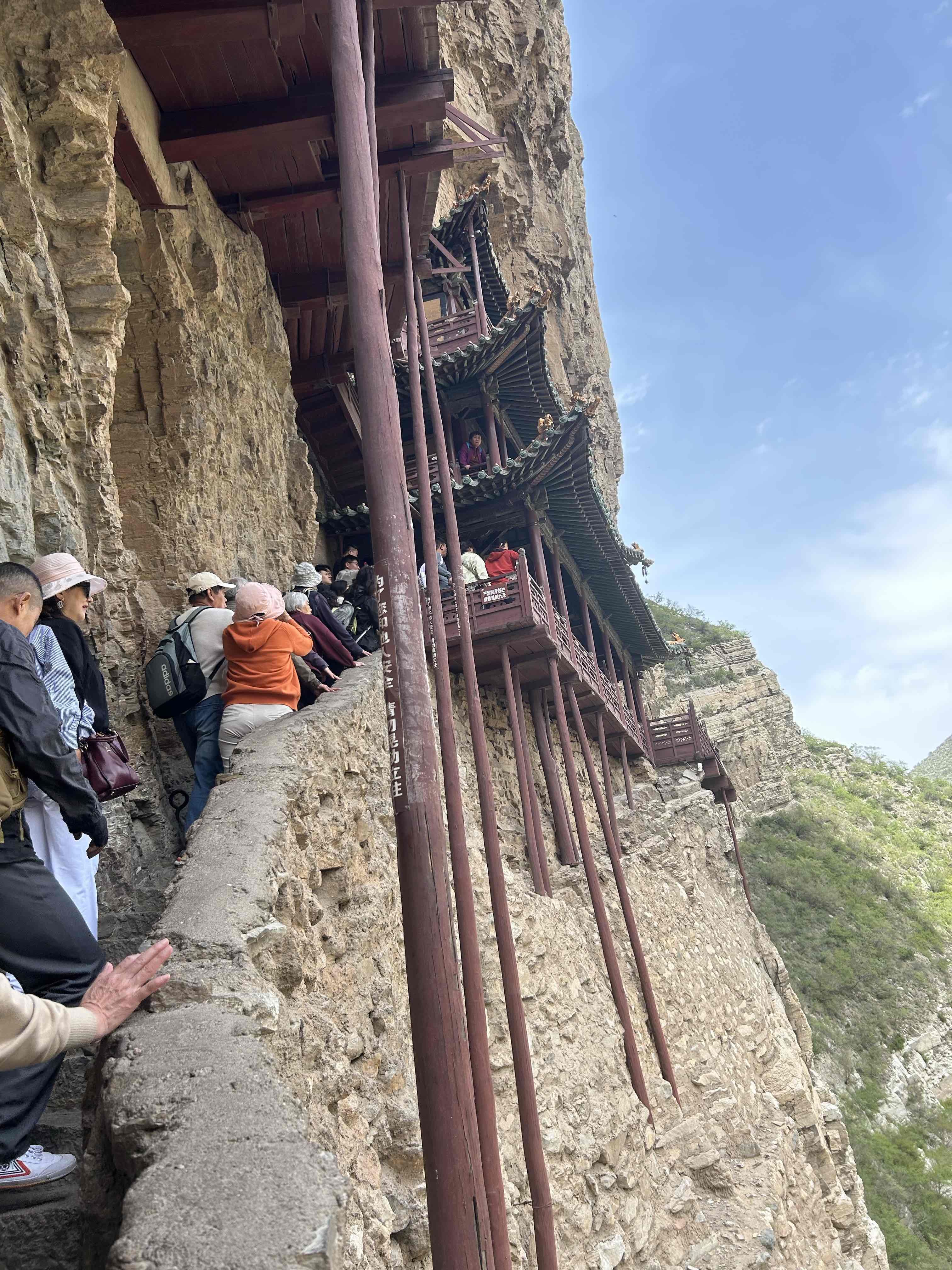 沿着陡峭的楼梯,我小心谨慎地攀爬。楼道狭窄得难以让两人并排通行,围栏也很低矮,令人胆战心惊。站在栈道上,脚下嘎吱作响,吓得我赶紧扶紧栏杆。寺内的殿堂禅房小巧精致,飞檐彩瓦层层叠叠,曲廊回旋错落有致,半壁佛堂半壁石窟,变幻神奇绝妙。几十根碗口粗细的木柱支撑起殿堂,承载着岁月的沧桑。1个半小时的攀爬,虽然手脚难以舒展,但却让我深切感受到它“奇、悬、巧”的魅力,这无疑是古代工匠智慧的神来之笔。