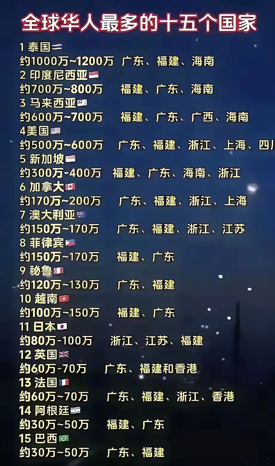 全球华人最多的15个国家,按人数排序大致如下:
