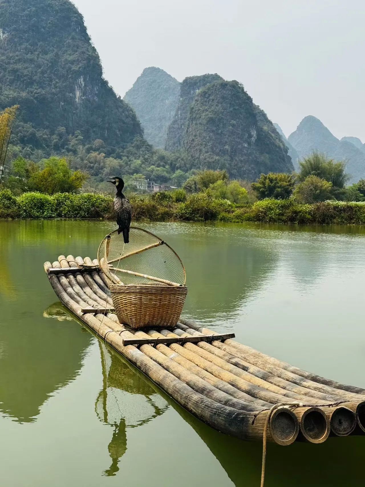 清晨的漓江宛如被轻纱笼罩的仙境。乘竹筏从杨堤码头出发,江面浮着一层薄雾,九马画山的轮廓在氤氲中若即若离,渔翁披蓑戴笠撑篙而过,惊起白鹭翩跹。行至黄布倒影,碧水如镜,20元人民币背景图的实景比想象中更震撼——两岸青山如黛,水中倒影清晰如拓,连空气都透着翡翠般的通透感。