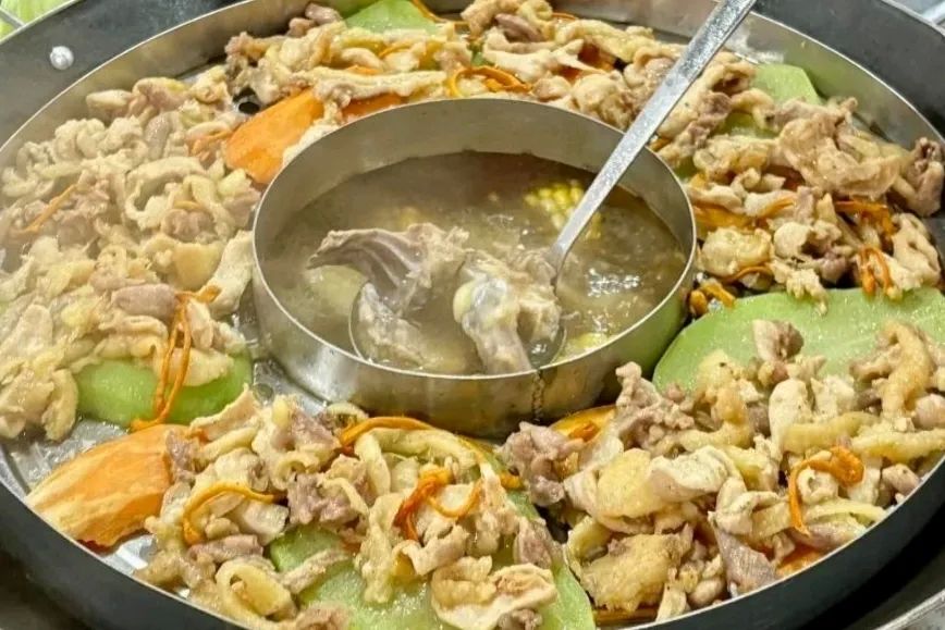 米饭是无限续的,举手一喊,阿姨就拎着一个大桶过来,豪爽地给我们添满白米饭。那米饭粒粒分明,带着淡淡的米香,配上鸡煲的汤汁,简直是“干饭神器”。我们仨人埋头猛吃,偶尔抬头对视一眼,都忍不住笑出声——这幸福感,真的太真实了!