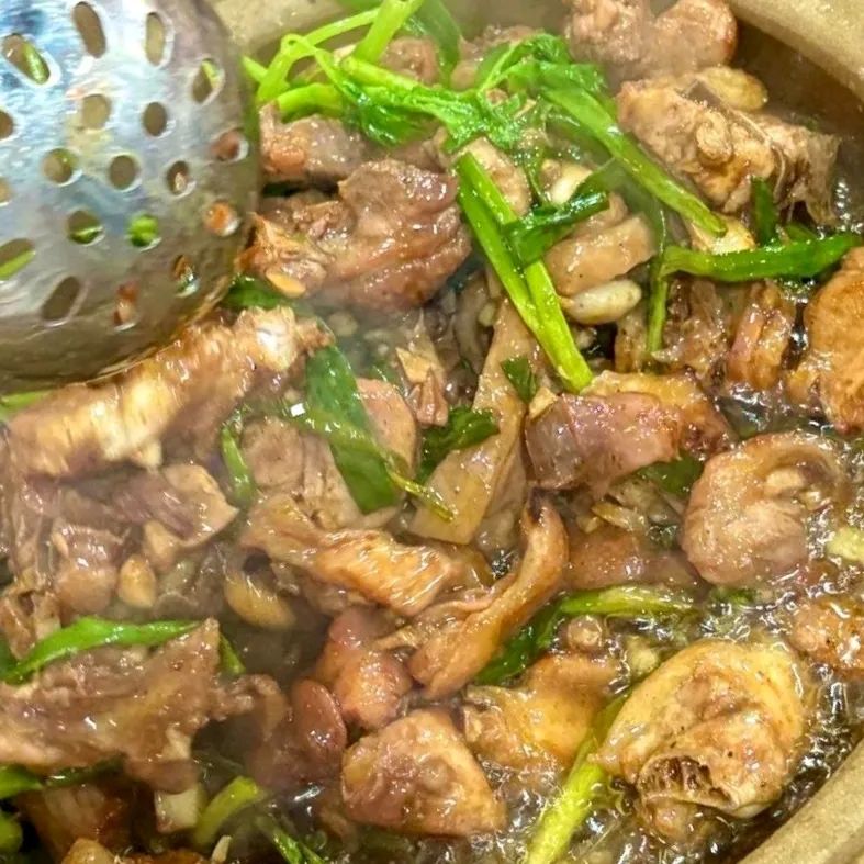 我们点的是招牌土鸡煲,选的是现杀的活鸡,鸡肉鲜嫩得仿佛一夹就化,入口满是自然的甜香,完全没有冷冻鸡的那种柴味。砂锅里的配菜也很讲究,土豆片吸满了汤汁,软糯入味;香菇和木耳增添了几分嚼劲,每一口都是层次分明的享受。阿姨还贴心地送来一小碗姜葱酱油,蘸着鸡肉吃,鲜上加鲜,朋友吃得停不下来,直说:“这鸡肉嫩得像在舌头上跳舞!”