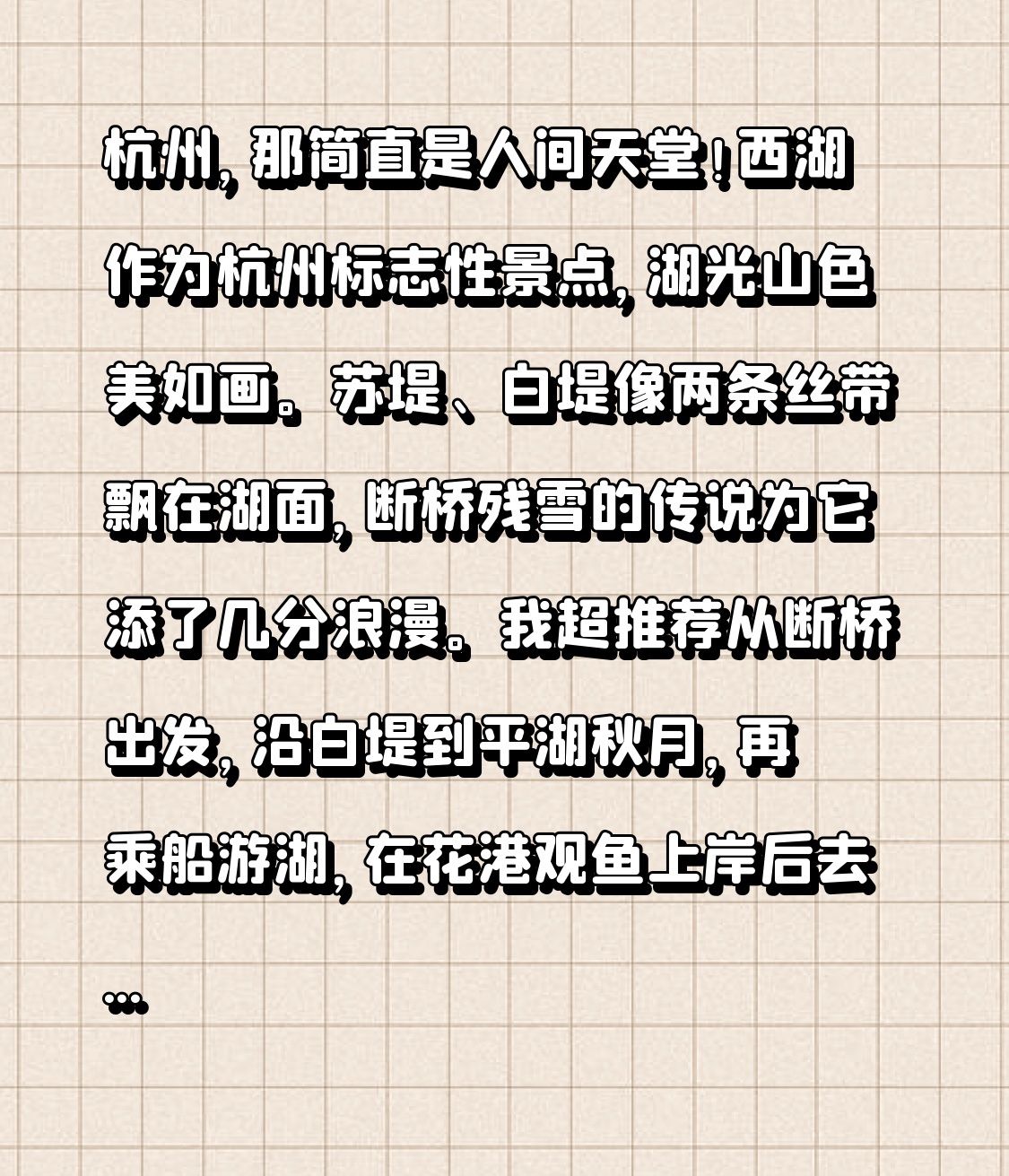 杭州,堪称人间天堂!西湖作为杭州的标志性景点,湖光山色美若画卷,苏堤、白堤宛如两