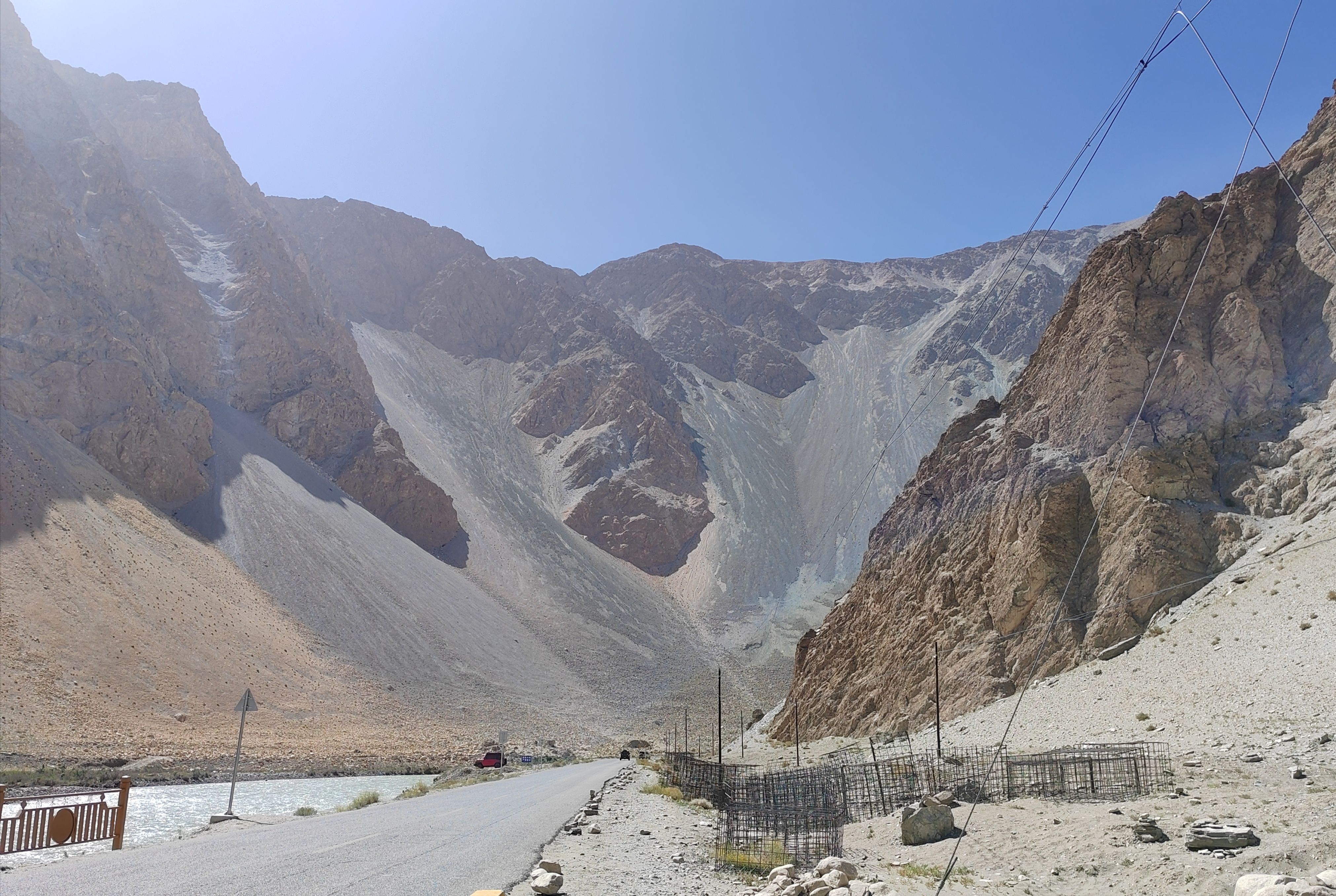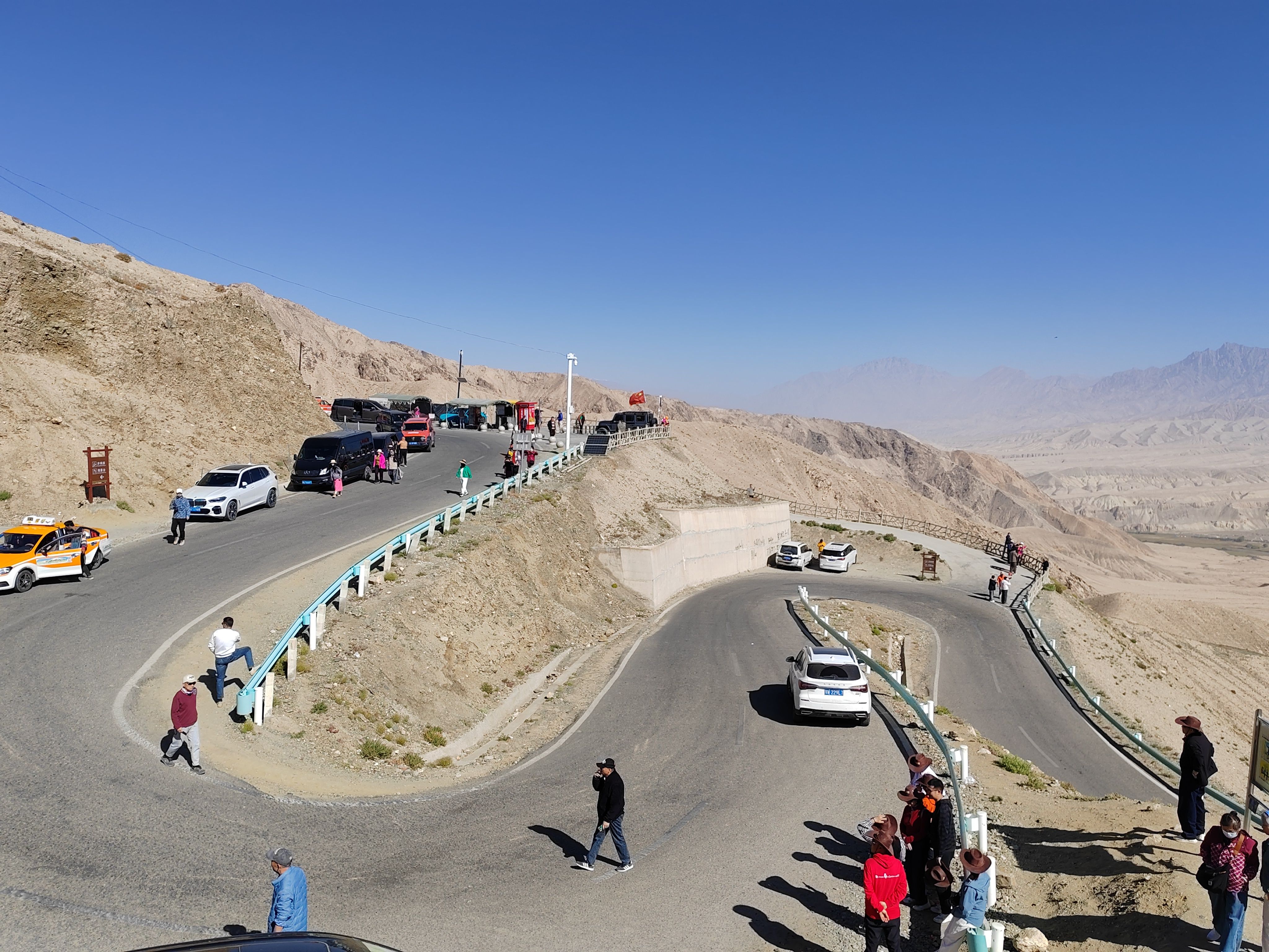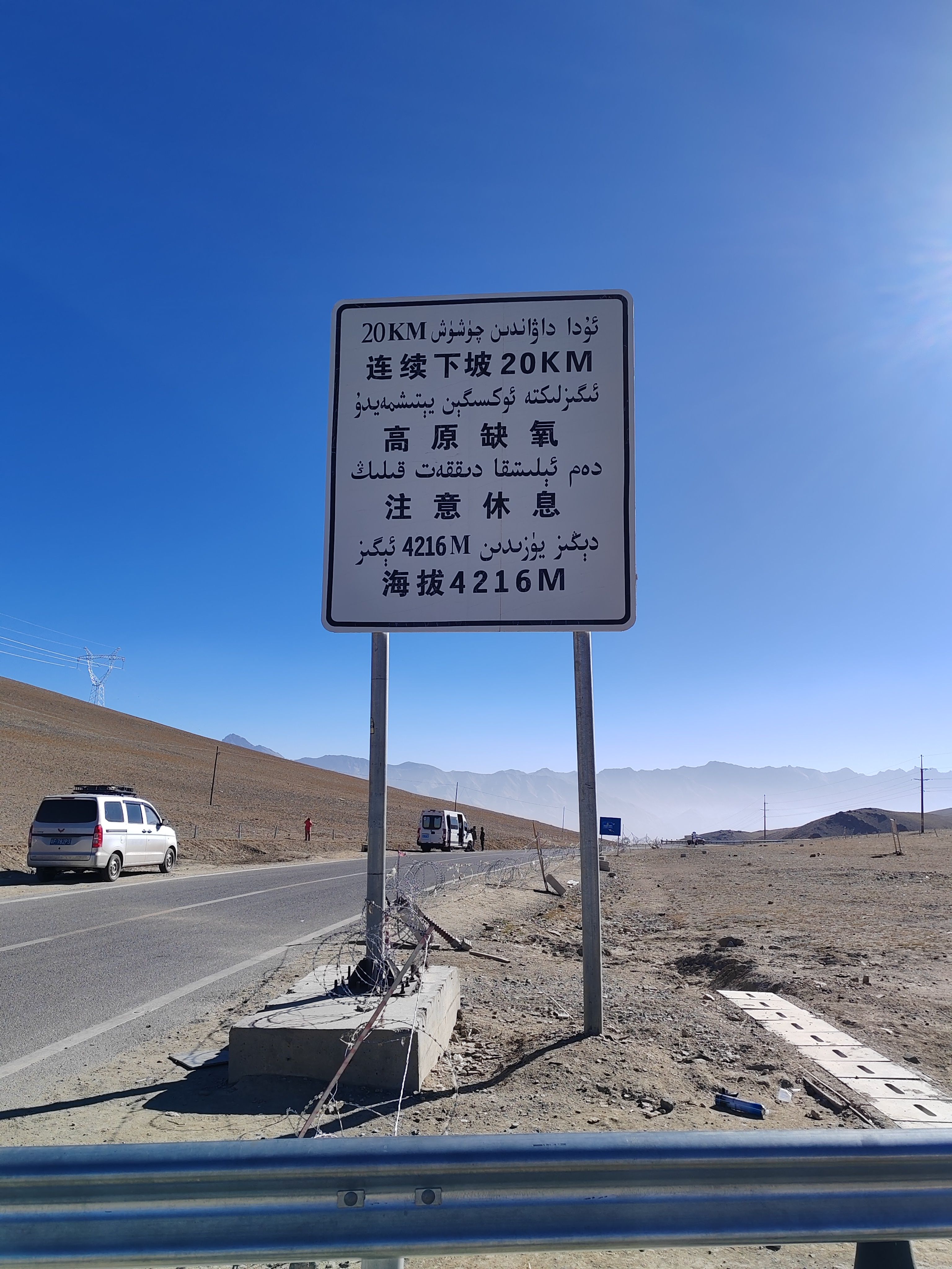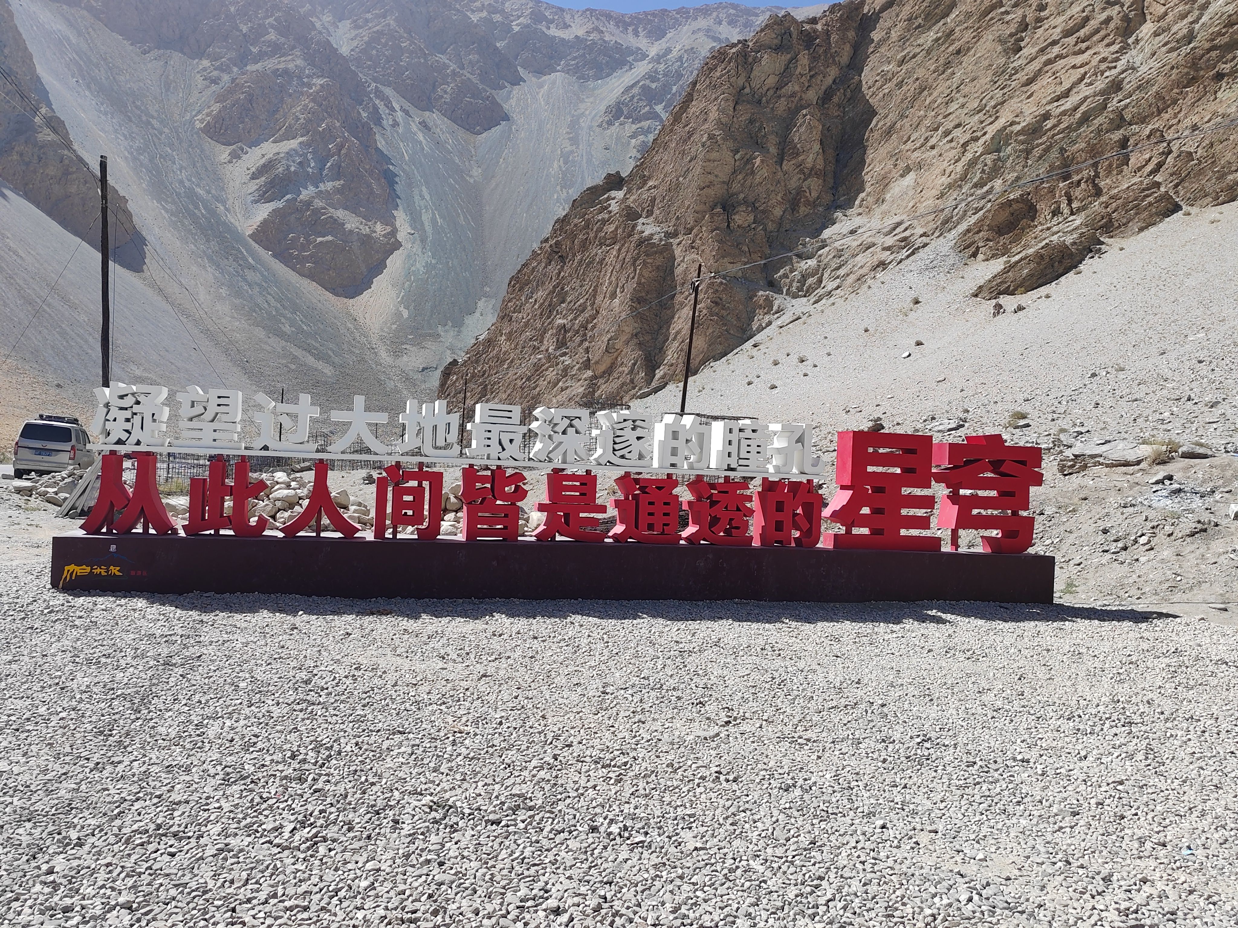 10点打的坐上塔县塔吉克族小伙的小轿车,行驶在国道314(中巴友谊公路)前行。20分钟到达盘龙古道游客中心,然后小轿车盘旋向上到山顶,下车后眼见有很多人向更高处游行。因我有点高原反应,感觉费力,未能上在最高处。停下来休息吸氧。景牌提示海拔4216米,帕米尔高原,注意安全!约20分钟汽车前行,蜿蜒曲折向下,走大盘龙、小盘龙到山脚瓦恰乡共600多个“S”弯路。盘龙古道总长75公里。行走这段路道使人感觉十分惊险刺激。然后小轿车又行驶在峡谷中塔莎公路上曲折前行。山谷中有广西壮族自治区援建的班迪尔蓝湖(水库)。湖水碧蓝,迎风荡漾,涟漪泛起。它与昆仑山脉冰雪景色交相辉映,非常壮观精美。继续前行在塔莎公路,到“昆仑山帕米尔之眼”景点打卡,“凝望过大地最深邃的瞳孔,从此人间皆是通透的星穹”横牌直立,十分醒目。向前仰视,昆仑山脉一处凹陷地方,直径近百米的巨型风蚀孔洞贯穿整座山体,阳光穿透时,在地面投下椭圆的光斑,恰似天神俯瞰人间的瞳孔。根据当地牧民传说,这是昆仑山神的瞭望台,能洞察世间善恶,庇护往来的旅人。