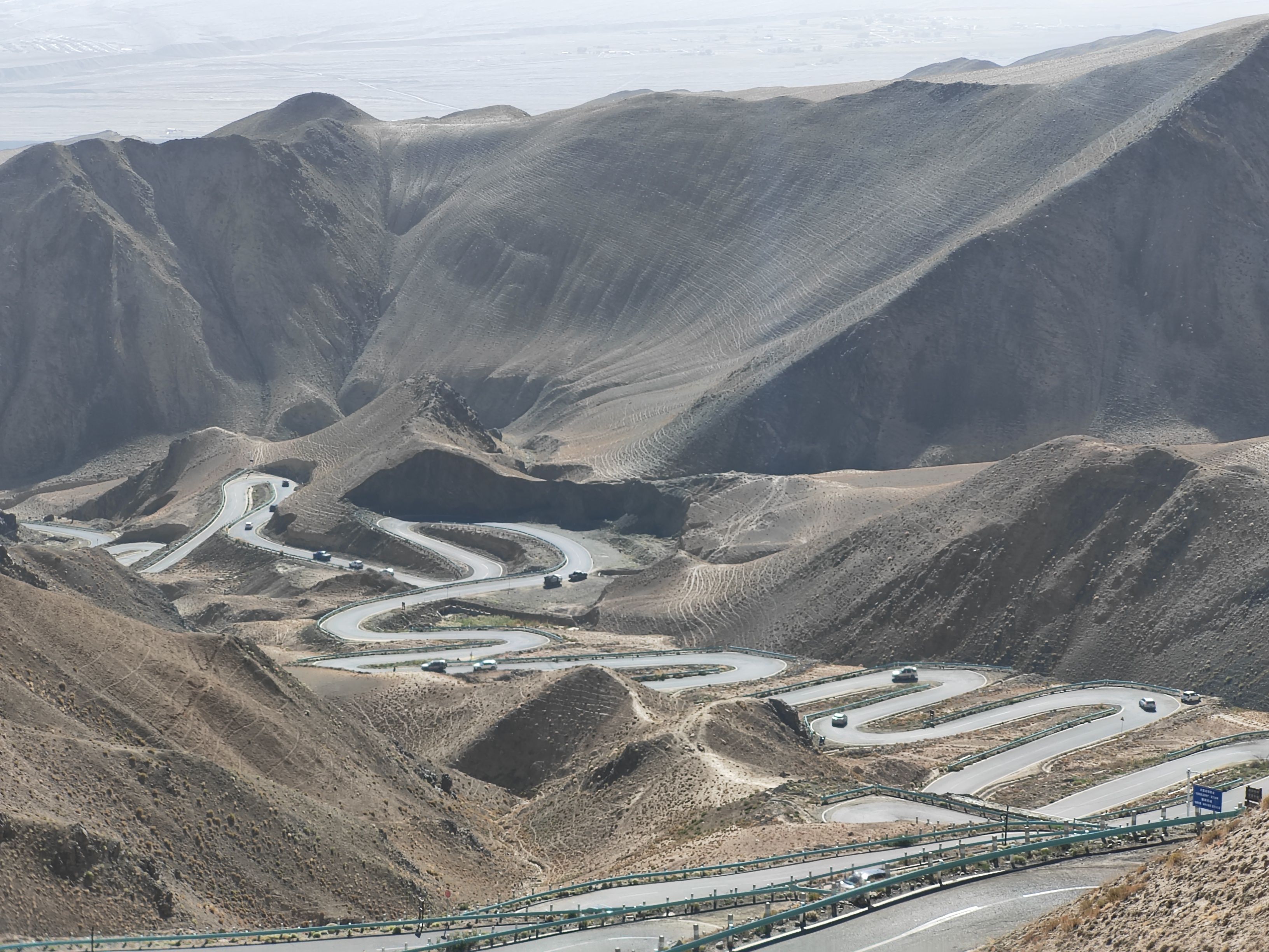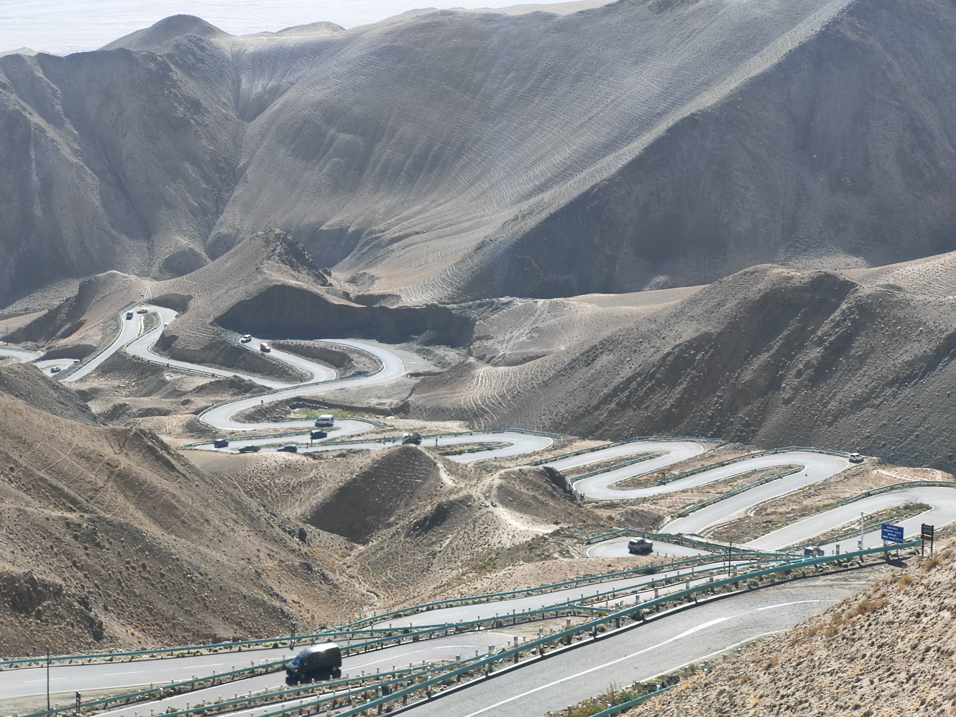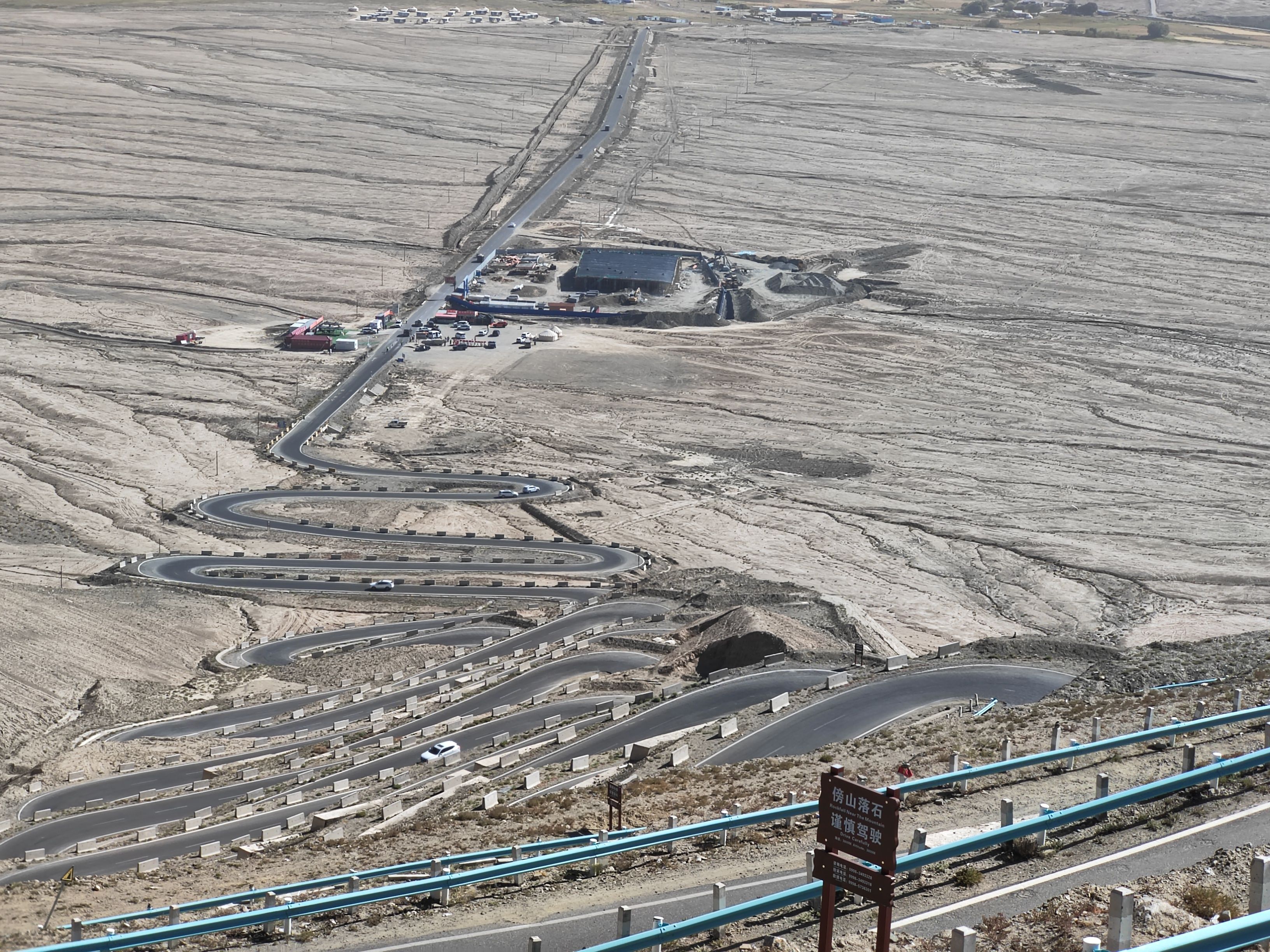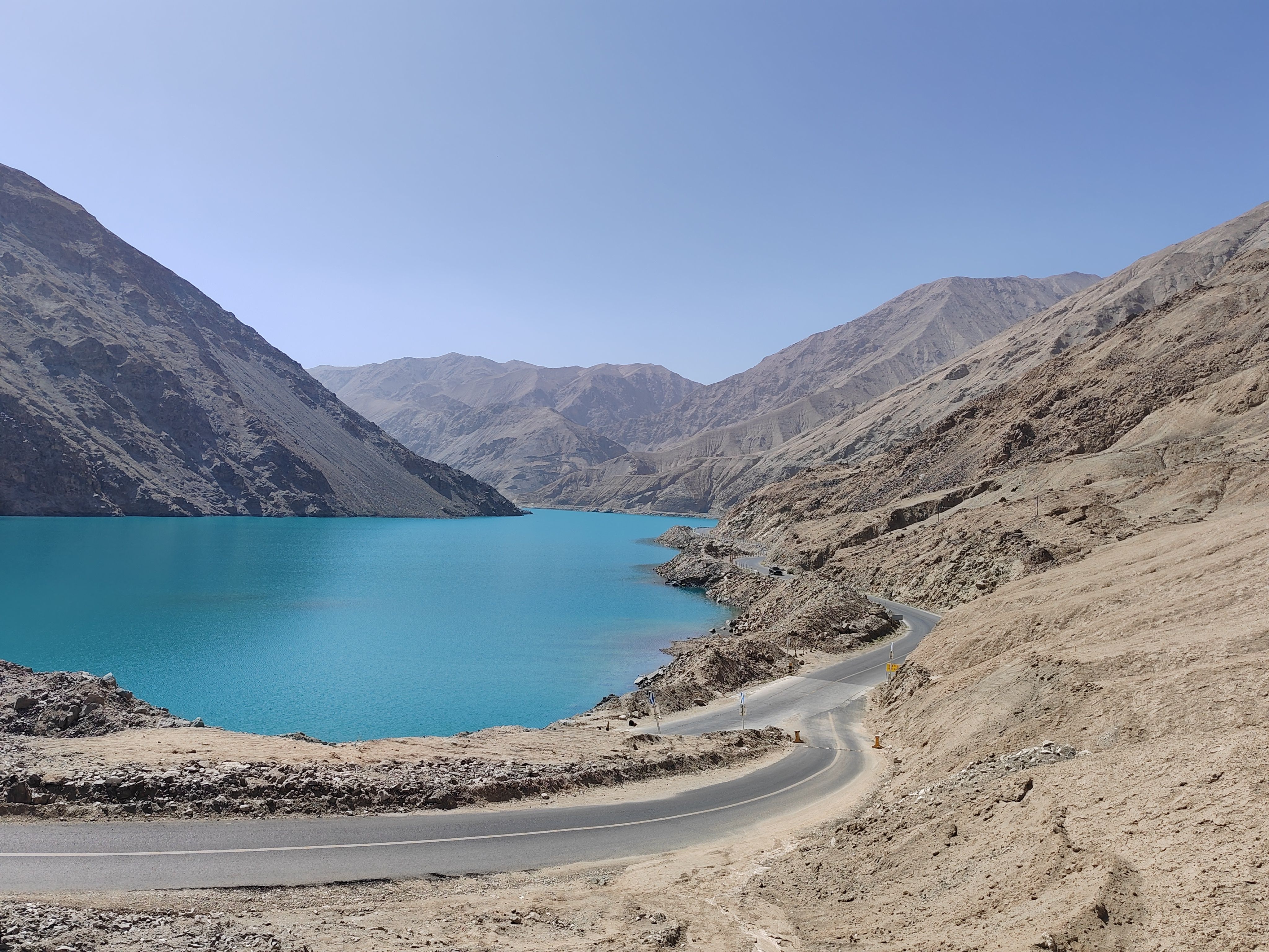 10点打的坐上塔县塔吉克族小伙的小轿车,行驶在国道314(中巴友谊公路)前行。20分钟到达盘龙古道游客中心,然后小轿车盘旋向上到山顶,下车后眼见有很多人向更高处游行。因我有点高原反应,感觉费力,未能上在最高处。停下来休息吸氧。景牌提示海拔4216米,帕米尔高原,注意安全!约20分钟汽车前行,蜿蜒曲折向下,走大盘龙、小盘龙到山脚瓦恰乡共600多个“S”弯路。盘龙古道总长75公里。行走这段路道使人感觉十分惊险刺激。然后小轿车又行驶在峡谷中塔莎公路上曲折前行。山谷中有广西壮族自治区援建的班迪尔蓝湖(水库)。湖水碧蓝,迎风荡漾,涟漪泛起。它与昆仑山脉冰雪景色交相辉映,非常壮观精美。继续前行在塔莎公路,到“昆仑山帕米尔之眼”景点打卡,“凝望过大地最深邃的瞳孔,从此人间皆是通透的星穹”横牌直立,十分醒目。向前仰视,昆仑山脉一处凹陷地方,直径近百米的巨型风蚀孔洞贯穿整座山体,阳光穿透时,在地面投下椭圆的光斑,恰似天神俯瞰人间的瞳孔。根据当地牧民传说,这是昆仑山神的瞭望台,能洞察世间善恶,庇护往来的旅人。