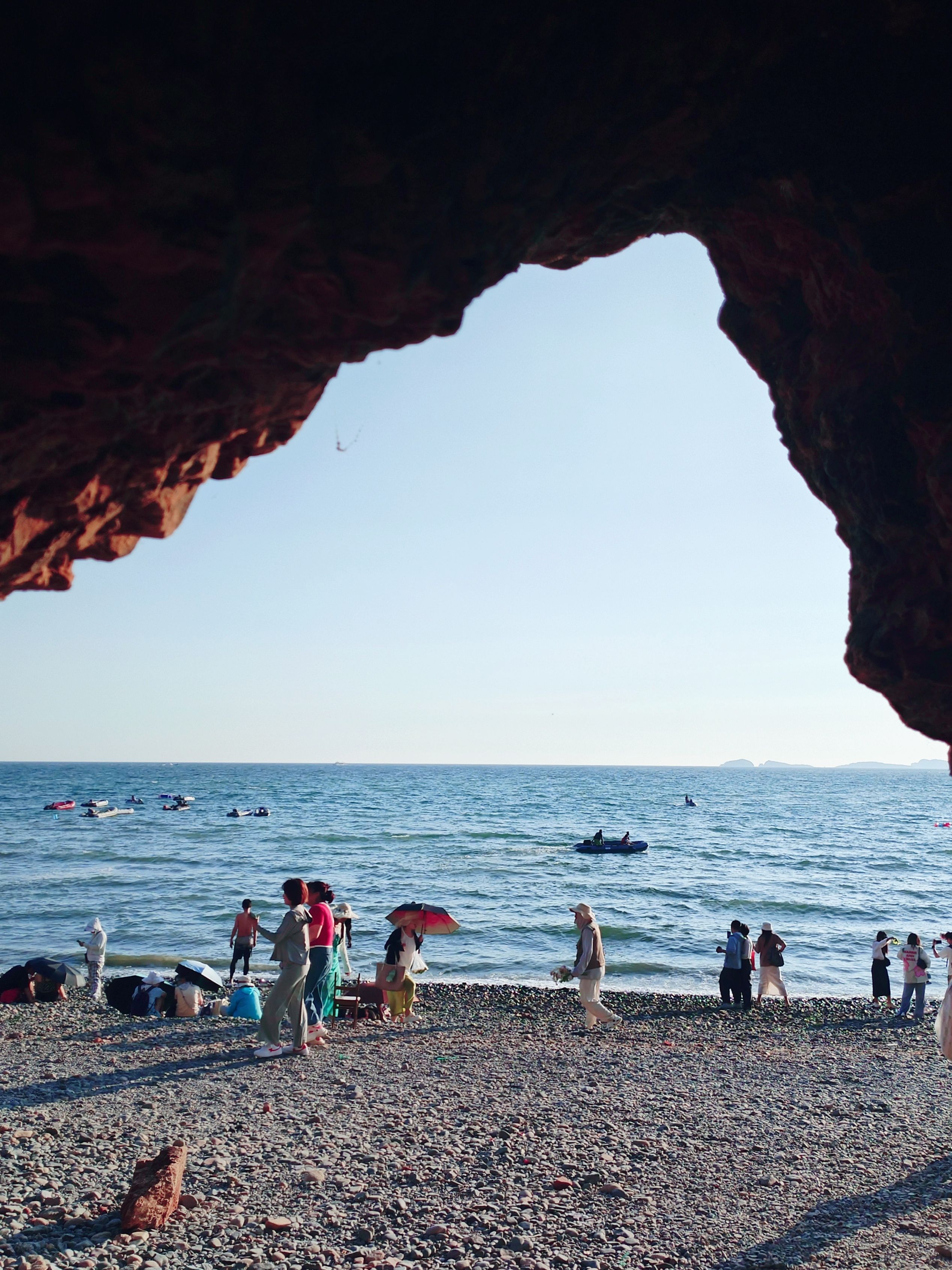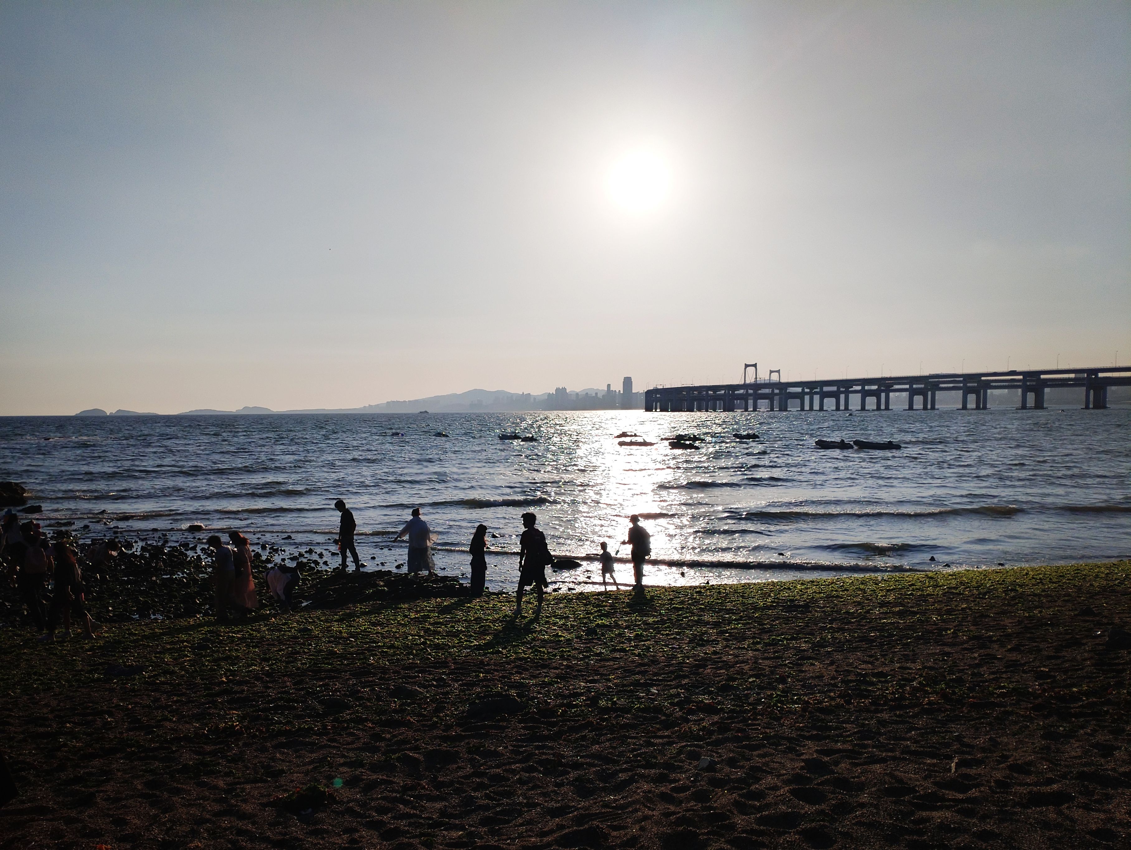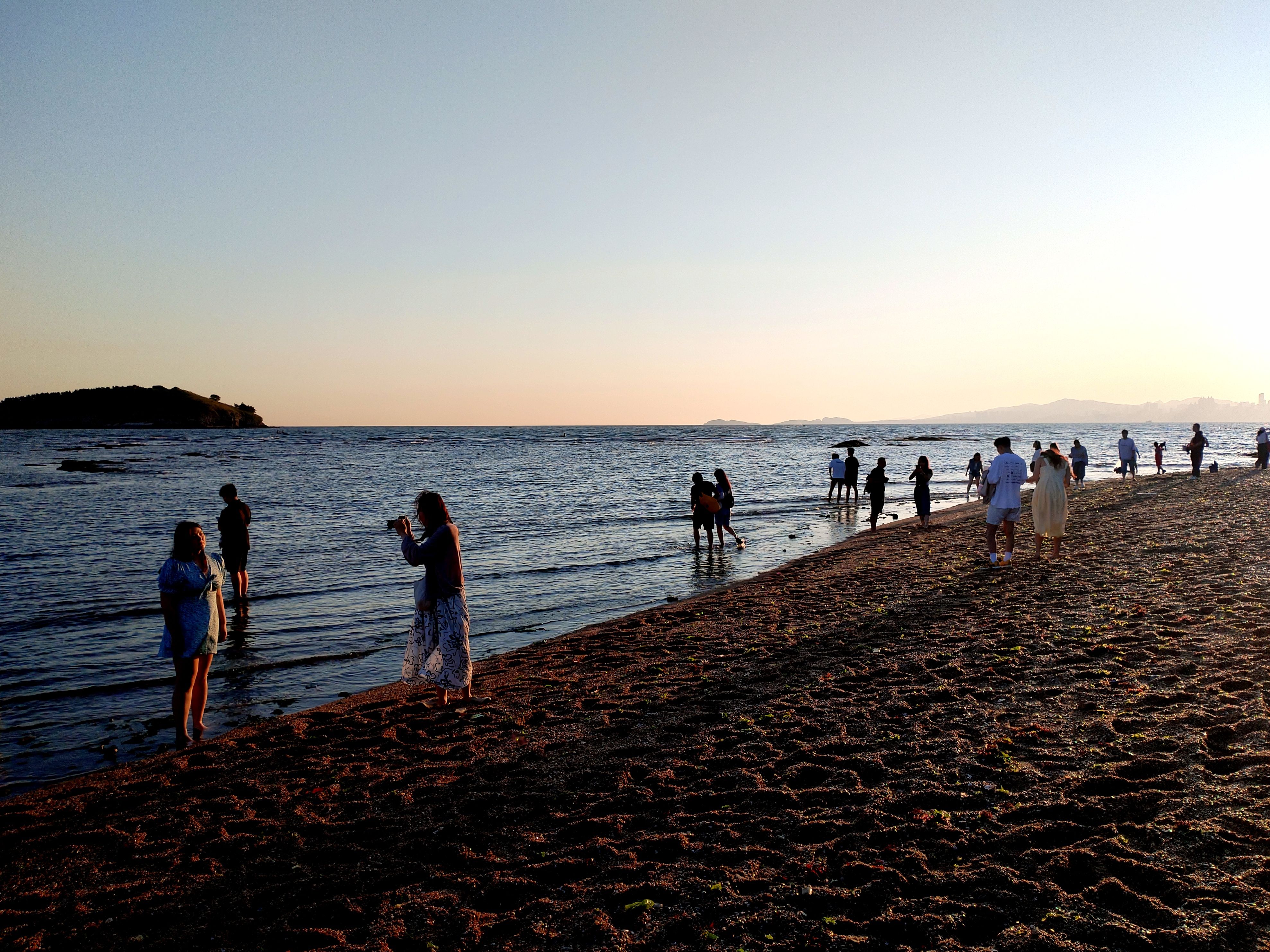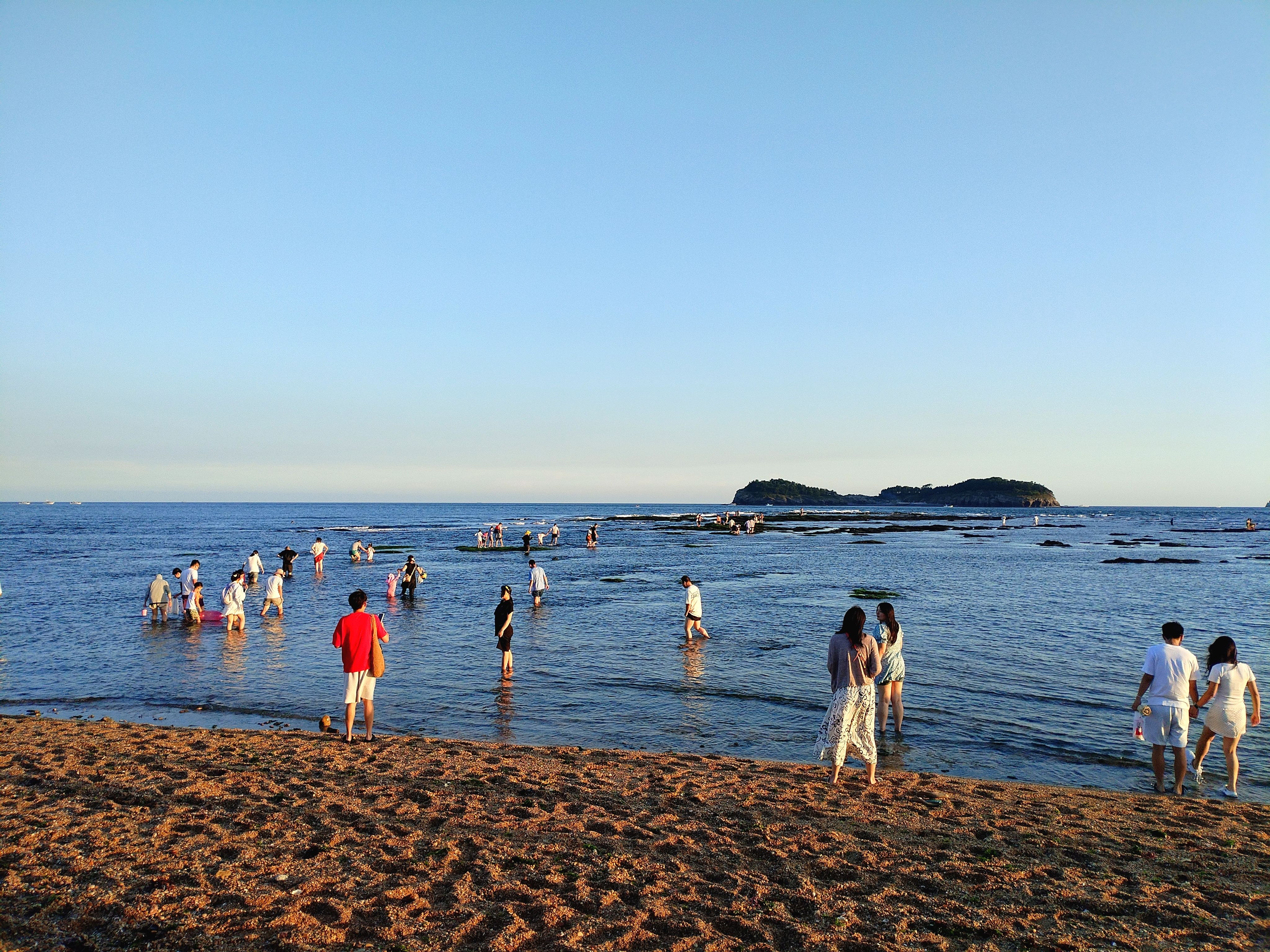 今天小潮,退潮的时候,海里的礁石在海面上露出了黑尖尖,海水沒过小腿的深度,人们踩着礁石向海的深处走去。。。不知是本地的市民还是外地的游客,有点担心他们,涨潮是很快的,未能及时回来,大概就要湿身了。