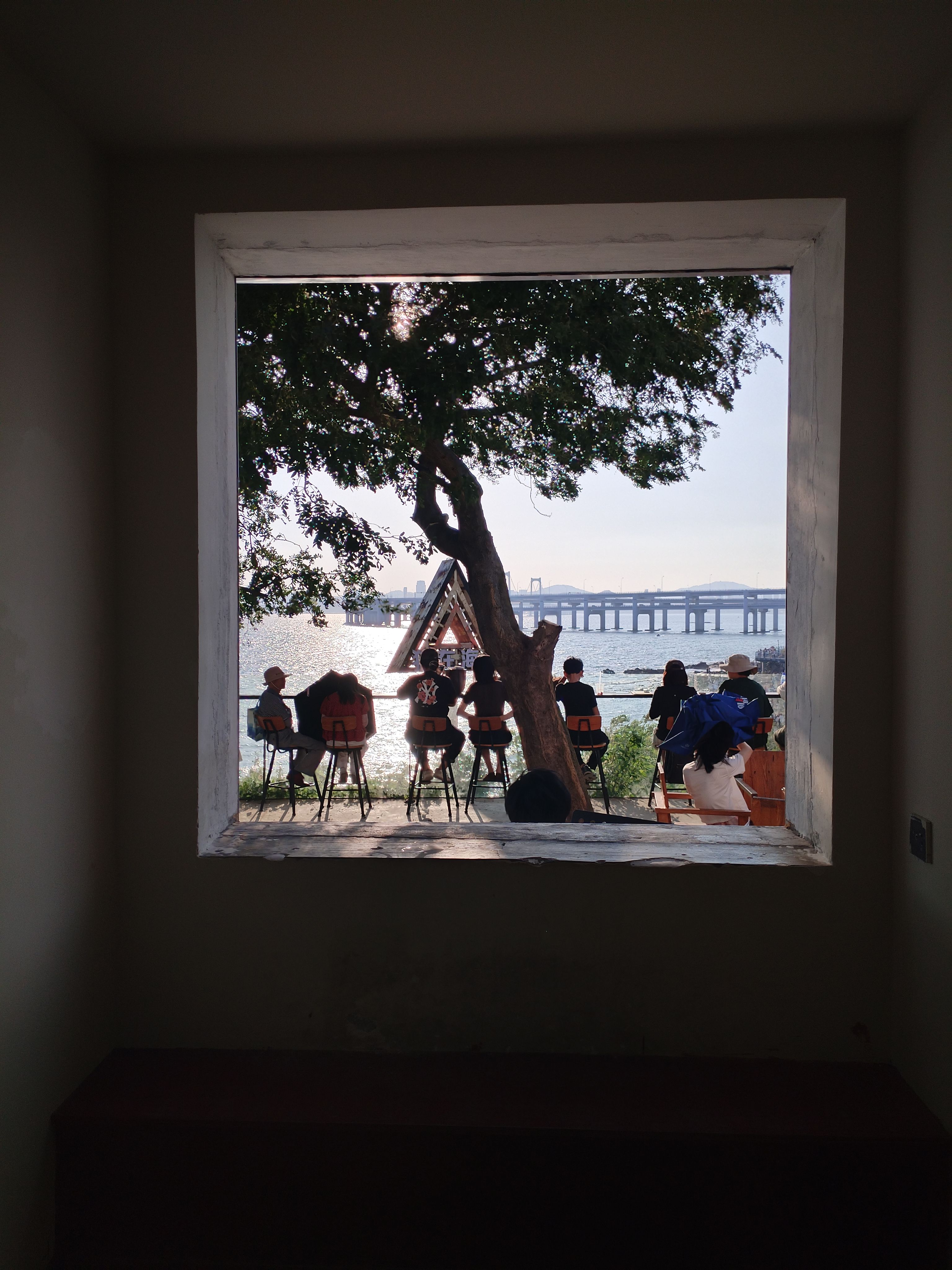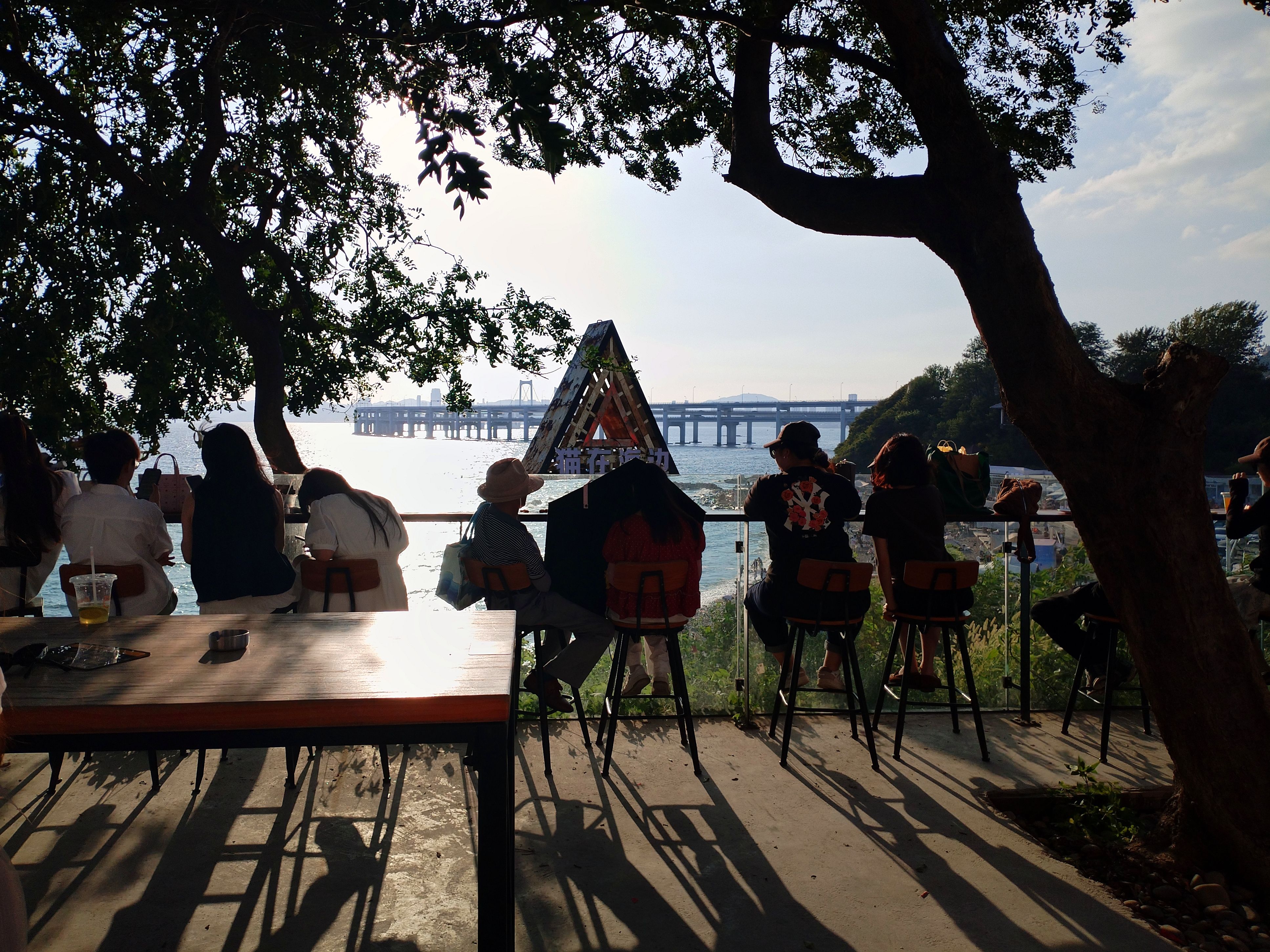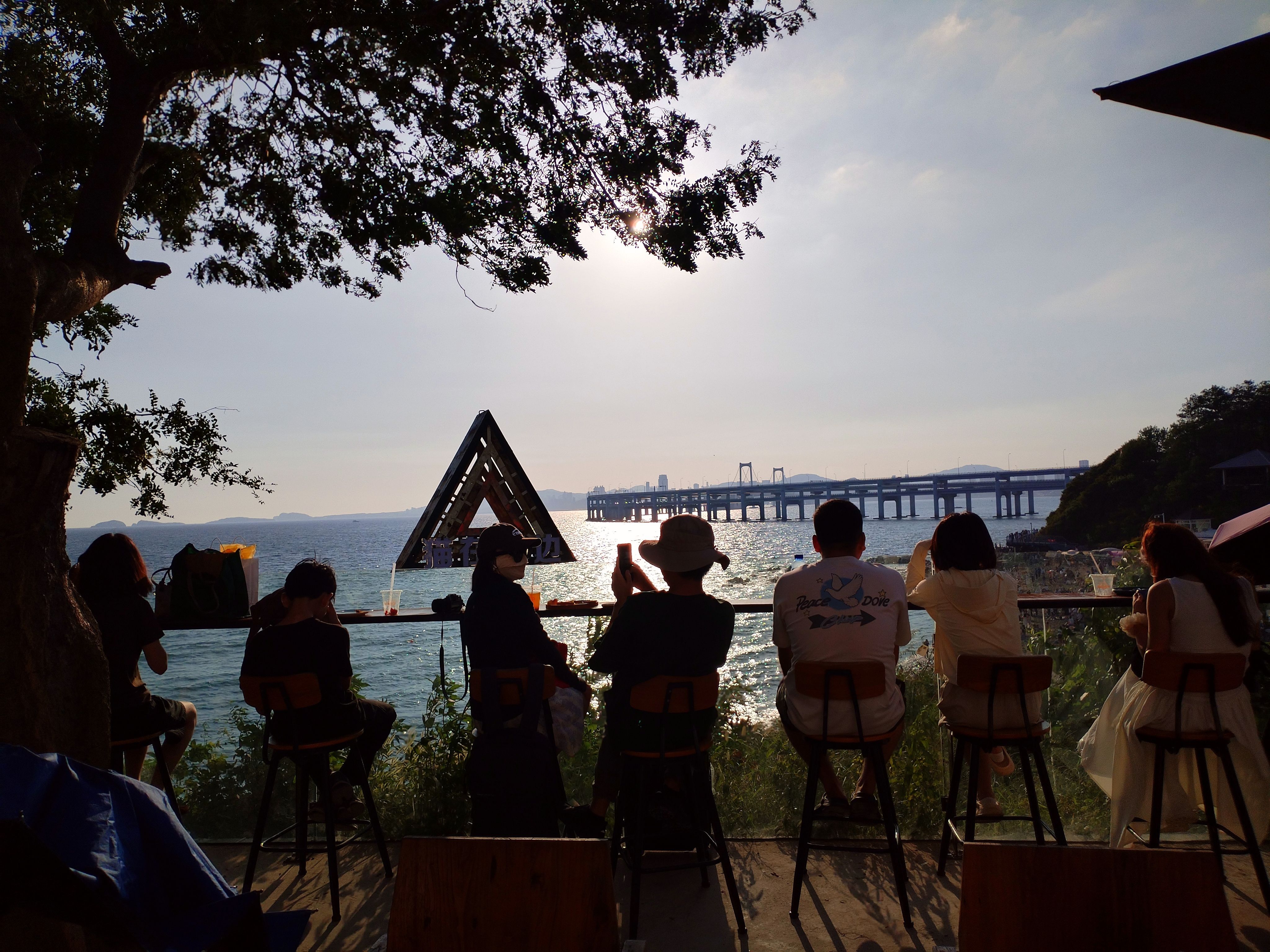 银沙滩观景台上开了一家咖啡店,“猫在海边”,猫(动词)在观景台上,吹着海风看夕阳,看风景的人在看你,你成了别人眼中的风景!咖啡店的窗户像是挂了一幅时刻变换着画面的油画!