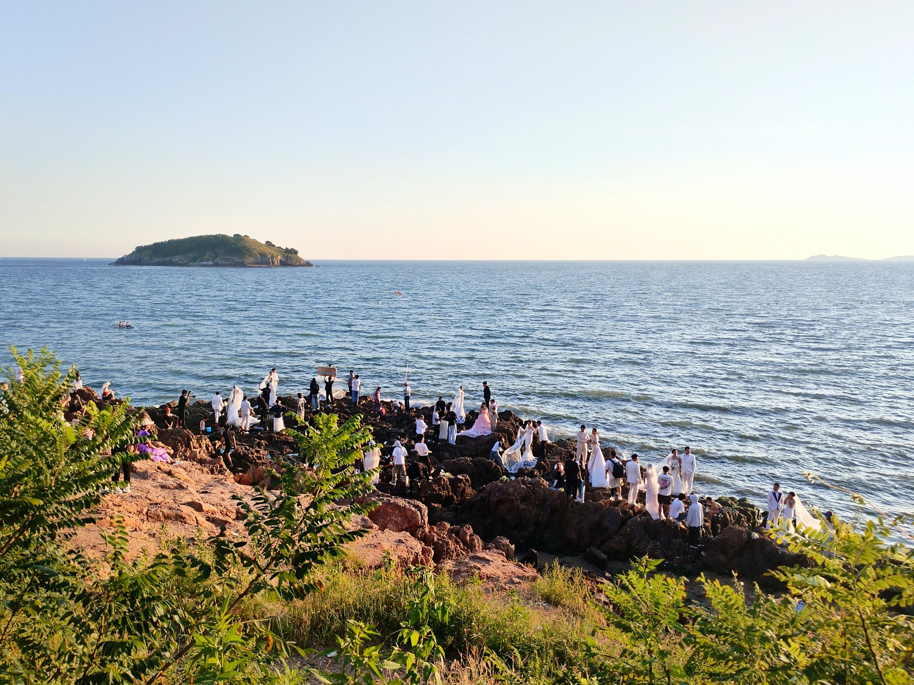 岸边一块大礁石上开满了拍婚纱照的新娘新郎,我数了一下,有十二对之多!