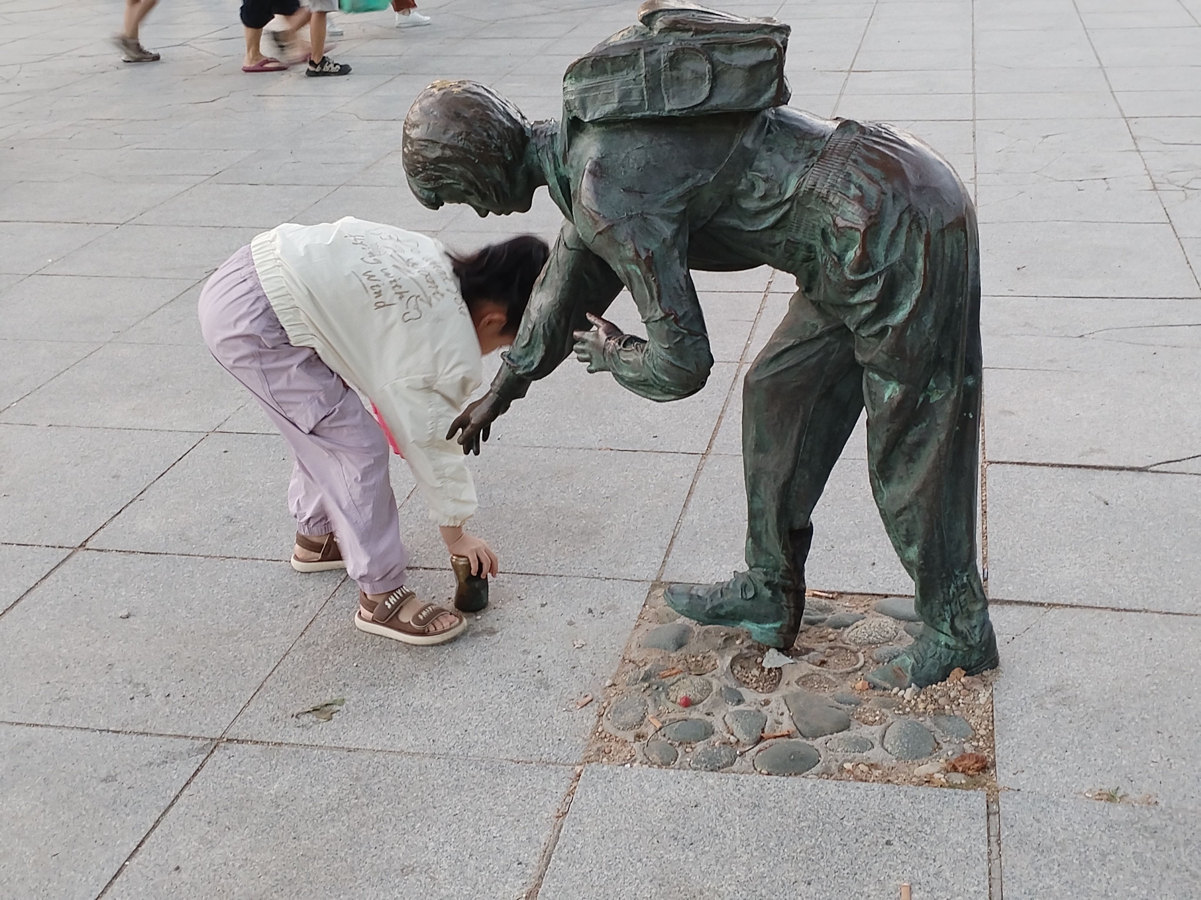 付家庄海边很多家长带着孩子们义务捡拾垃圾,保护我们美丽的环境!岸边有一个雕塑,是一个学生伸手捡地上的易拉罐。一个4、5岁的小女孩走到雕塑旁,以为易拉罐是谁随手扔的,想去捡起来扔垃圾桶,没拿起来,使了使劲,还是没拔起来,可爱、有趣又感动,为孩子点赞!