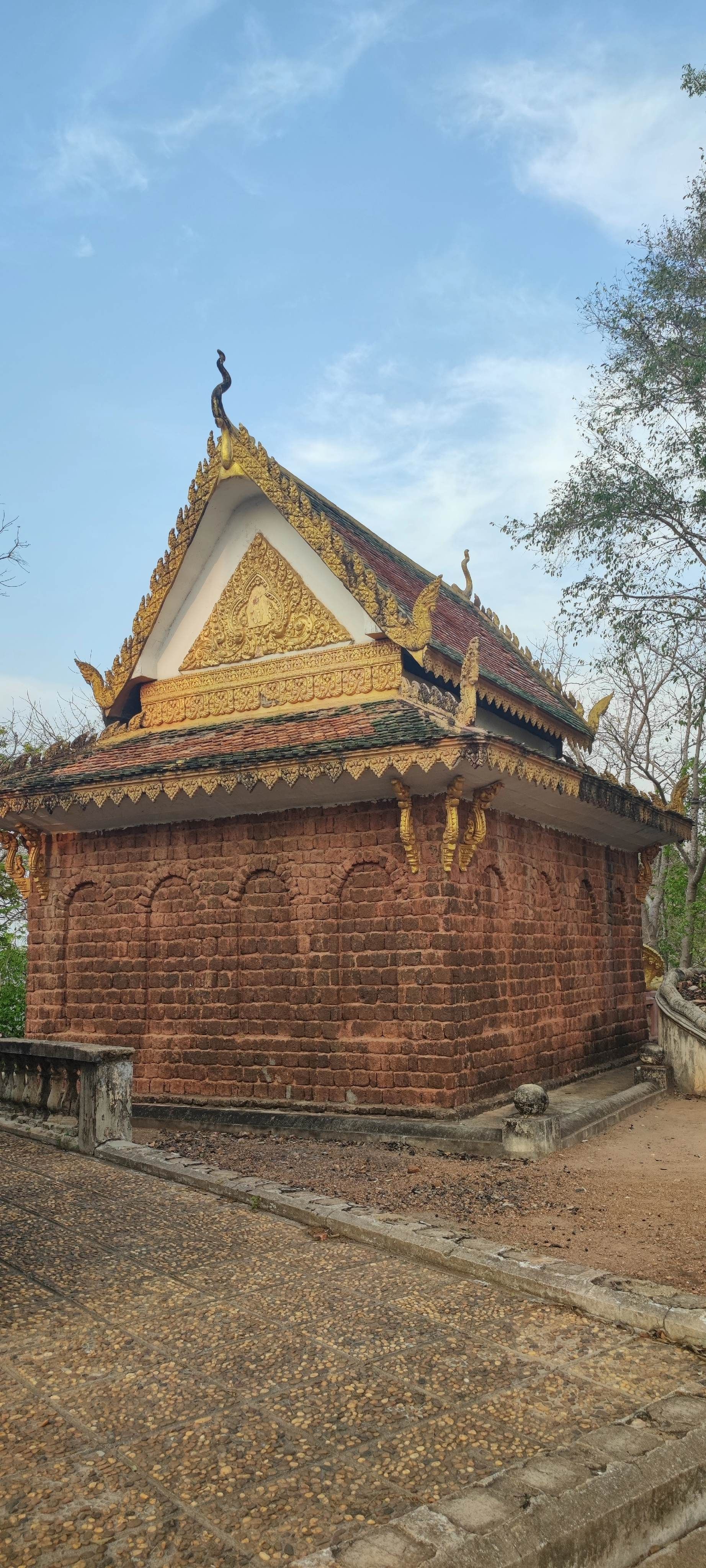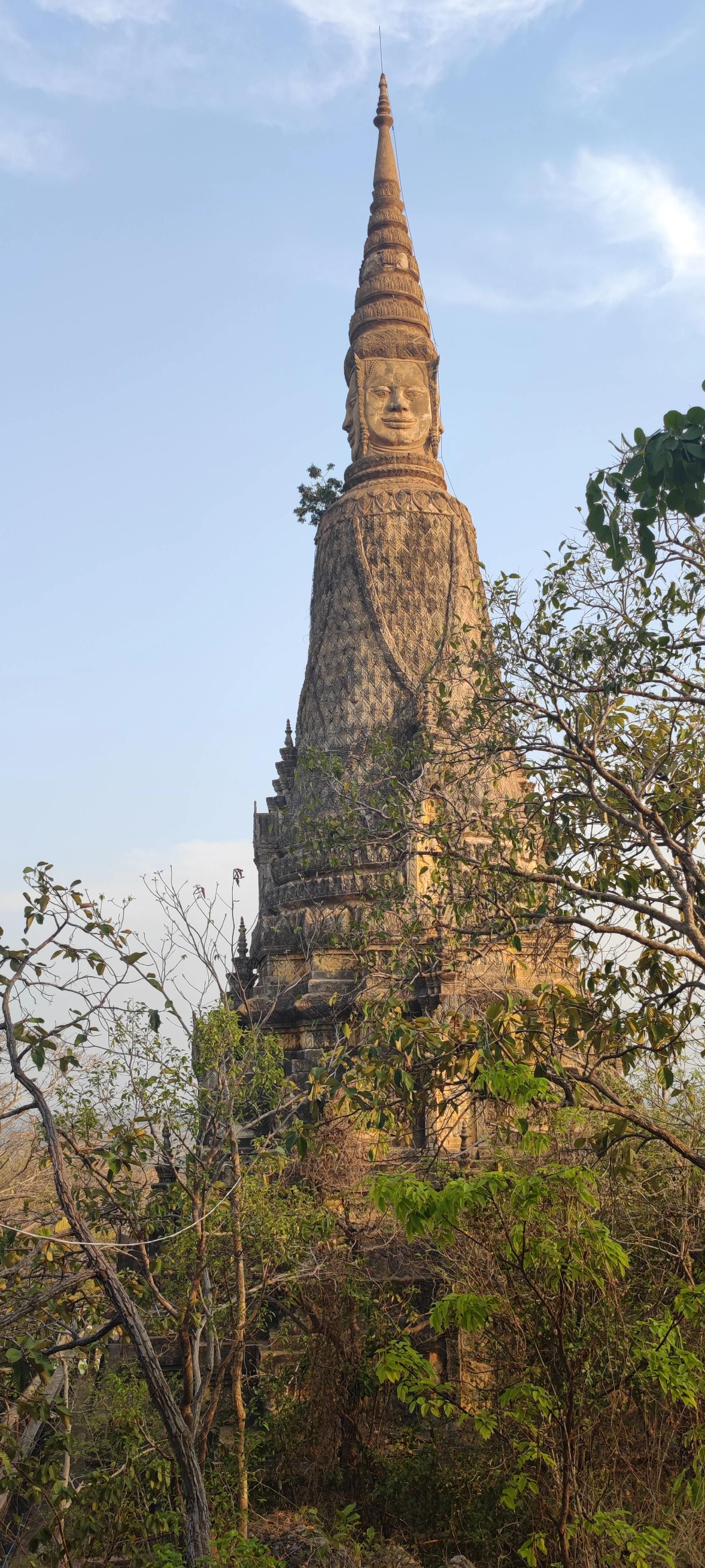 沿着青苔斑驳的台阶攀援,每一步都踏过历史的褶皱。山腰处,**三座巨型坐佛**面朝东方,虽在红色高棉时期遭损毁,残存的石像仍透出慈悲庄严。当地信徒至今在此焚香祈祷,将金箔轻轻贴附佛身,让信仰在伤痕中重生。山顶的**Chhrouh Chet寺**保留着殖民时期的法式拱门,东西方文明的碰撞在此凝固成独特的剪影。