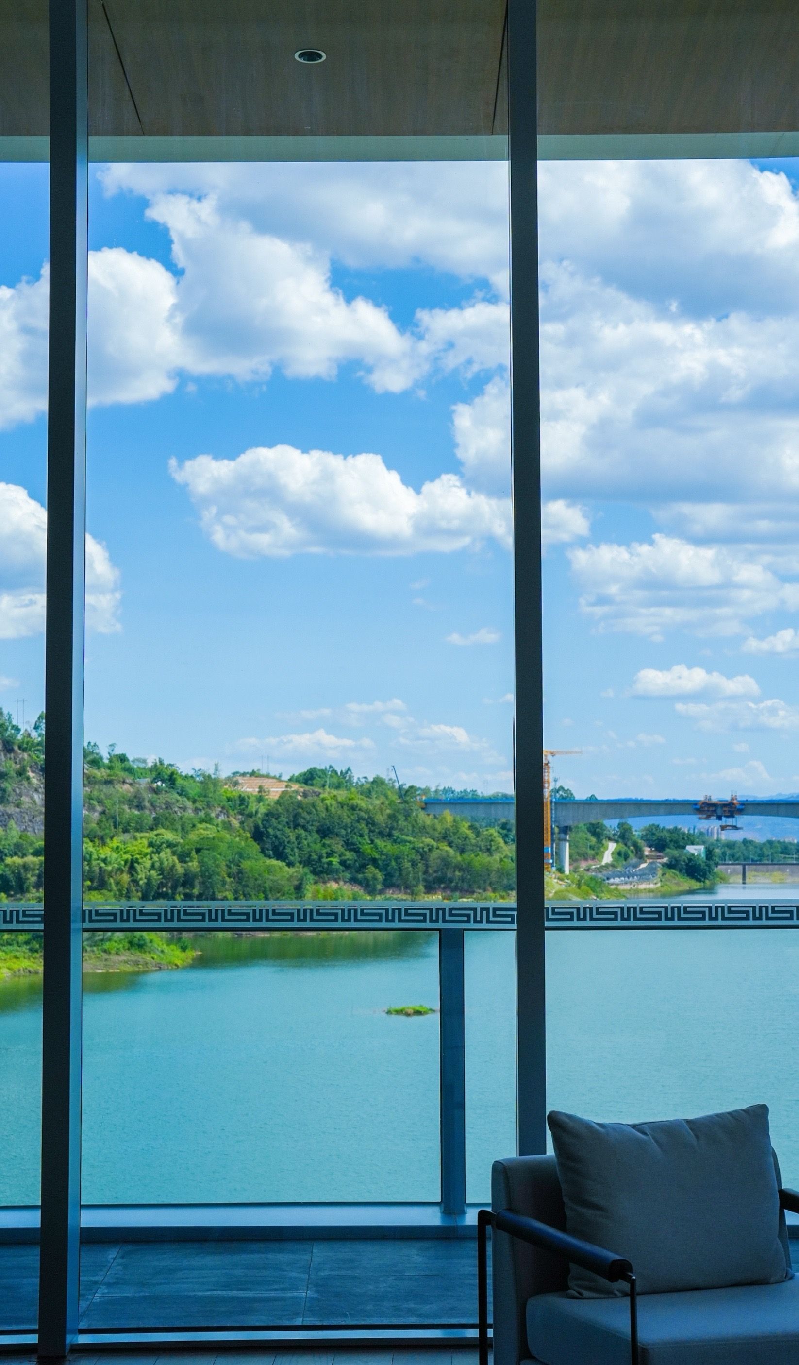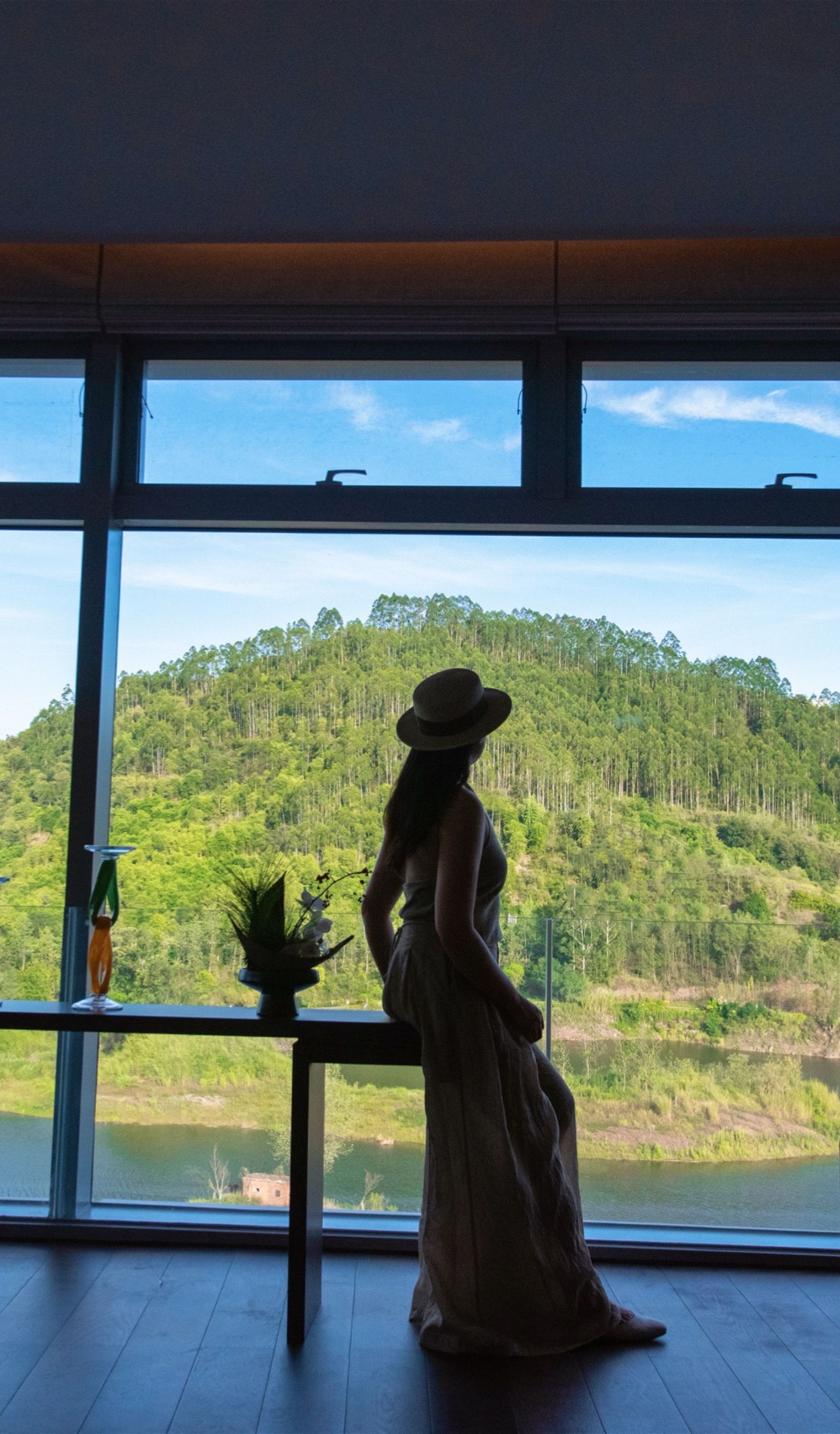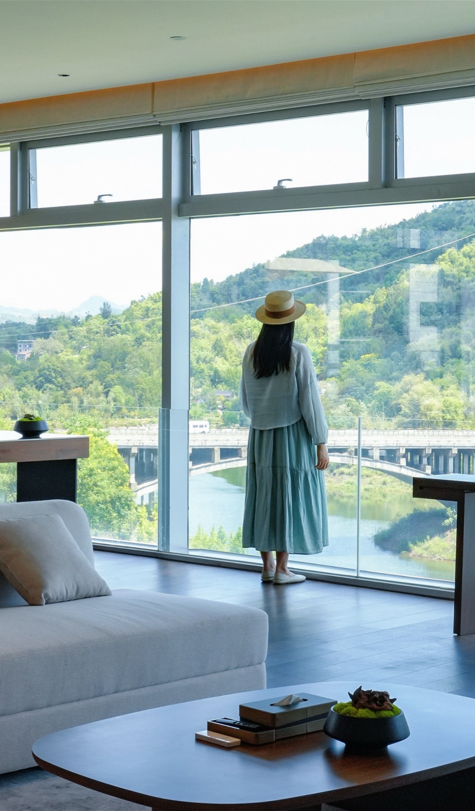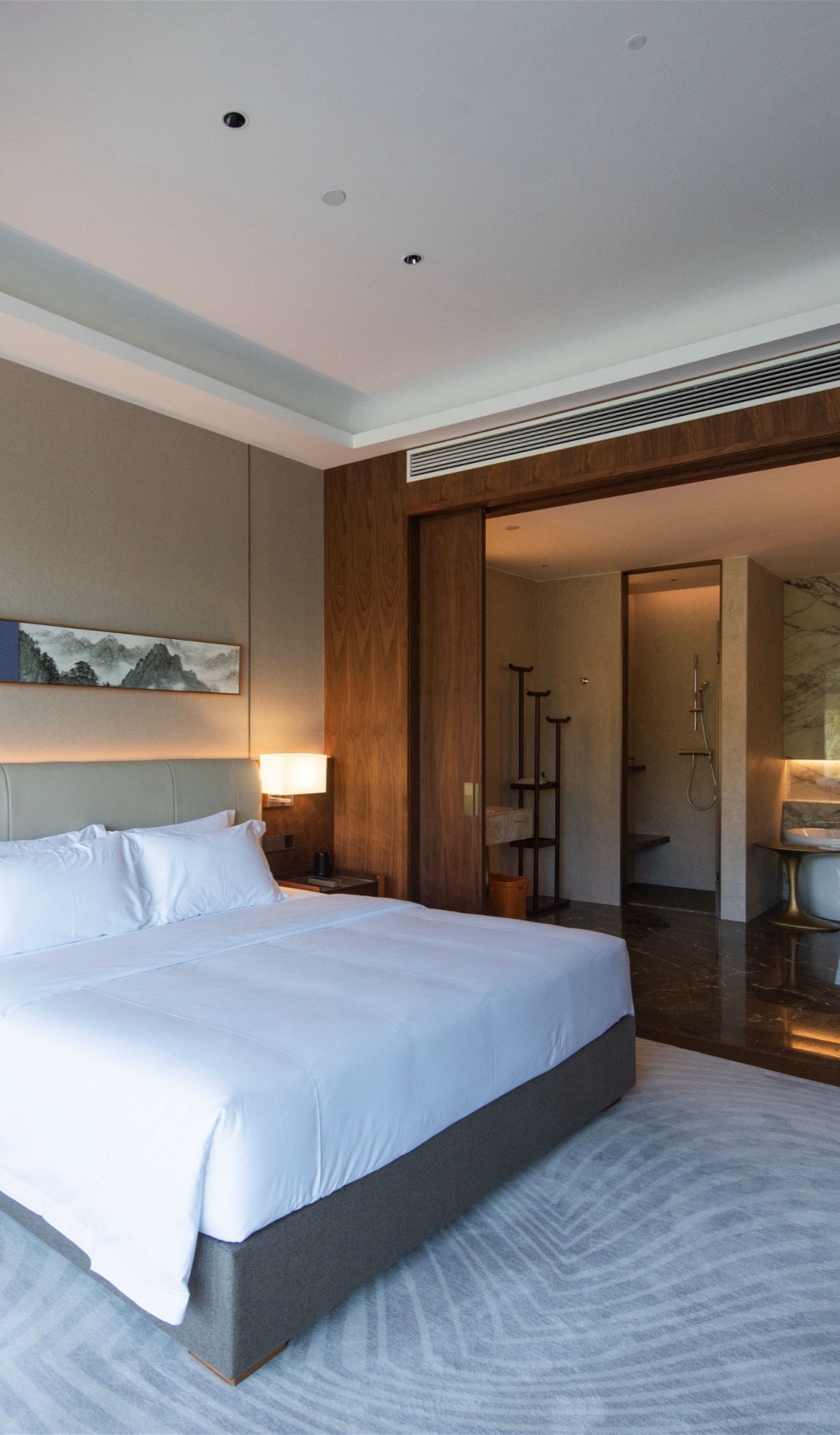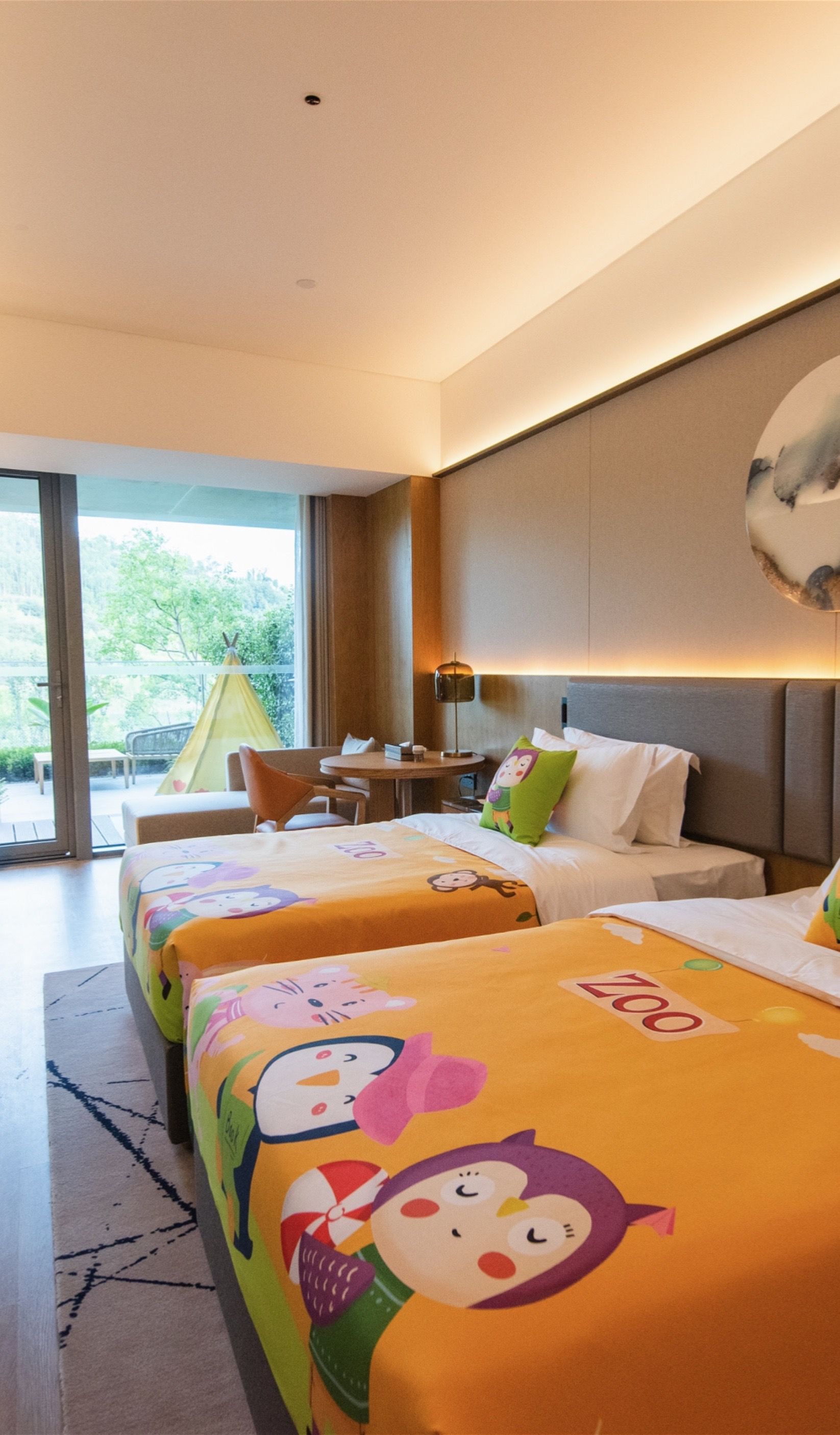 95%以上的房间配备揽景阳台、露台或花园。我们入住的湖景行政套房正好俯瞰整个慧谷湖,湖光山色触手可及,宛如置身于天然水墨画中。房间内采用了先进的智能系统,从灯光调节到窗帘控制,一键即可实现便捷操作。全套科勒卫浴更显品质,细节处处体现着科技与美学的融合。清晨从鸟鸣中自然醒来,推开落地窗,湖面氤氲着薄雾,宛若仙境。看日出慢慢的从山间升起,一点点染金湖面,让整个人的心都变得宁静了。亲子出行的话也可以选一楼的特色亲子房,明亮活泼的主题设计与玩偶布置,定能赢得小朋友的欢心。