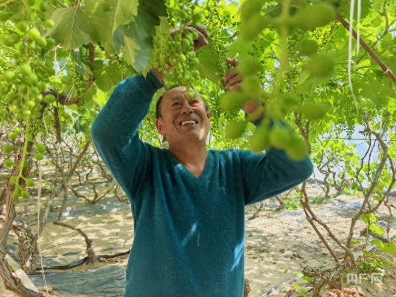 种植户徐援朝打理已经成串的葡萄(央广网记者 邵玉琴 摄)