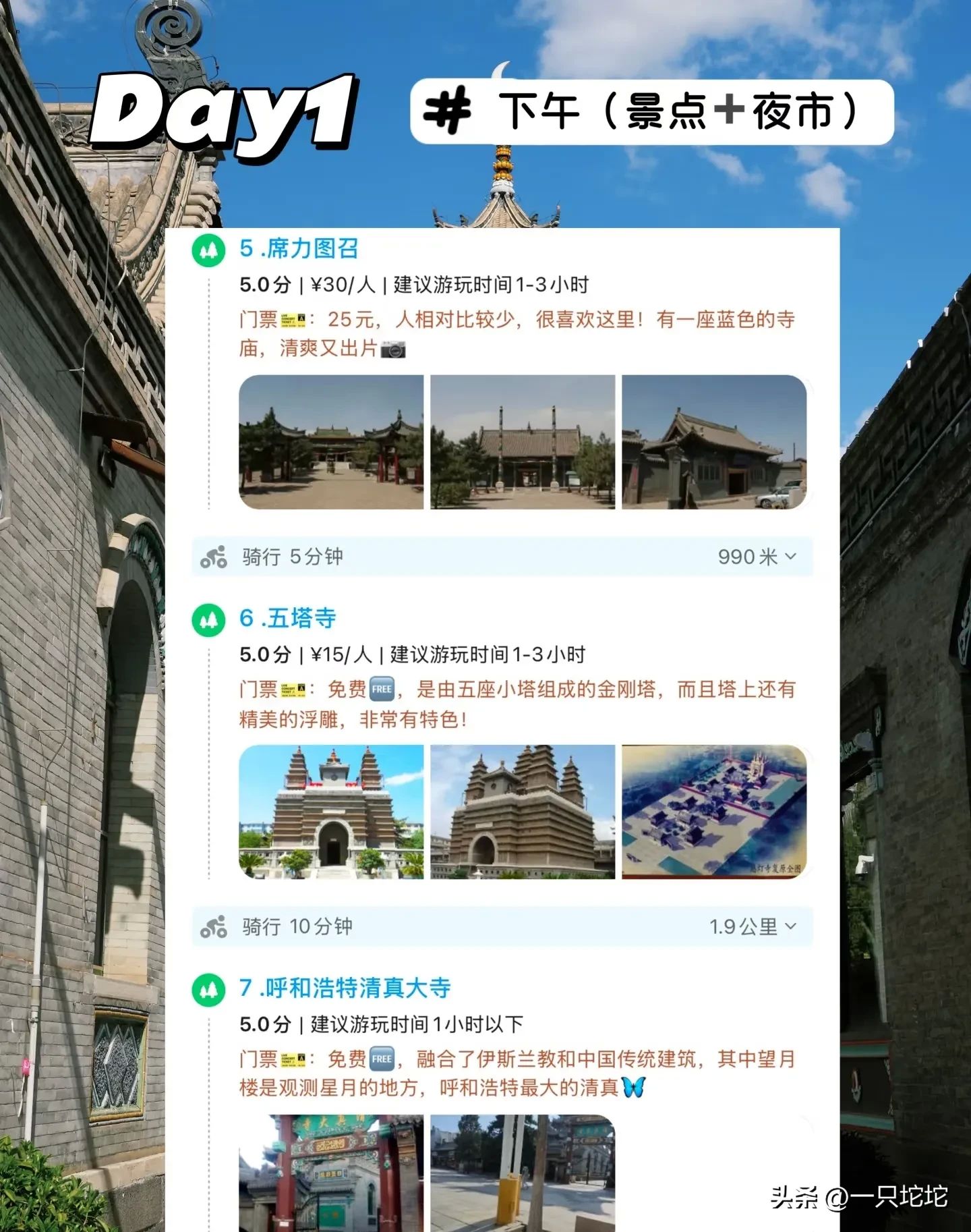 下午打卡五塔寺,那精美的琉璃砖和独特的建筑造型,绝对会让你惊叹,尤其是蒙文天文图石刻,神秘又震撼,感觉像是打开了古代天文学的大门。接着去清真大寺,白色的建筑在阳光下格外圣洁,独特的伊斯兰风情扑面而来。最后到转角巷,这里充满了文艺气息,街头巷尾都是呼和浩特的生活百态,走在里面,整个人都放松下来。