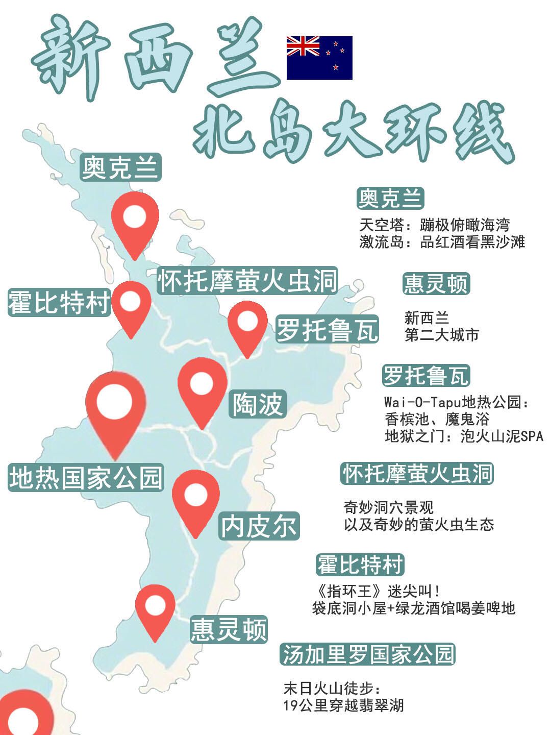 奥克兰(天空塔蹦极、激流岛品酒看黑沙滩)怀托摩萤火虫洞罗托鲁瓦(地热公园、火山泥SPA)霍比屯汤加里罗国家公园(徒步、滑雪)惠灵顿……一路惊喜不断