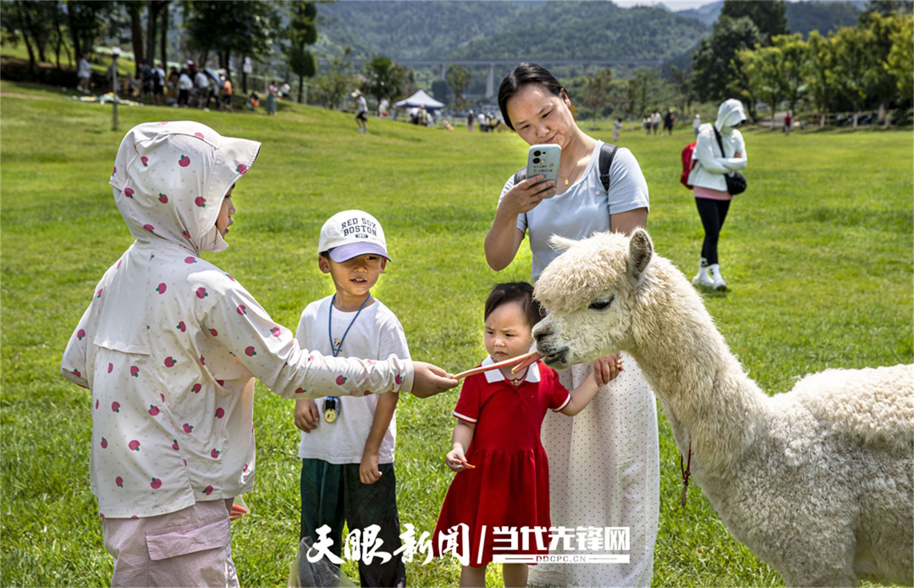 在小镇的核心区域羊驼牧场里,100多只羊驼分成几队轮流“上岗”,有的温顺地伸长脖子接过小朋友递来的饲料,有的甩着蓬松的尾巴在草地上踱步,引得相机快门声此起彼伏。