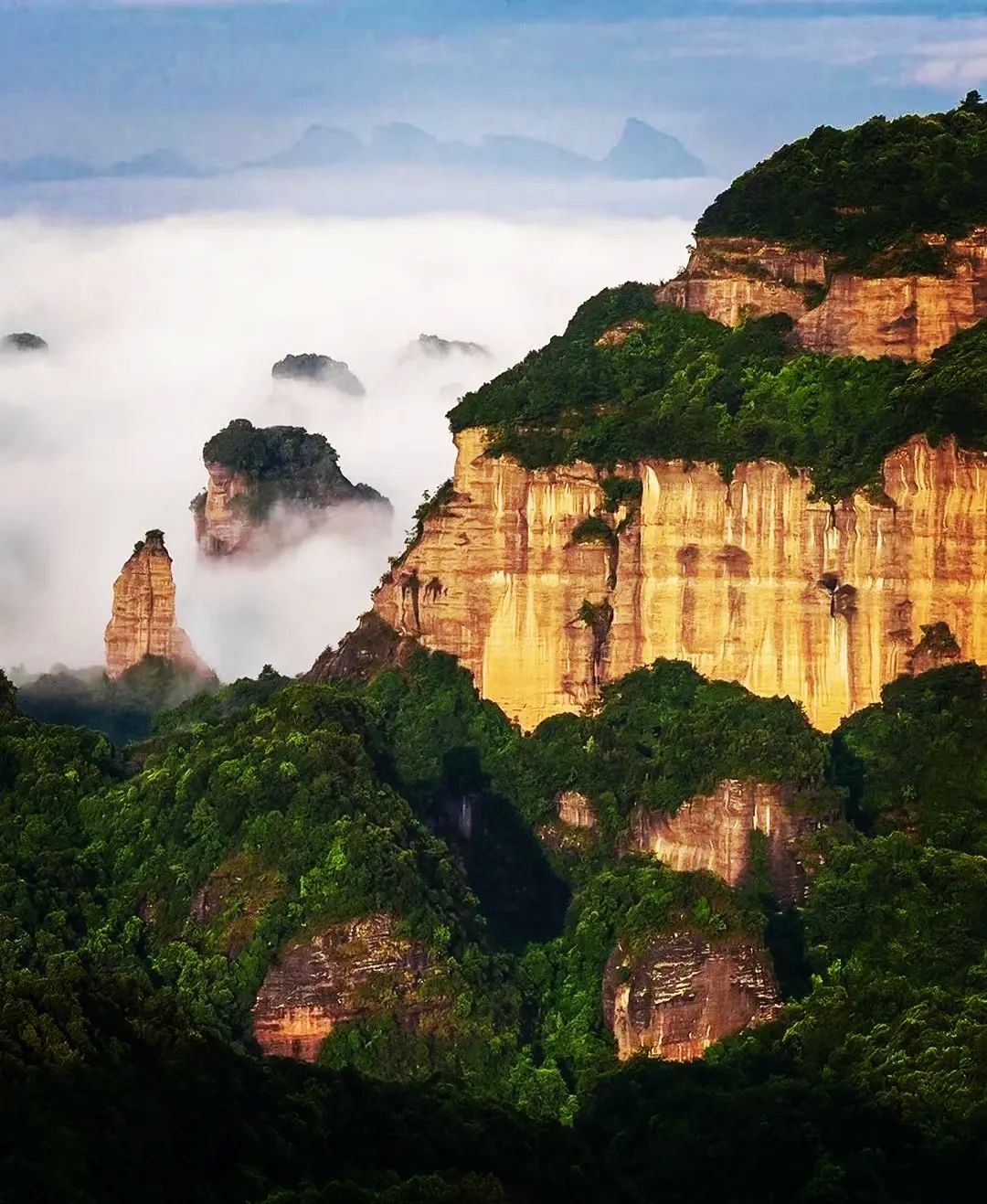 1、丹霞山:必游!必游!这里以丹霞地貌闻名,山势险峻,景色瑰丽,拥有众多奇石怪峰,清晨时分,山间云雾缭绕,仿佛置身仙境,雨后的丹霞山,更是超级出片,像是一幅天青色山水画。