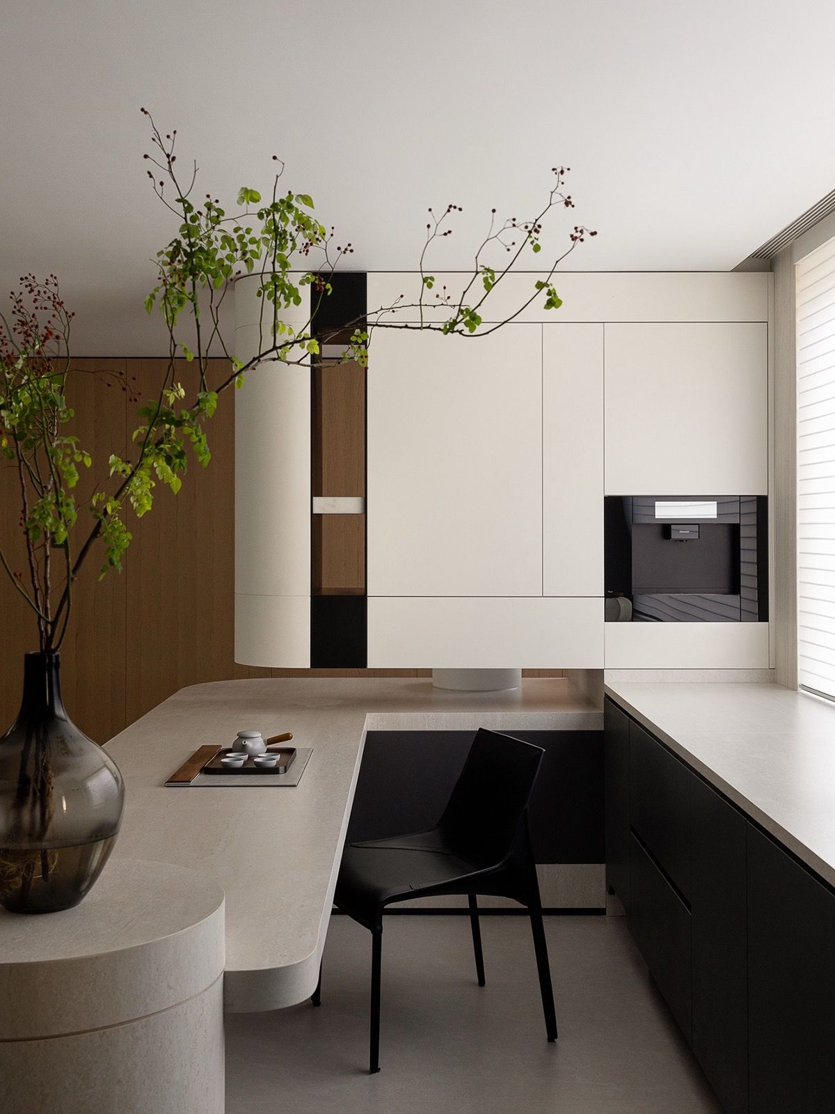 岩板,遇上温润细腻的原木木饰面。一冷一暖,一刚一柔,不同材质的交织就是高级感的密码。极简却不冰冷,满满都是家的温度。