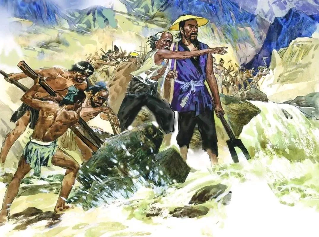 不过,禹可是个有担当的人。他心里想着父亲鲧的悲惨结局,决心要吃苦耐劳,殚精竭虑地治水。他带着测量工具,登高山、立标志,跑遍了九州,测量地形。无论是酷暑还是寒冬,雨雪泥泞,他都毫不退缩,日夜奔波。为了治水,他三次路过自己家门,甚至听到刚出生的儿子在哭,也不敢进去看一眼。为了百姓,他宁愿自己吃得简单、穿得朴素,反而把大把的银子花在水利工程上。