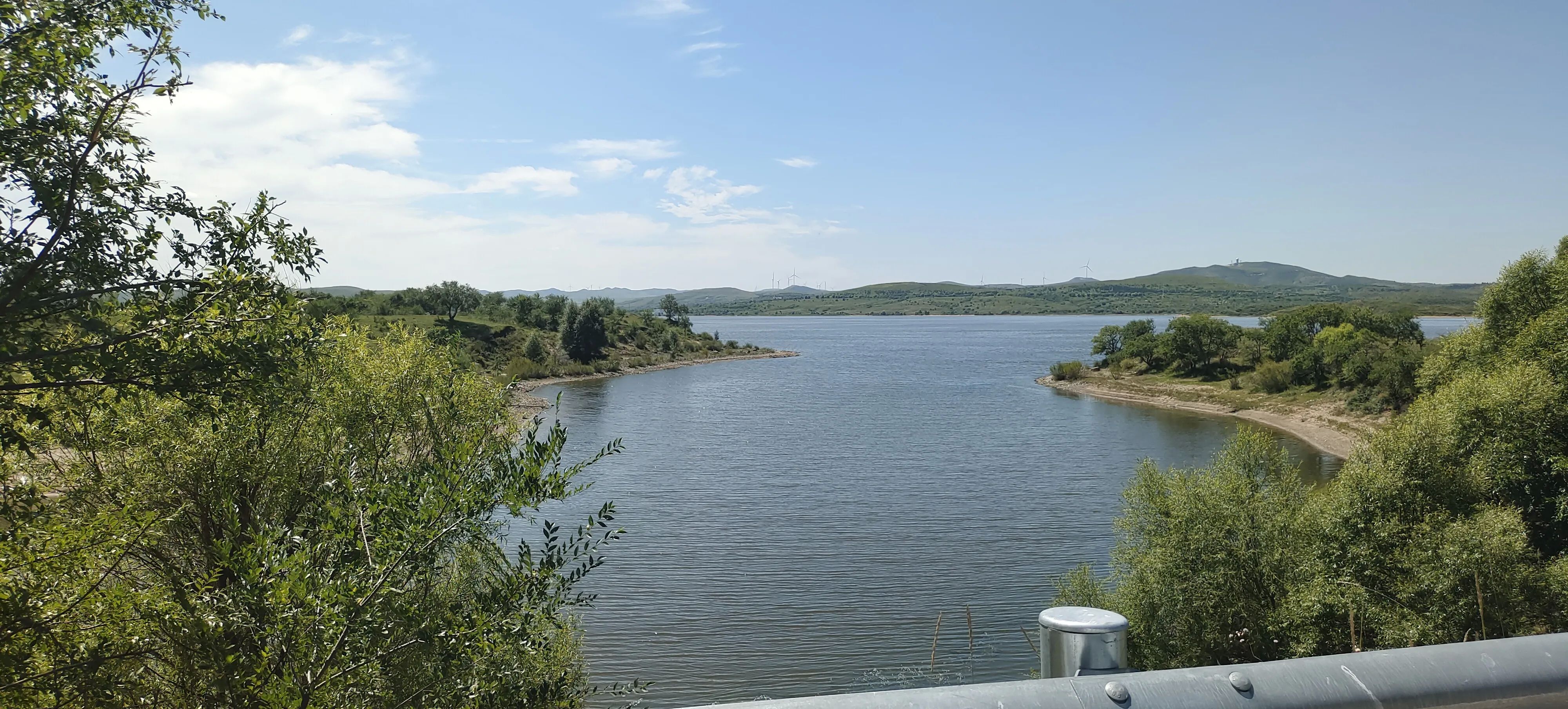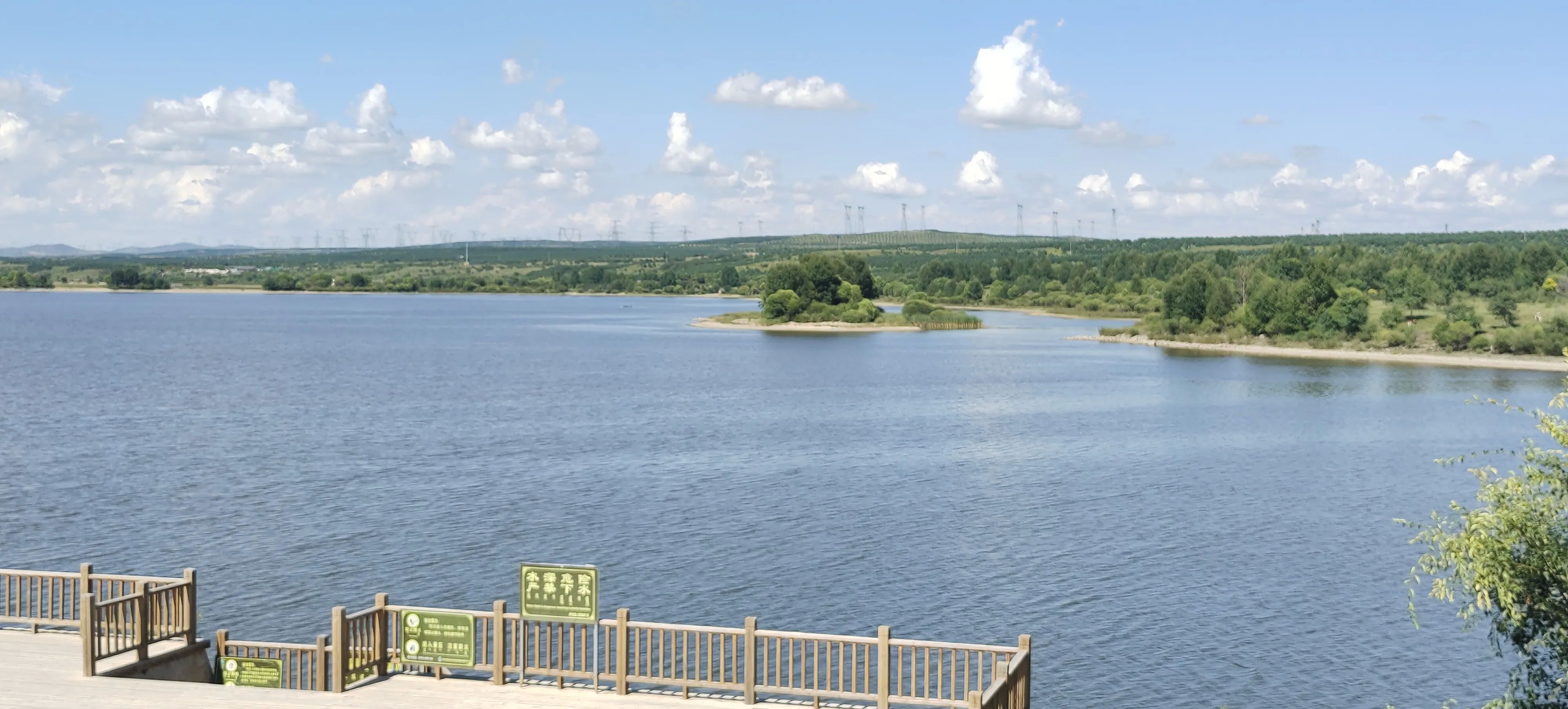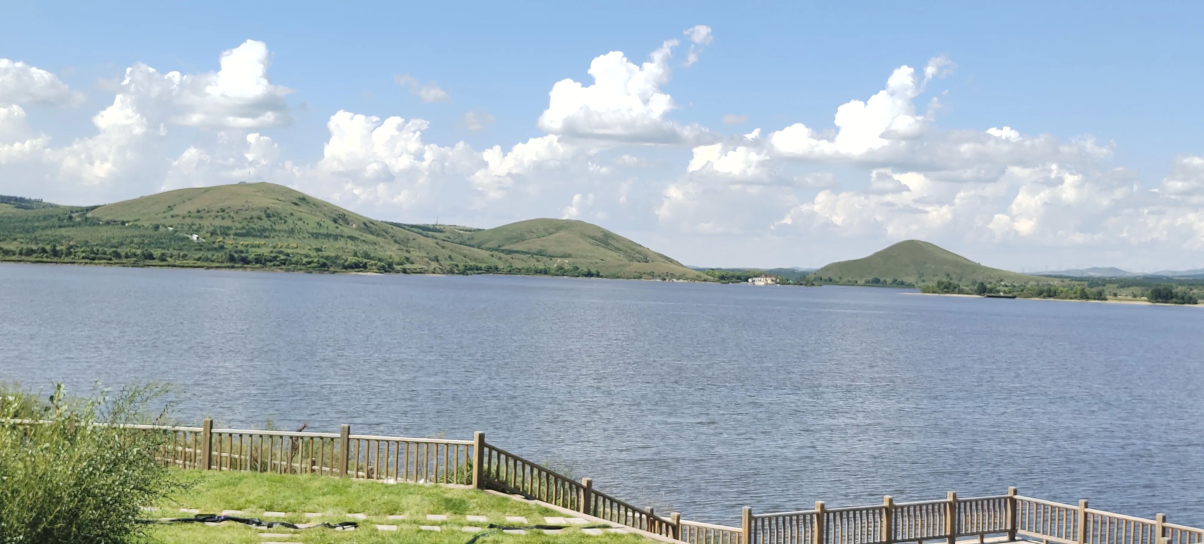 昨夜刚下过一场雷雨,空气清新,凉爽宜人,驾车几分钟后,已看见湖光山色,蓝天高远,湖面波光粼粼,远山如黛,岸边树和青草苍翠欲滴,时有奇石嶙峋,犹如步入画境一般宁静美丽。