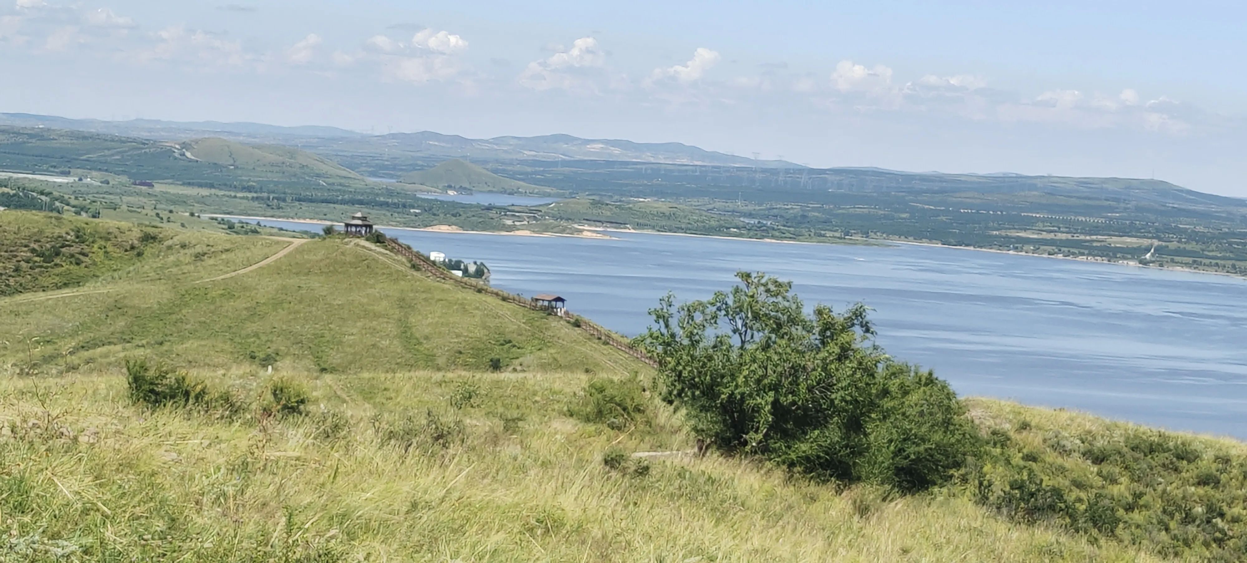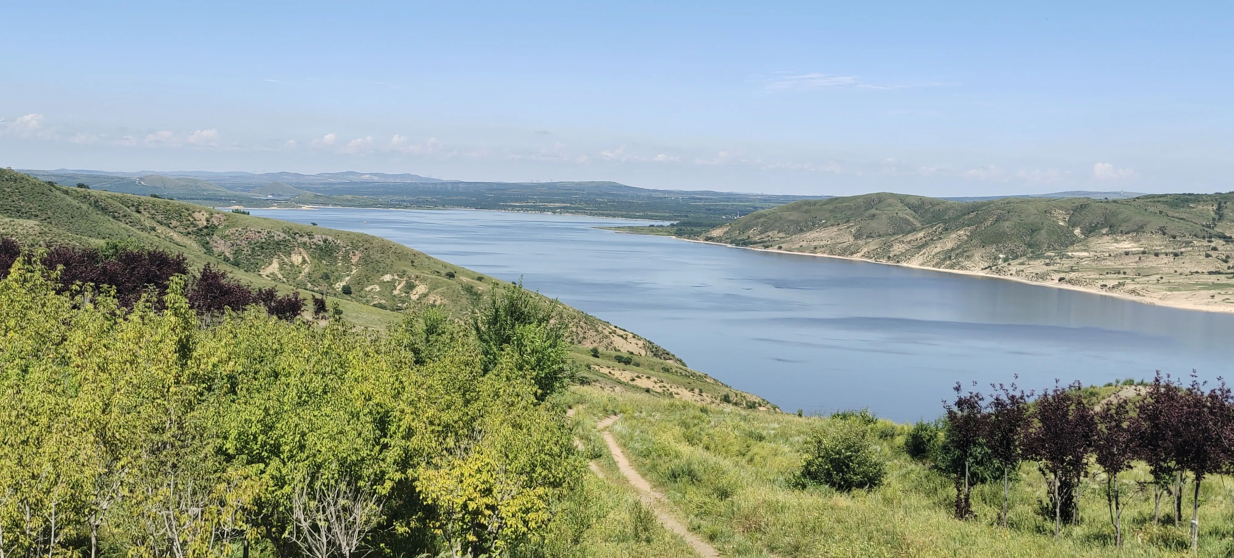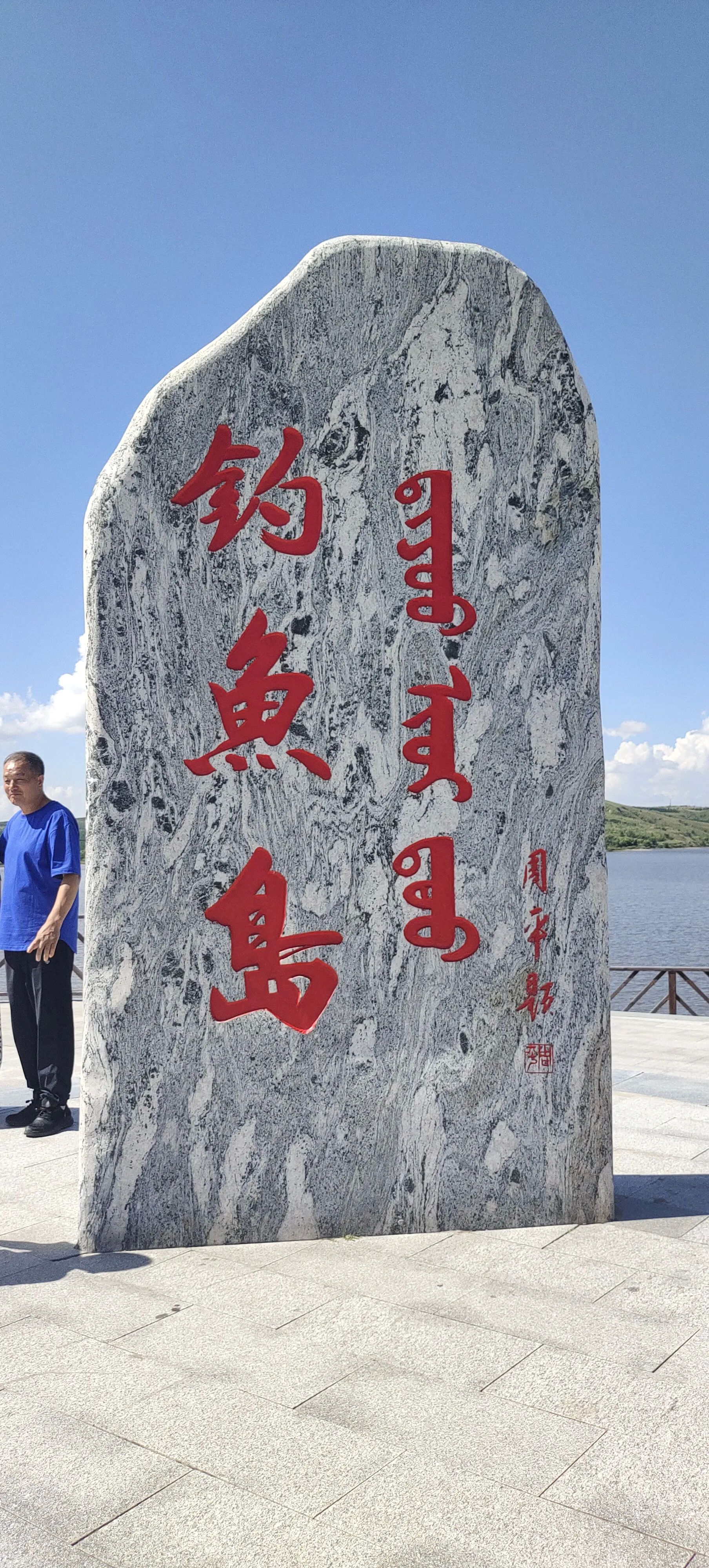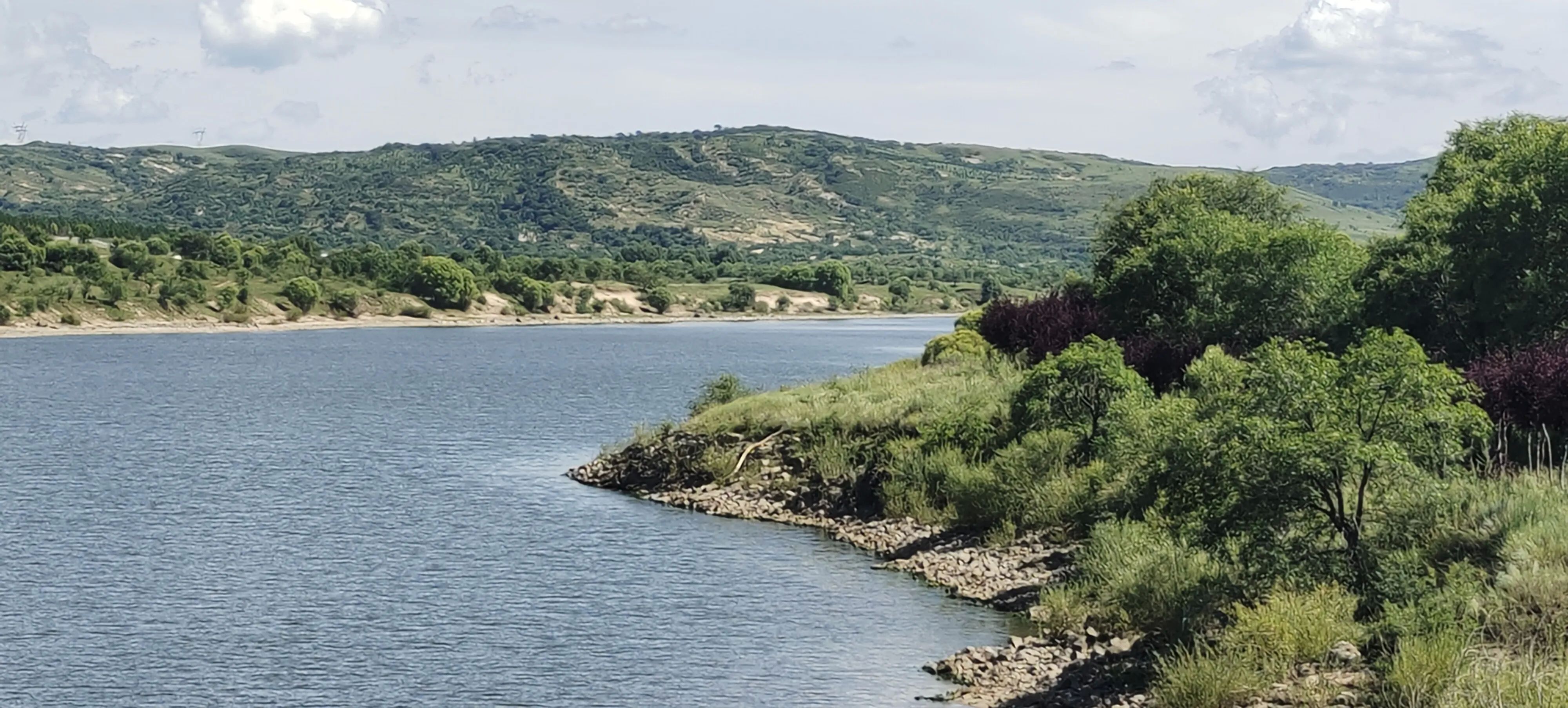 昨夜刚下过一场雷雨,空气清新,凉爽宜人,驾车几分钟后,已看见湖光山色,蓝天高远,湖面波光粼粼,远山如黛,岸边树和青草苍翠欲滴,时有奇石嶙峋,犹如步入画境一般宁静美丽。
