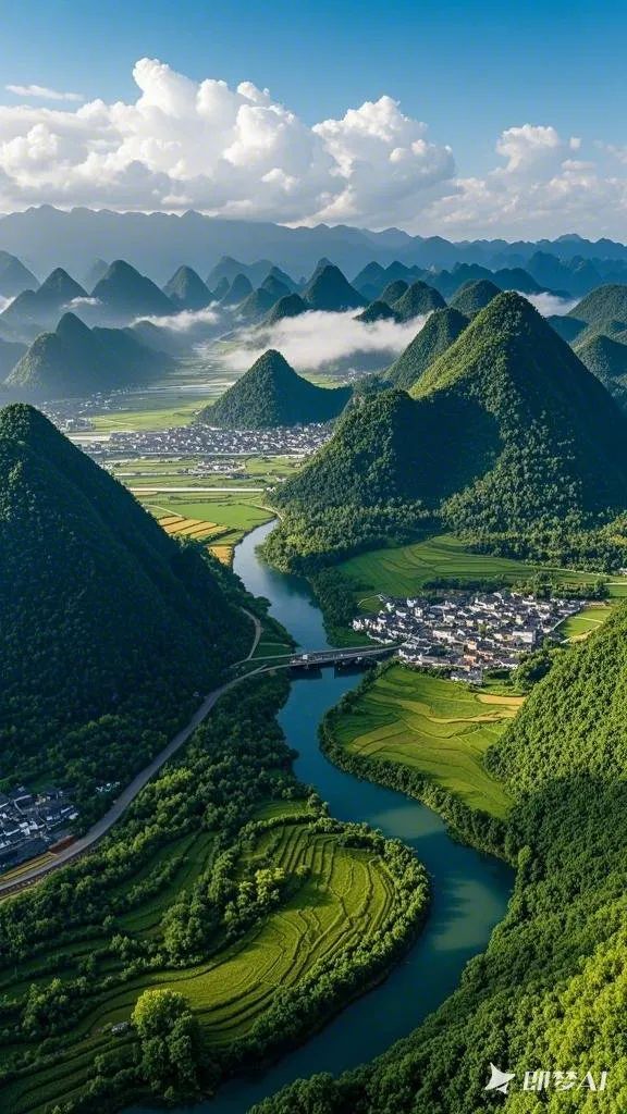 出了古镇,周边的田园风光美不胜收。大片的稻田,在微风中泛起层层稻浪。田野间的农舍,升起袅袅炊烟。