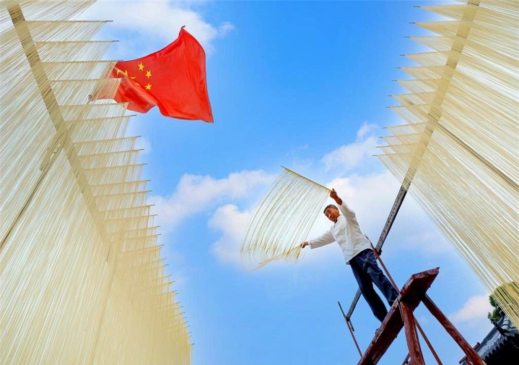中江挂面村的面条挂在架子上,远看像一片白色瀑布。
