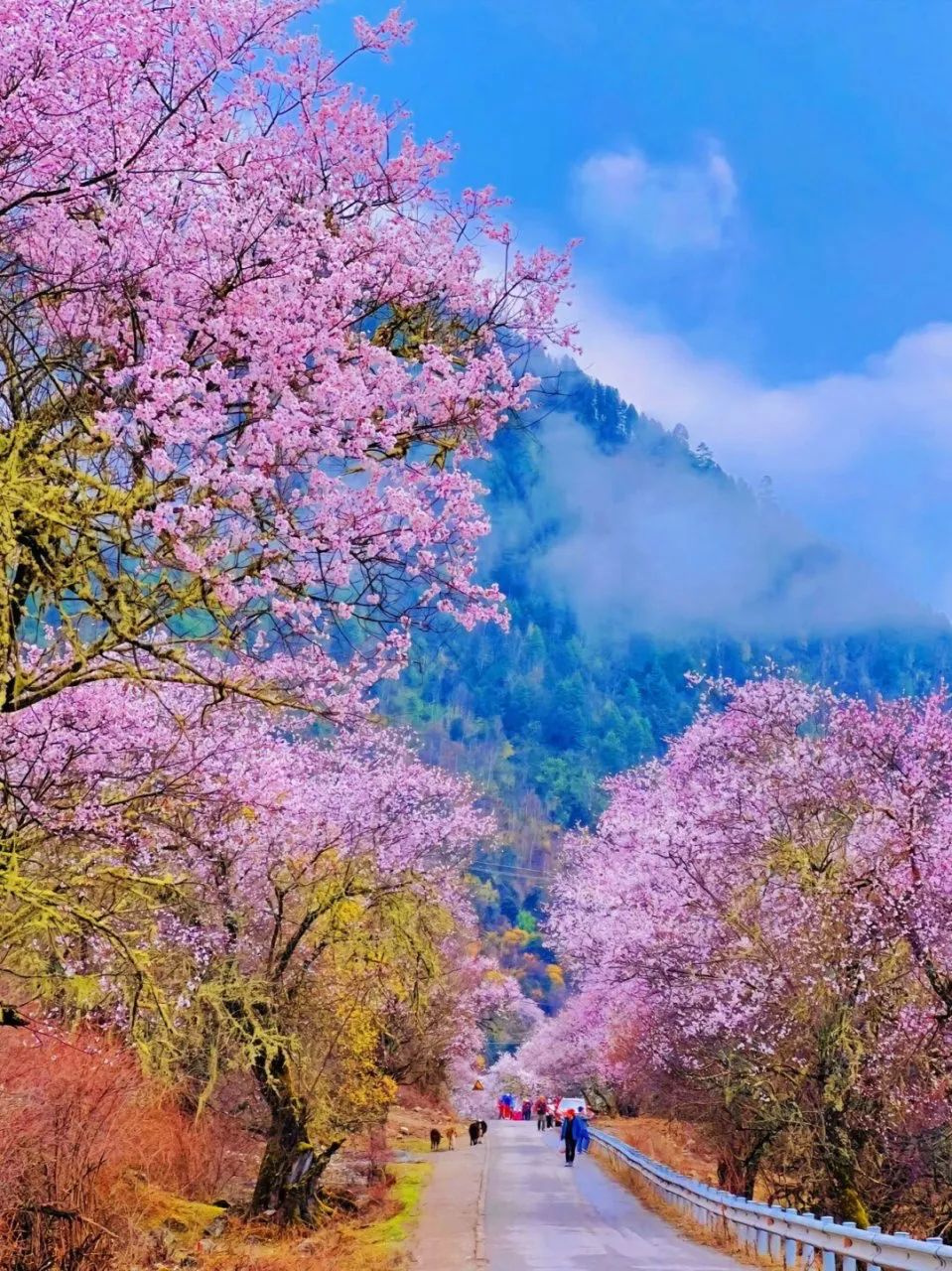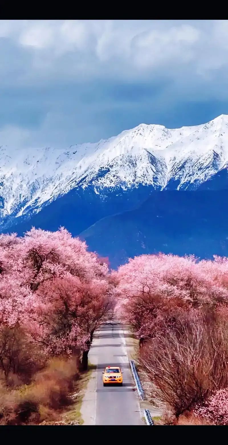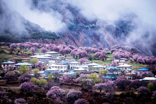 林芝桃花核心区,绵延30公里的野生桃林与雪山、田野相映。