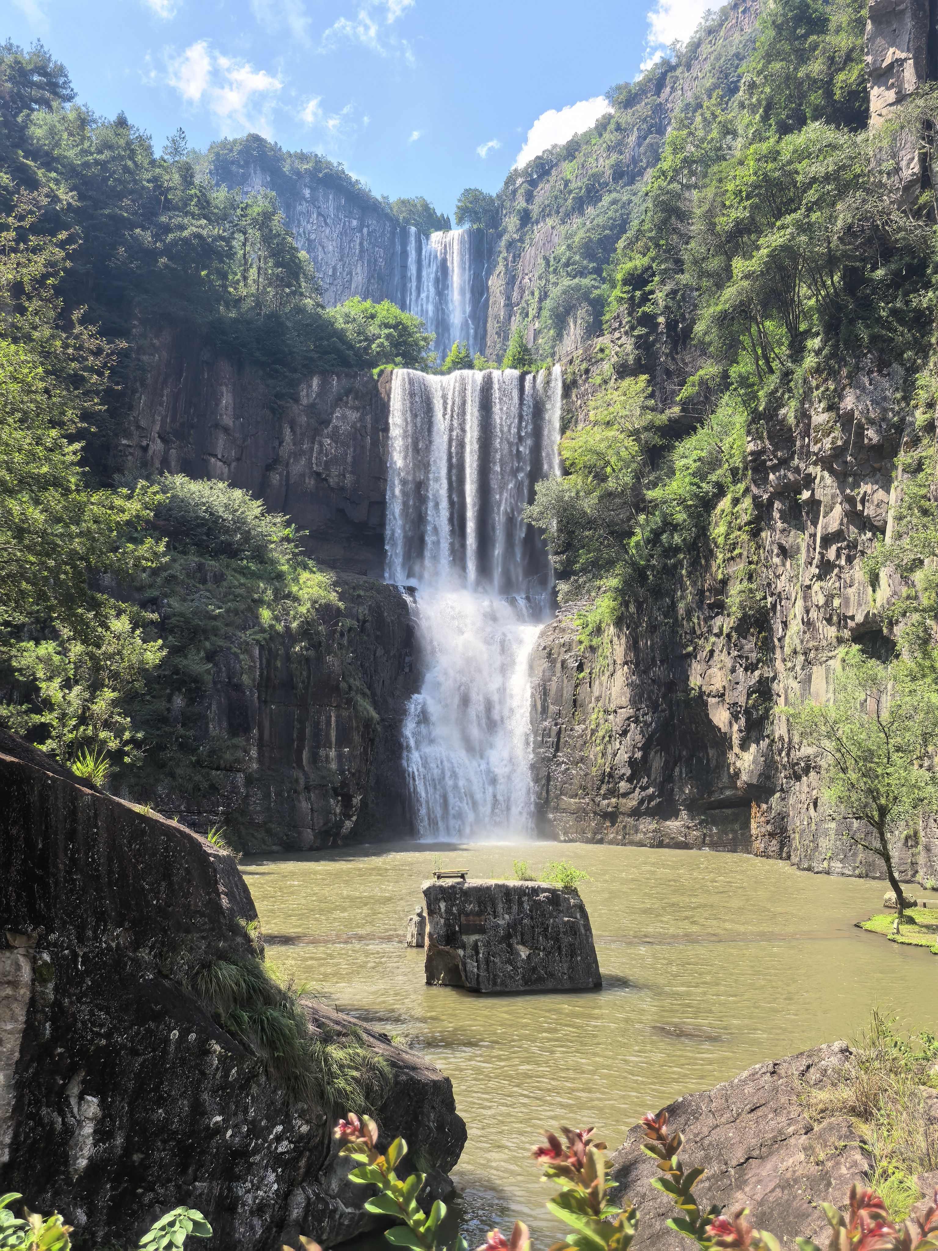 不去不知道,一去吓一跳。这个景点是我们浙江之旅最惊喜的一个景点,不仅历史文化底蕴深厚~刘基庙,而且自然景观壮美~百丈漈,太让人意外了。刘基庙在文成县南田镇,由于在维修,现在免费参观,主要有刘伯温纪念馆、刘基庙、碑林等;百丈漈在刘基庙南10来公里百丈漈镇,分一漈、二漈、三際。一漈水量极大,号称中华第一高瀑,浅起的水花呈雾状漂飞,景色极其壮观;二漈的瀑布虽然没有一漈高大,但水面要宽广许多,更吸引游客的是,人们可以沿着下方的山洞通道穿越瀑布,似有体验水帘洞的感觉;三漈瀑布落差虽小,但景色也很美。
