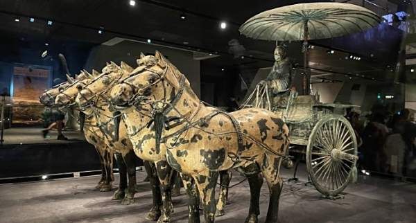 铜车马展厅展出的青铜车马,使用了大量金银,制作精巧,被誉为“青铜之冠”,对秦代学术研究具有重要价值。