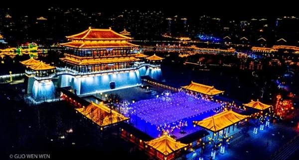 夜景色彩璀璨,灯火辉煌中的唐文化长廊、芳林苑、紫云楼等地,处处灿烂夺目。