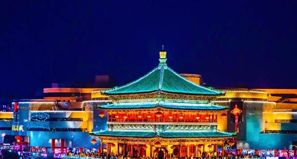 站在钟楼上,能够看到从钟楼延伸出来的东、南、西、北四条大街,钟楼周边西安最繁华的商区、及不远处的鼓楼。