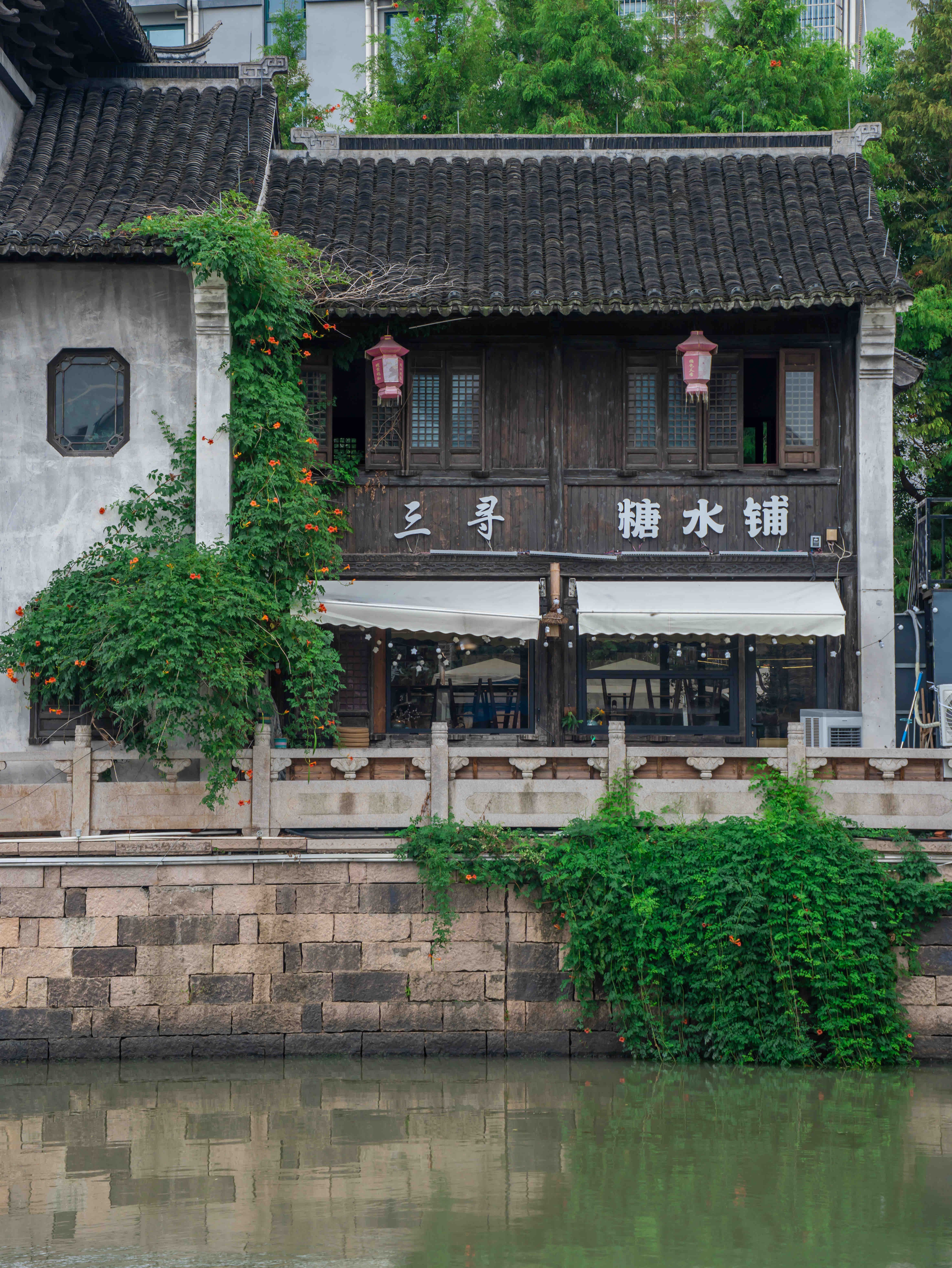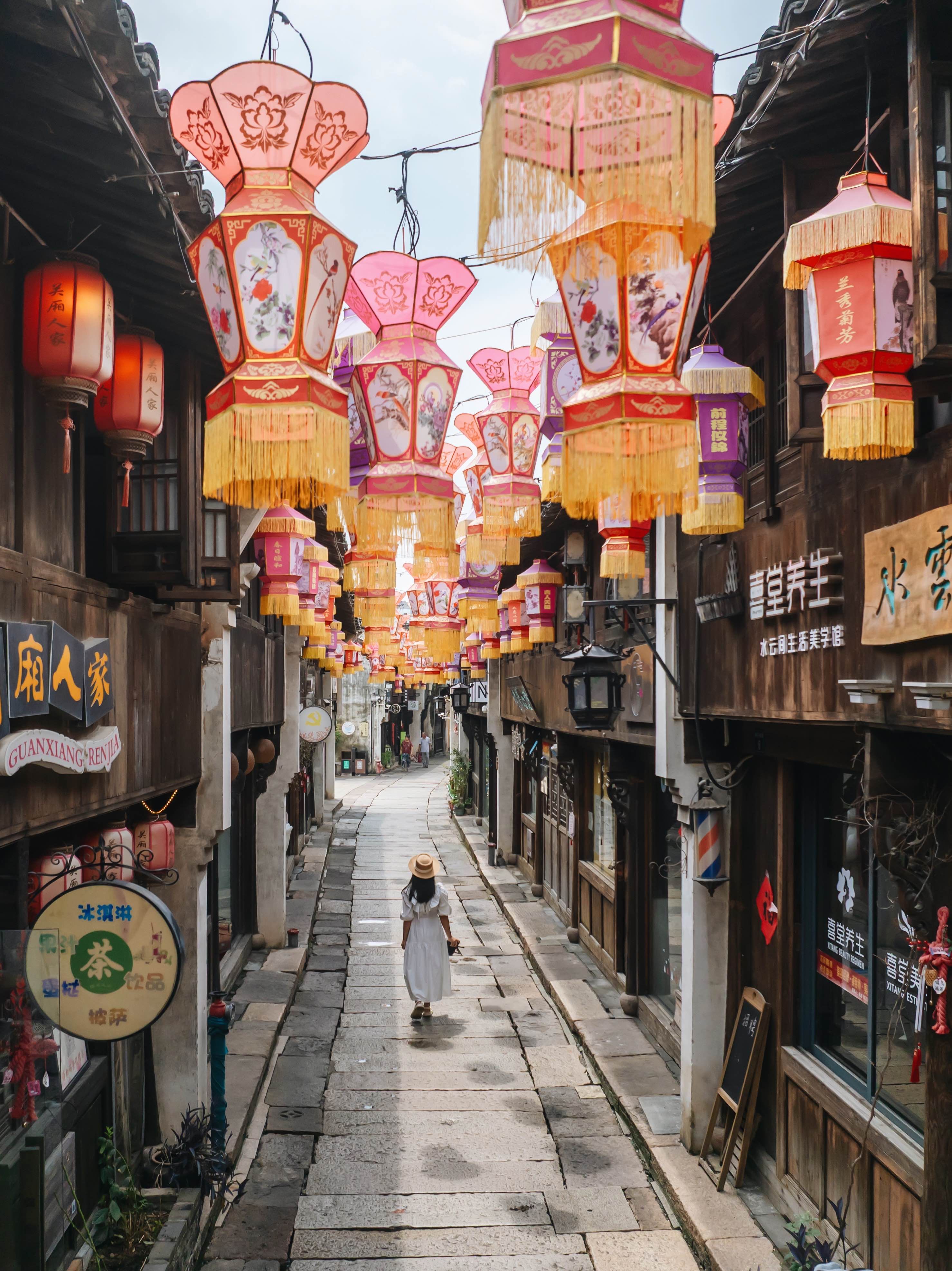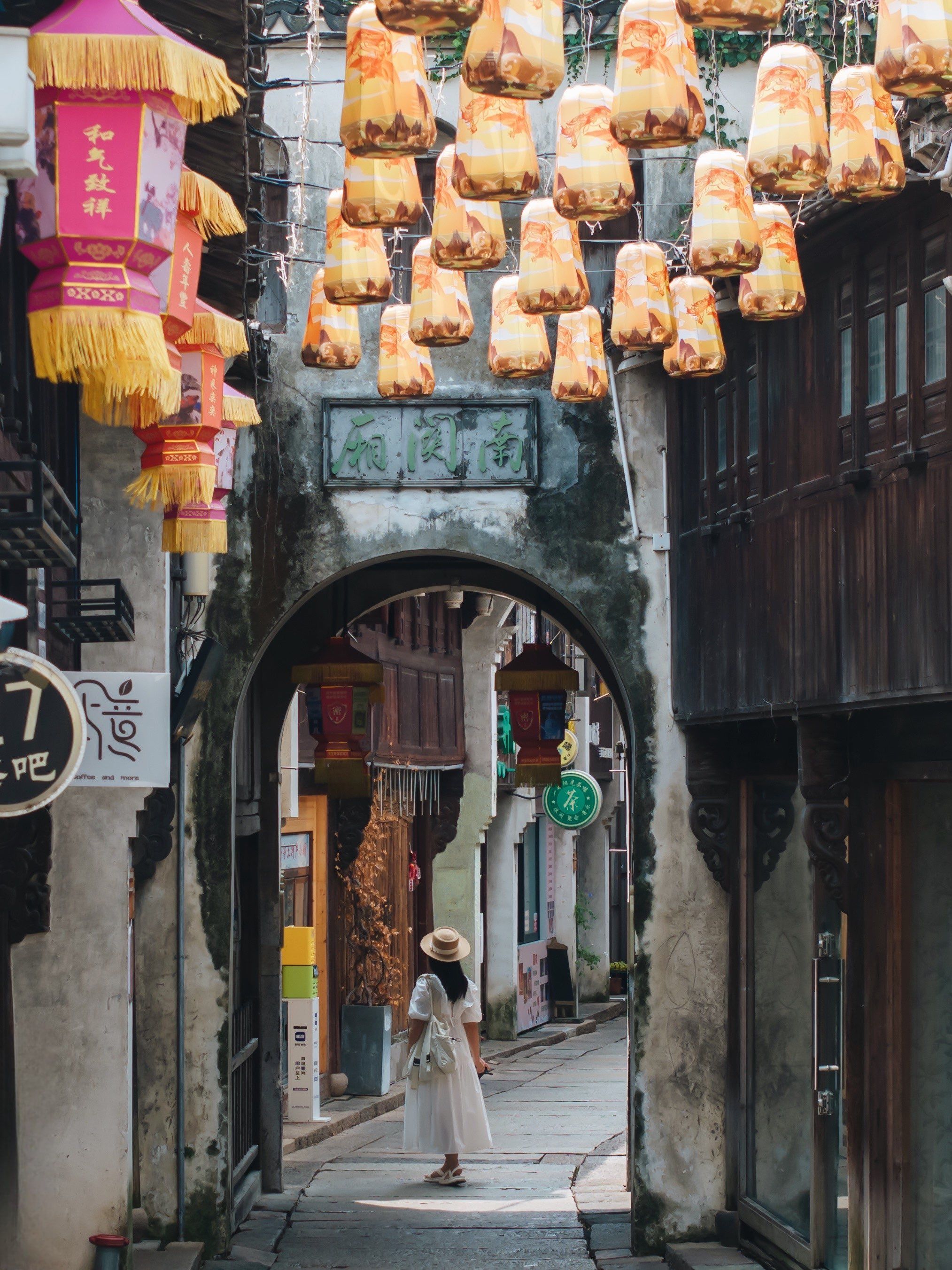 青石板路,白墙黛瓦的江南古民居街,街上挂满了彩灯非常好看,过河对面就是中丝三厂