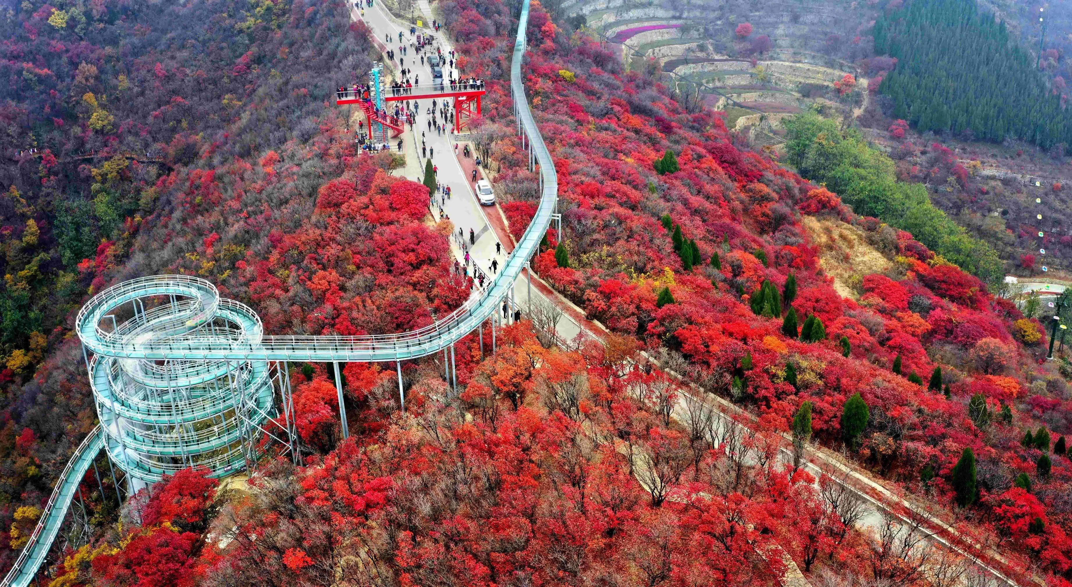 5. 淄博红叶柿岩景区:当秋天悄然来临,景区内百年柿林宛如被点亮的灯笼海洋,火红的枫叶与粗犷的花岗岩相互映衬,构成一幅绝美的秋日画卷。而且在特定活动期间,情侣购买双人门票还能享受专属优惠,是秋日情侣约会、赏景的浪漫之选。