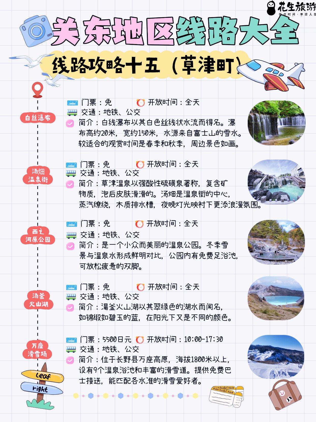 线路15(草津町):白丝瀑布-汤畑/温泉街-西之河原公园-汤釜火山湖-万座滑雪场