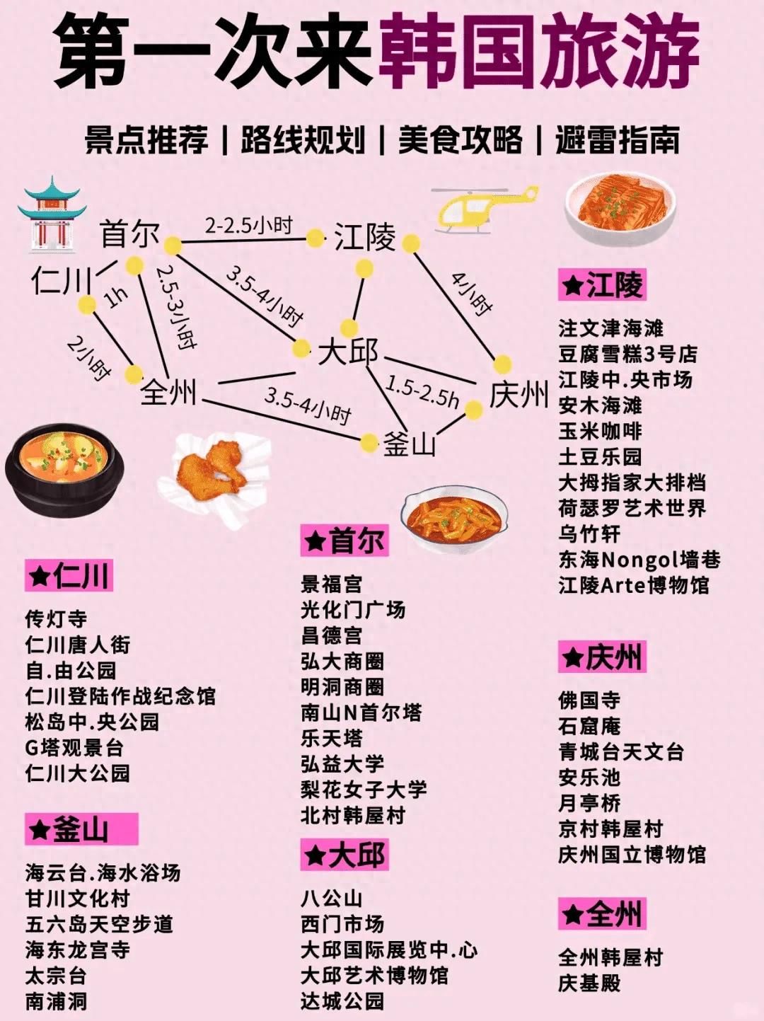 1⃣ 推荐路线:仁川→首尔→江陵→庆州→釜山,各站点间交通时间2-4小时不等