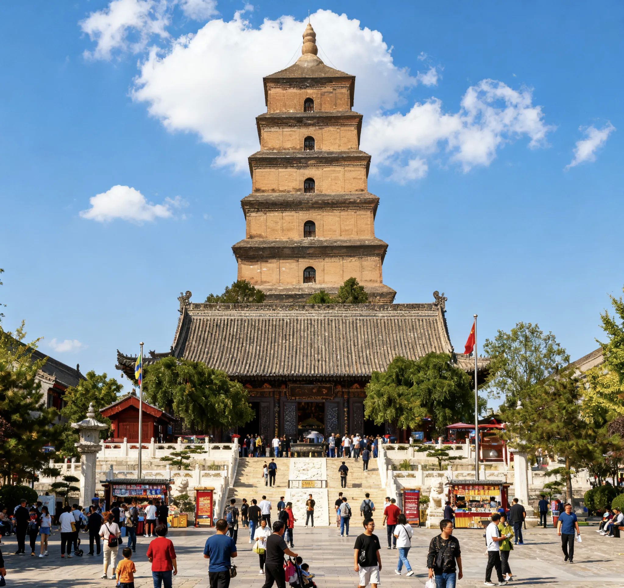 ** 大雁塔广场 & 大唐不夜城**:这里是感受唐风的最佳地点!大雁塔北广场的音乐喷泉夜晚格外震撼,南广场则能欣赏大雁塔全貌。紧邻的大唐不夜城是24小时开放的仿唐步行街,每晚有“不倒翁小姐姐”等精彩表演,穿汉服拍照仿佛穿越回盛唐。