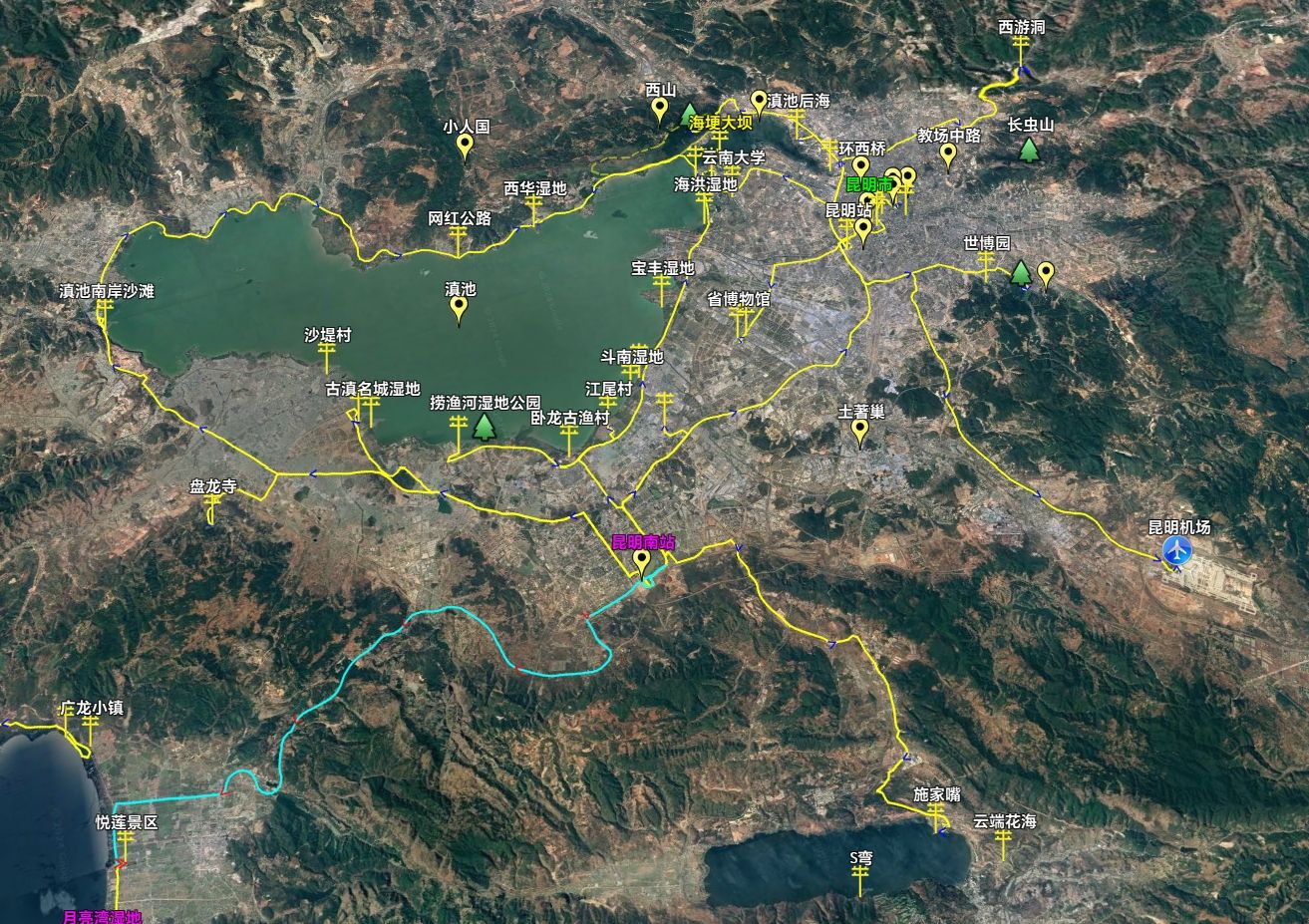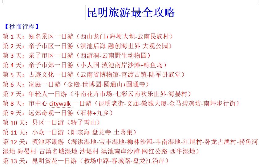 13天的行程涵盖了昆明市内及周边的知名景点,包括西山龙门、海埂大坝、云南民族村、滇池后海、融创海世界、大观公园、西游洞、云南野生动物园、小人国、滇池南岸沙滩、鲸鱼岛、云南省博物馆、官渡古镇、陆军讲武堂、金殿、世博园、圆通山、圆通寺、斗南花卉市场、七彩云南欢乐世界、海晏村、石林、九乡、轿子雪山、阳宗海、盘龙寺、土著巢、滇池环湖游、昆明赏花游等。