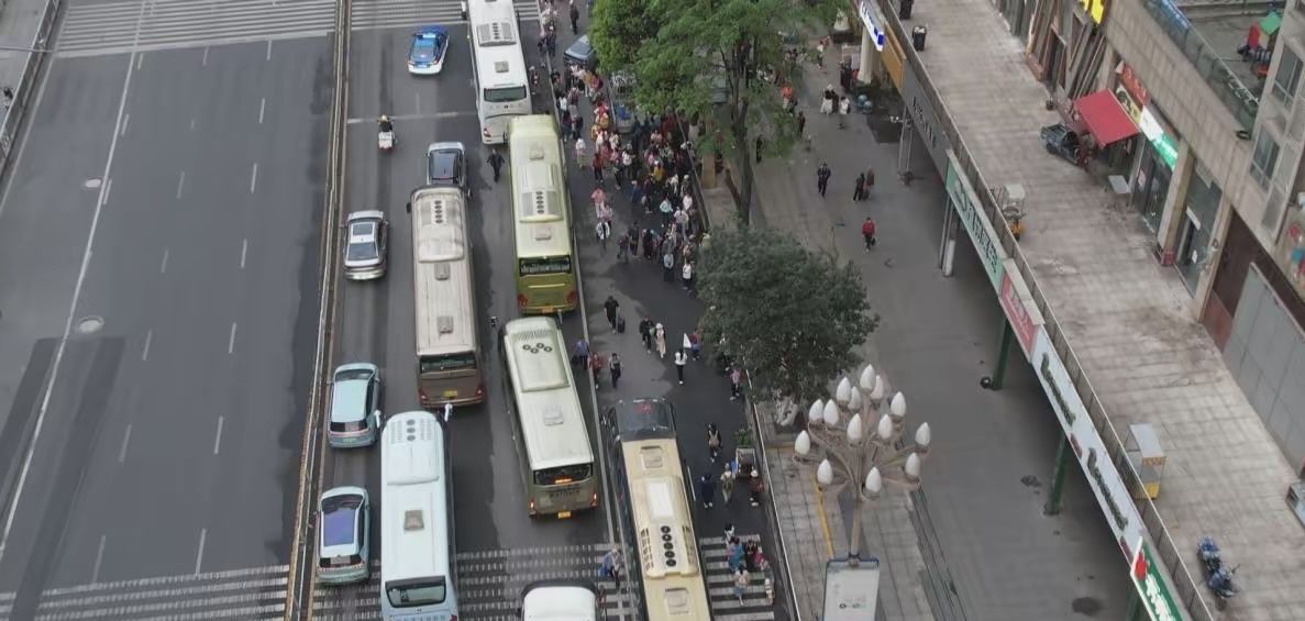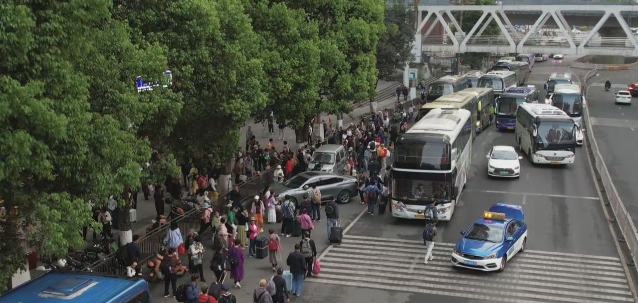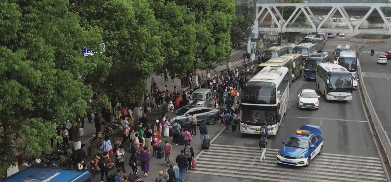春游贵州有多火?近段时间,在贵阳市南明区花果园小区,每天清晨旅游大巴排起长龙