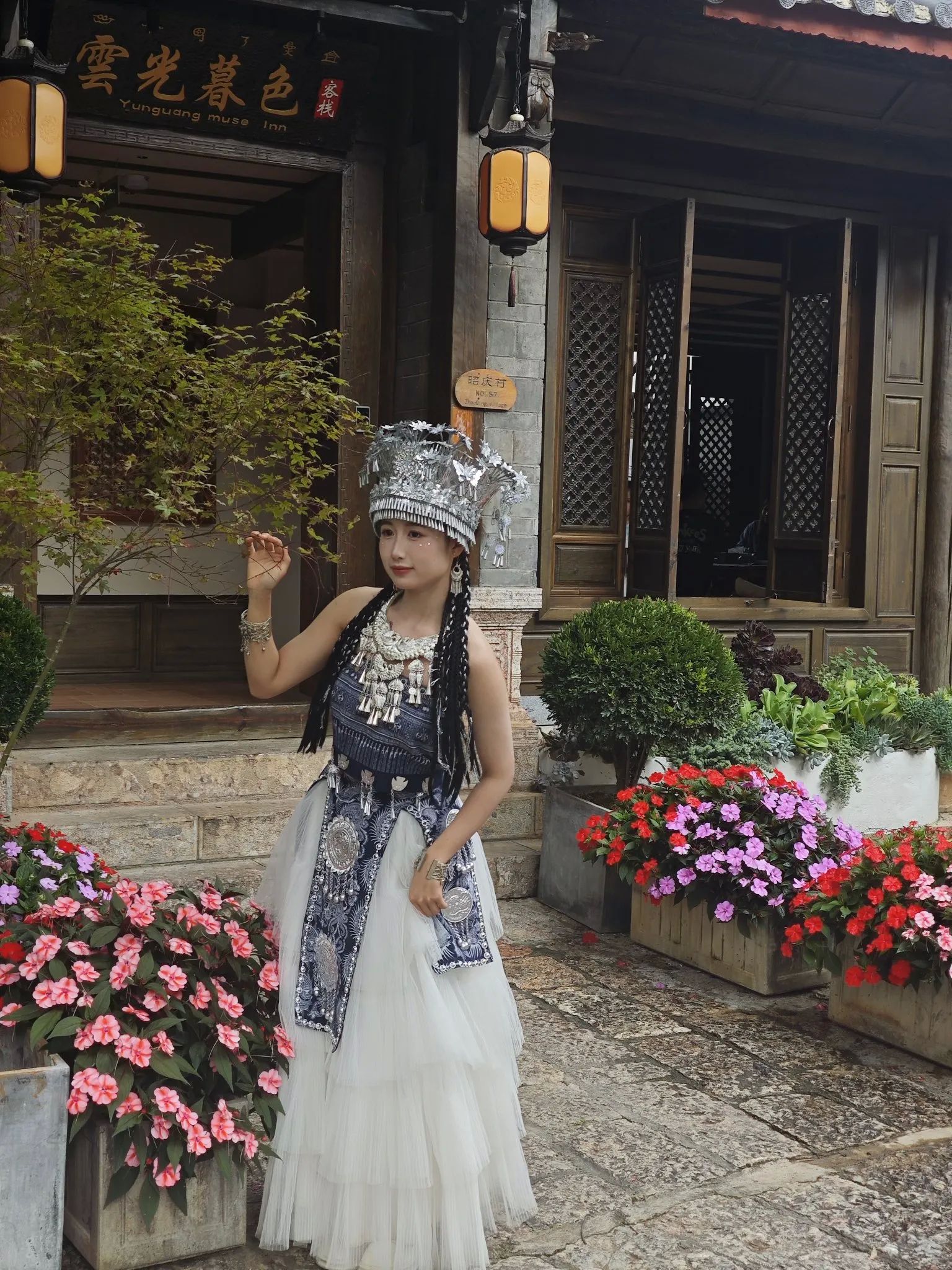 女儿换了隆重的苗族服装,精美的银冠头饰,稍加修饰妆容,活脱脱的少数民族美女一枚。