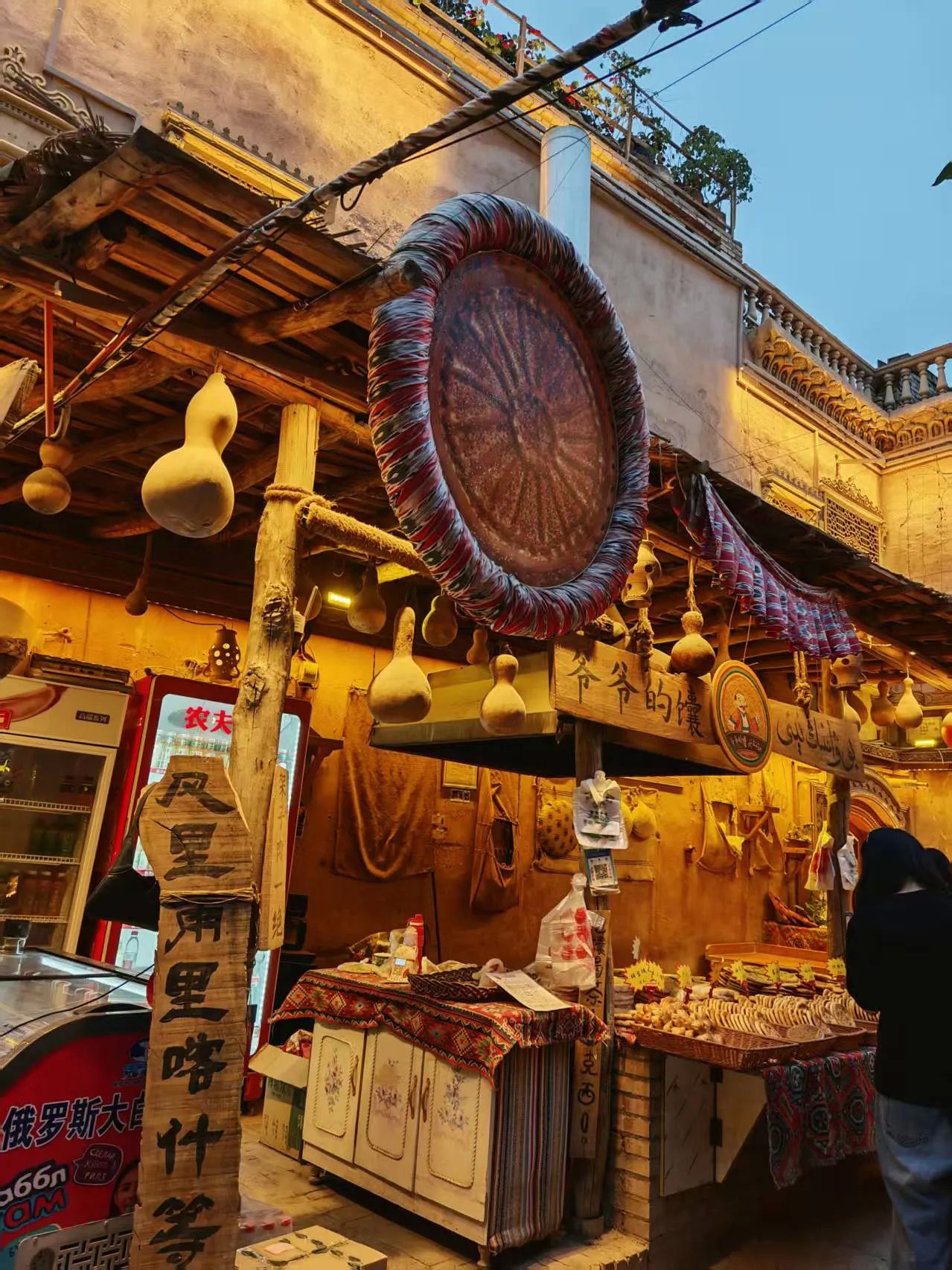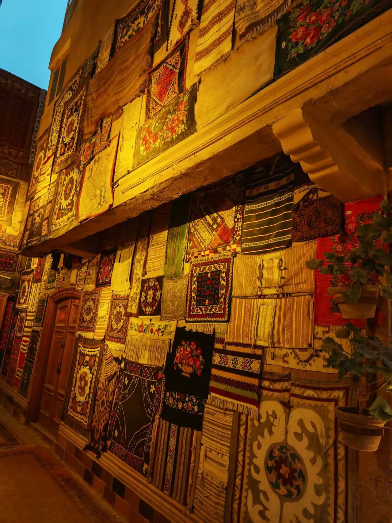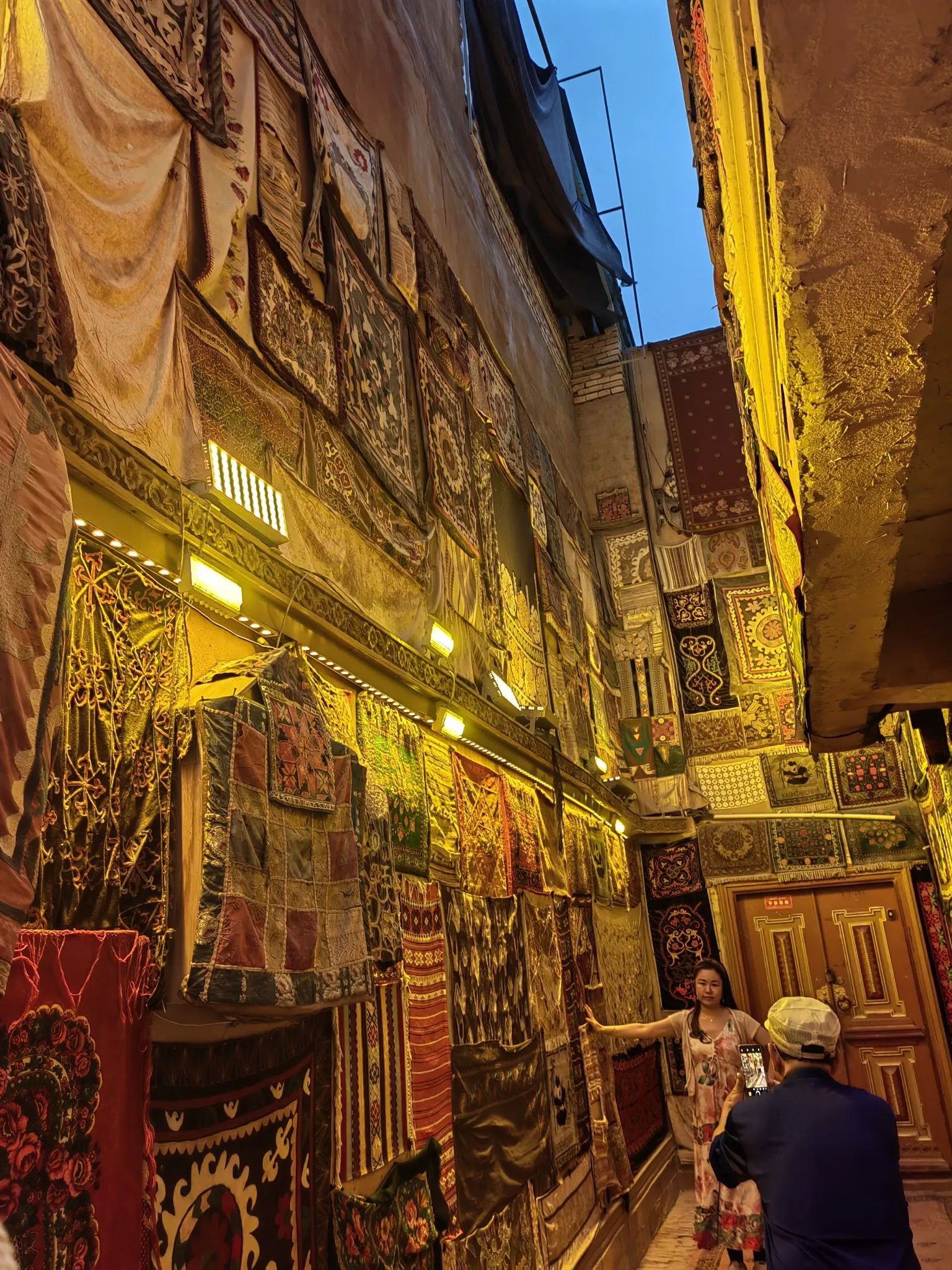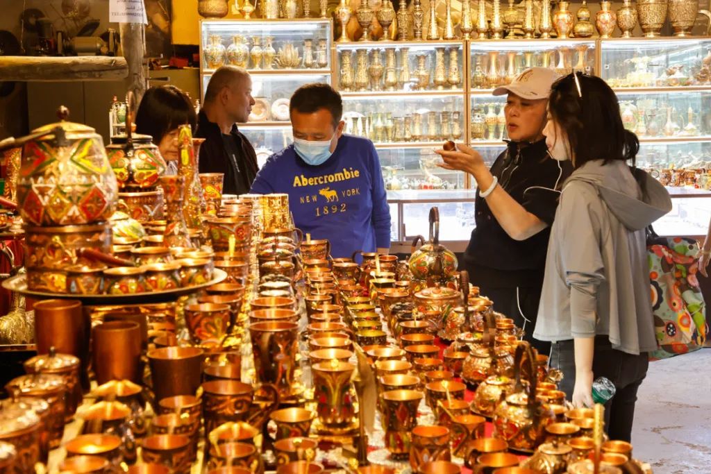 游客慕名而来,在欣赏古城独特民居、街巷的同时,可尽情游逛极富民族特色的玉石巴扎、铜器巴扎、帽子巴扎、陶器巴扎,以及艾德莱斯丝绸、烙铁烫画等各类店铺,体验手工制作乐器全过程,还有美食巴扎,品尝地道的新疆羊肉串、烤包子、羊肉抓饭。逛累了,就走进百年老茶馆里歇歇脚,喝一杯当地特色茶饮,配以酥软甜蜜的茶点,享受难得休闲时光。巴扎夜市到处是人声鼎沸,弥漫着香料、刚出炉的面包和烤肉的香气。我们还去了极具地方特色的牛羊交易市场,摸羊屁股,吃了原汁原味的烤羊肉串,深切感受到肉比蔬菜便宜,牛羊肉大快朵颐的体验。