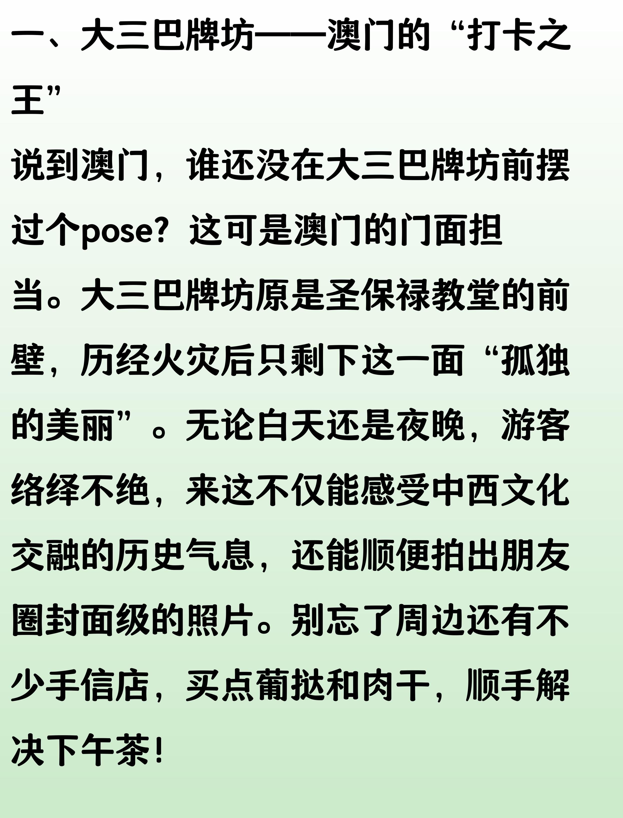 说起澳门,别只想着赌场和蛋挞!我这次专门盘点了8个超级值得打卡的景点,保证让你朋友圈点赞爆棚。朋友小李上次去了5个,回来跟我吹了半天,你去过几个?快来看看,别错过这些宝藏地!