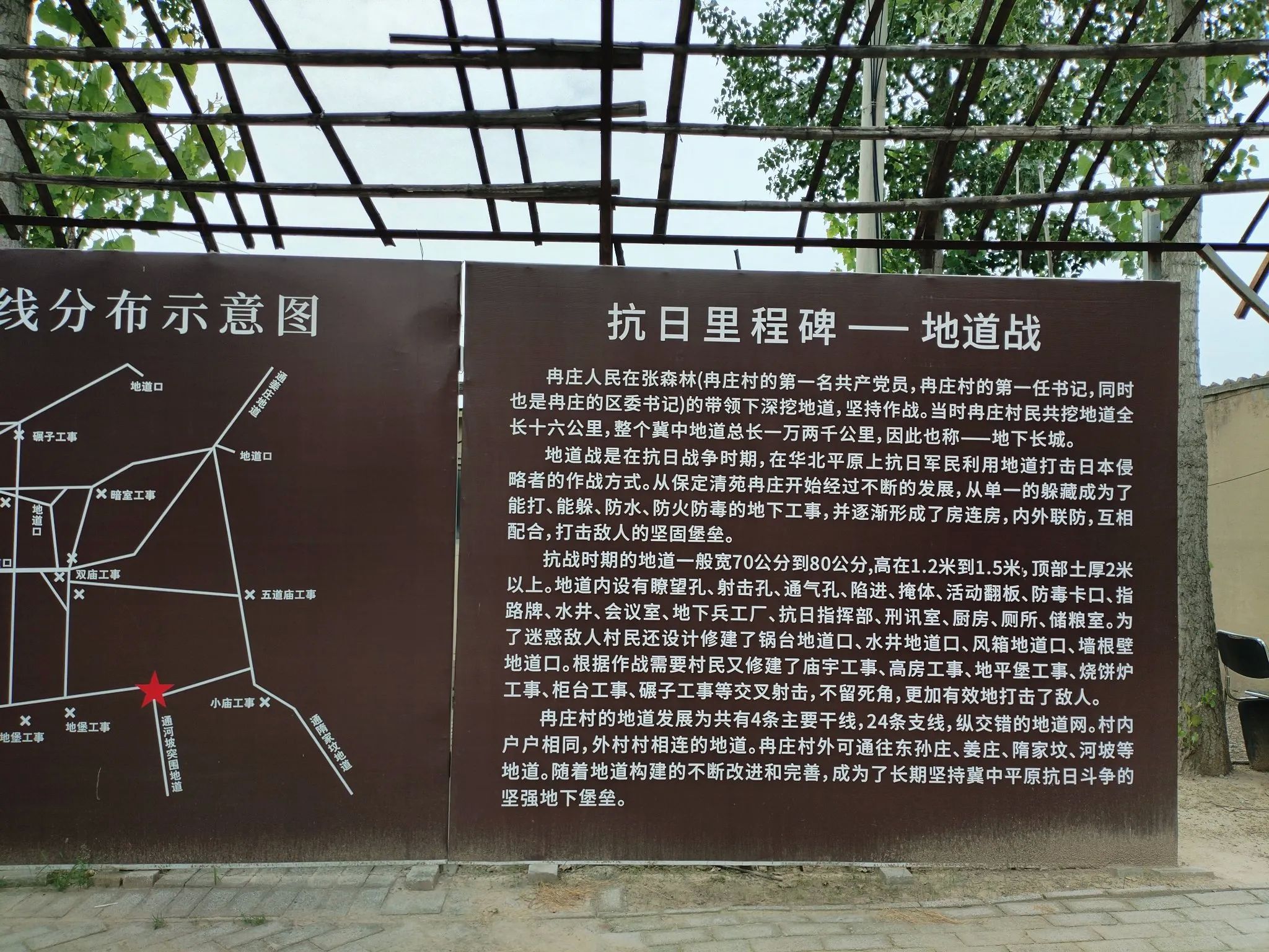 The tunnels and fortifications of the Ranzhuang Tunnel Warfare Site are centered around the intersection of Ranzhuang Village, featuring main lines to the east, west, south, and north, with a total length of 2.25 kilometers. There are also 13 north-south branch lines, 11 east-west branch lines, and 4 connecting tunnels leading to neighboring villages, totaling approximately 16 kilometers.