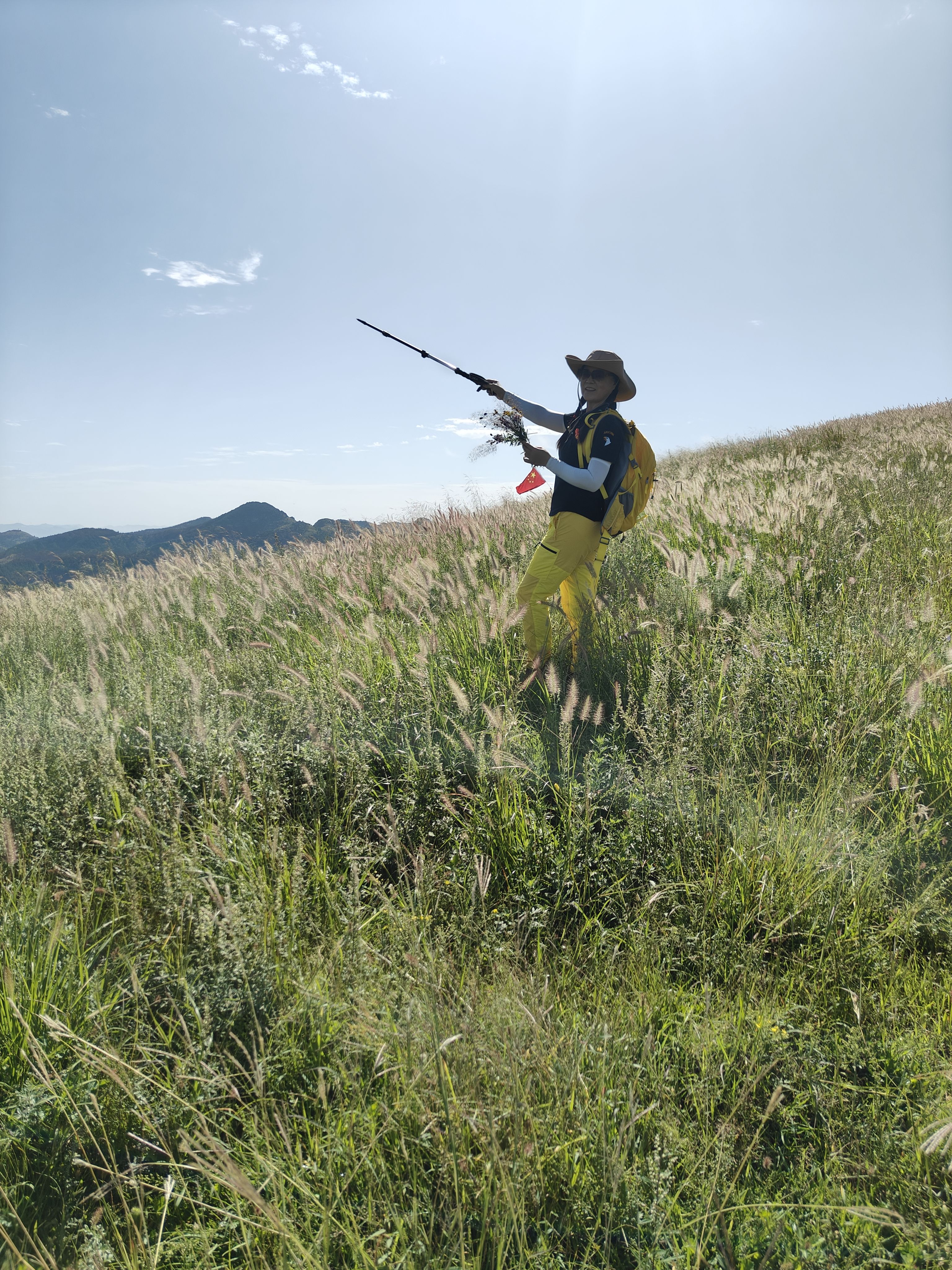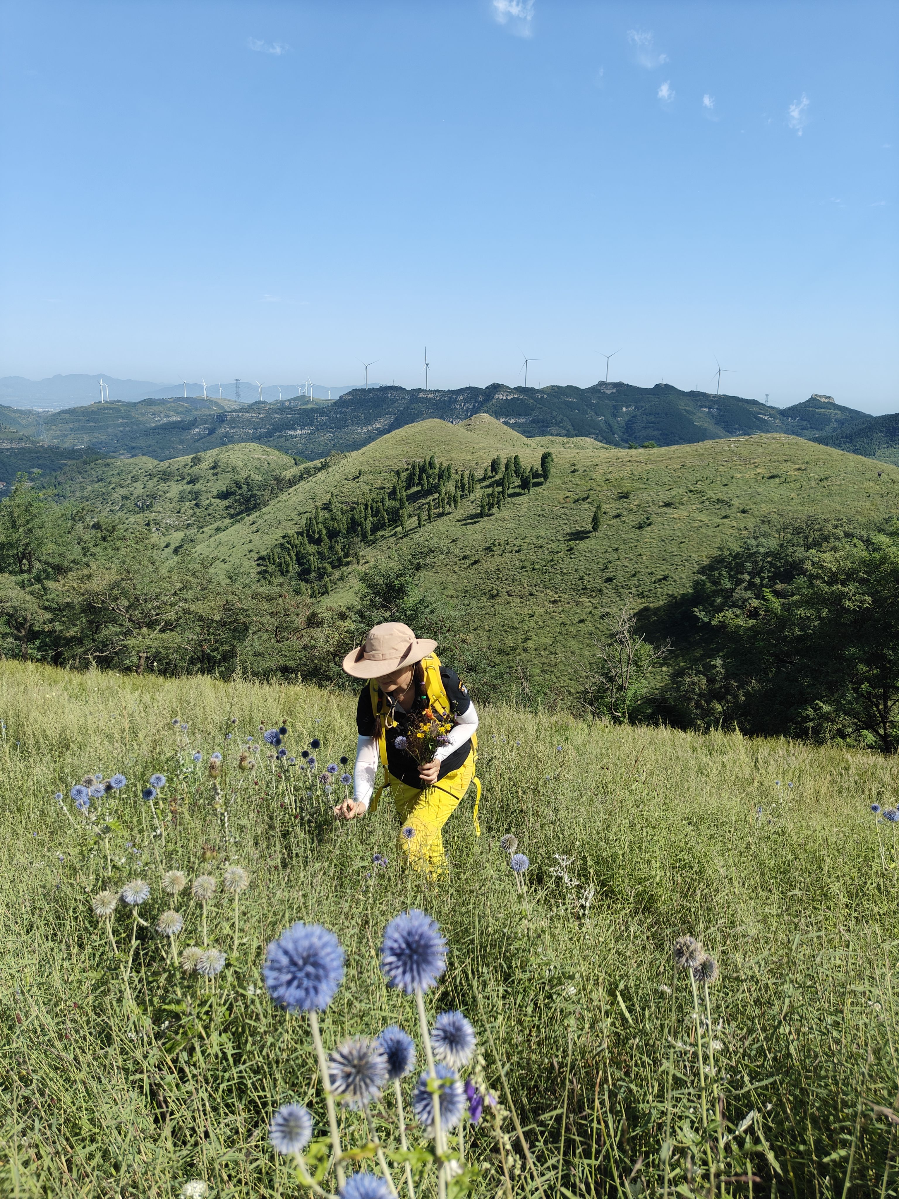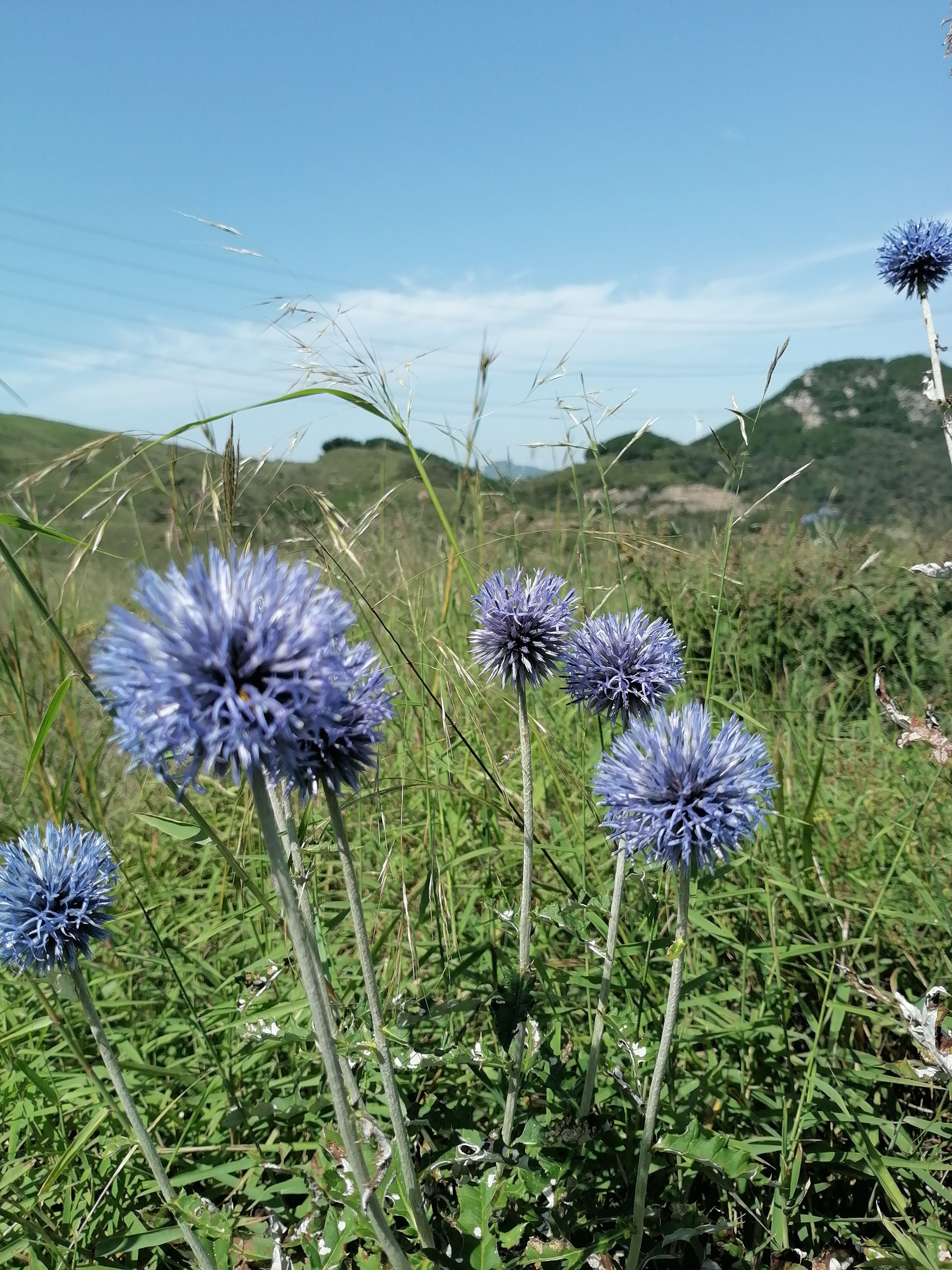 真的不愧为“空中草原”,大片的高高的狗尾巴草随风摇曳,山上开了很多小野花,有黄色的旋覆花(图9),有点像小雏菊;有蓝紫色的蓝刺头(图8),颜色很好看;还有黄麦草,当地人也叫黄贝草,有点像小麦的那种草,上几次都是九月中下旬来的,颜色已经绿中带黄了,这次来得早,草还是绿色的,白露过后就慢慢变黄了。所以虽然来过六次,但季节不一样,风景也不一样,遇到的人不同,心境也会不同。