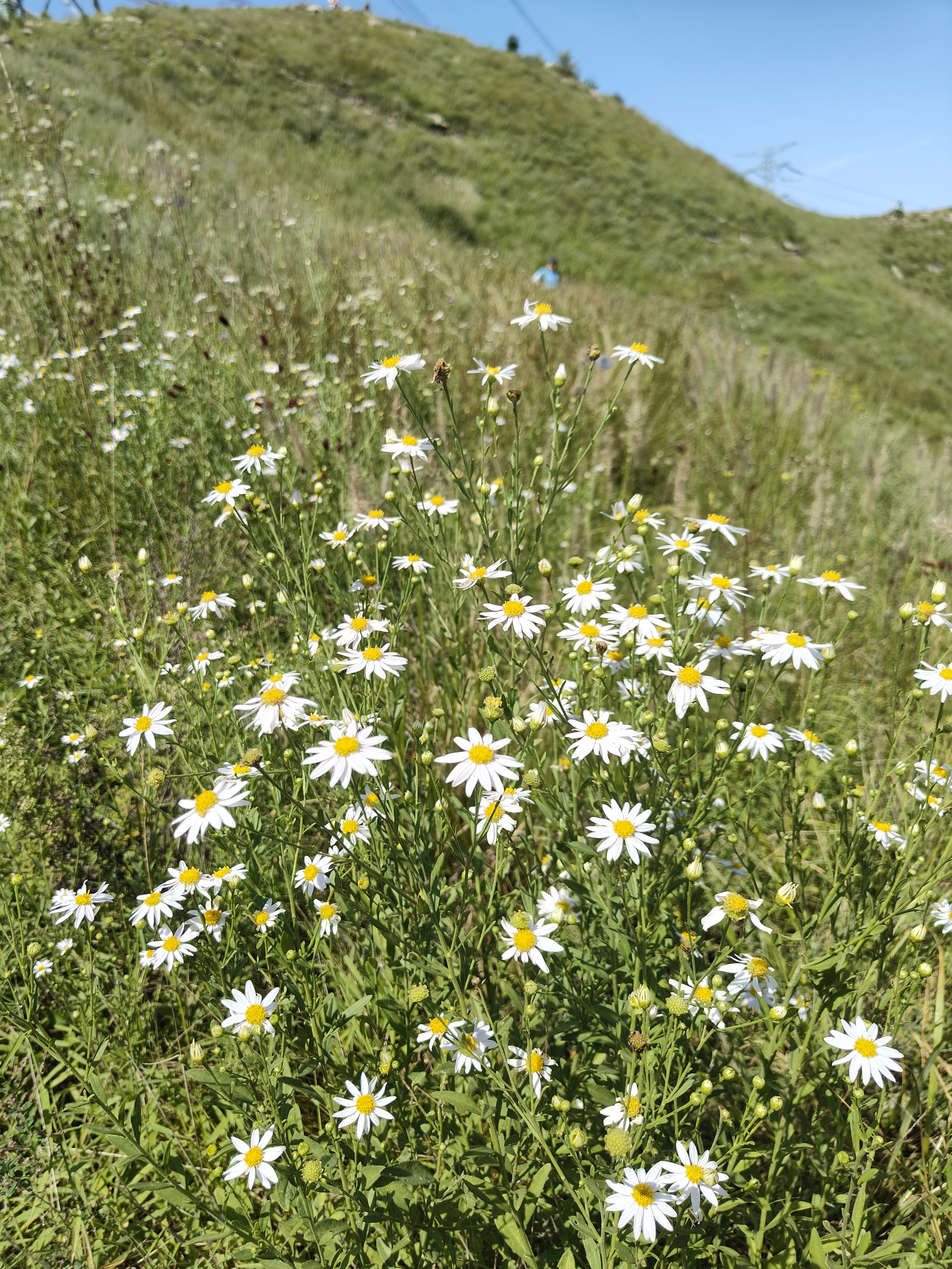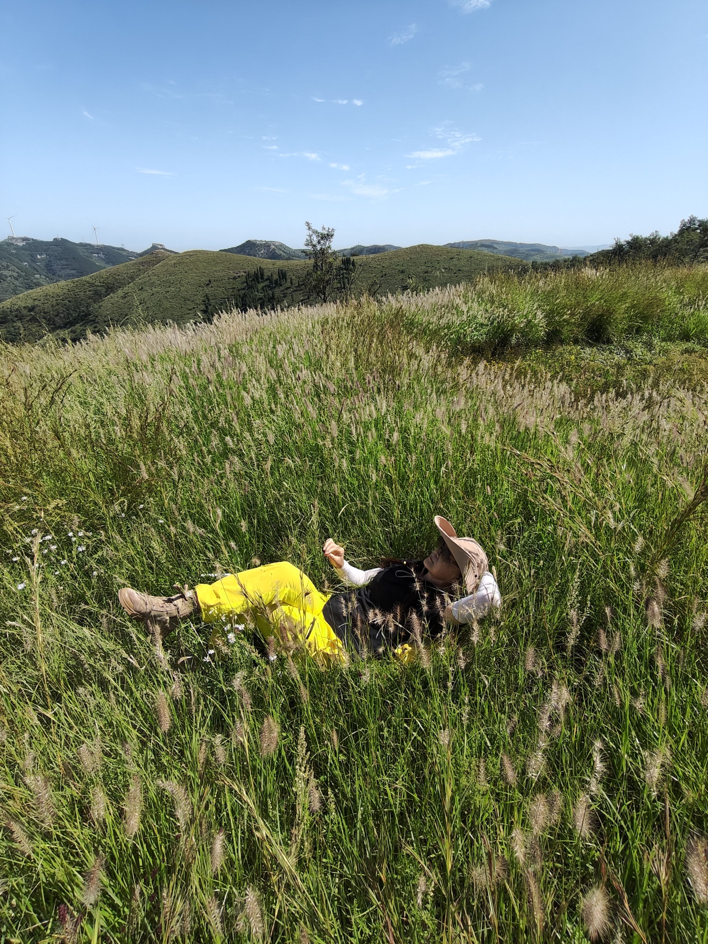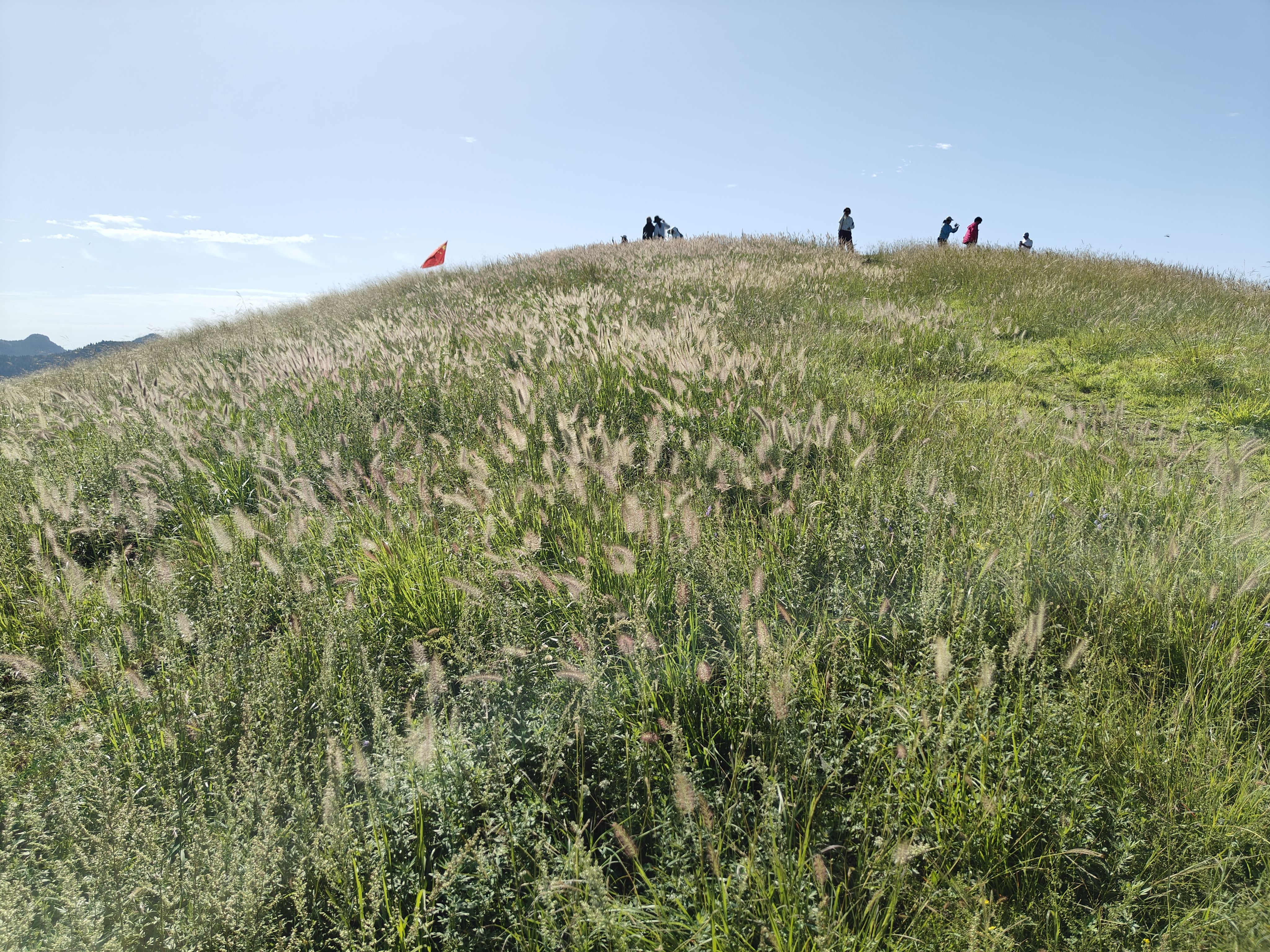 真的不愧为“空中草原”,大片的高高的狗尾巴草随风摇曳,山上开了很多小野花,有黄色的旋覆花(图9),有点像小雏菊;有蓝紫色的蓝刺头(图8),颜色很好看;还有黄麦草,当地人也叫黄贝草,有点像小麦的那种草,上几次都是九月中下旬来的,颜色已经绿中带黄了,这次来得早,草还是绿色的,白露过后就慢慢变黄了。所以虽然来过六次,但季节不一样,风景也不一样,遇到的人不同,心境也会不同。