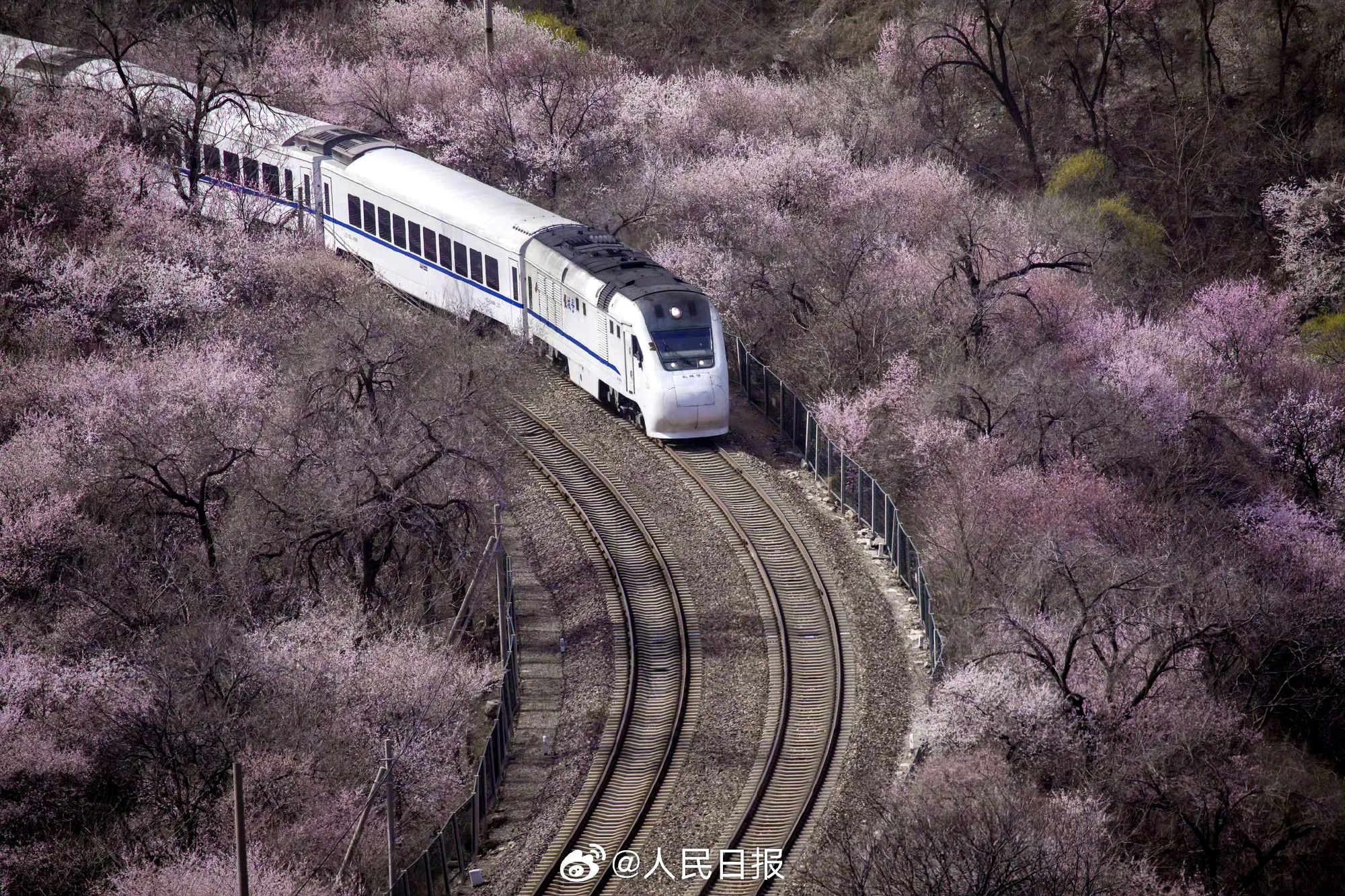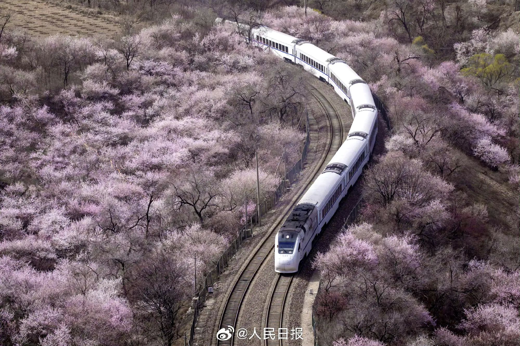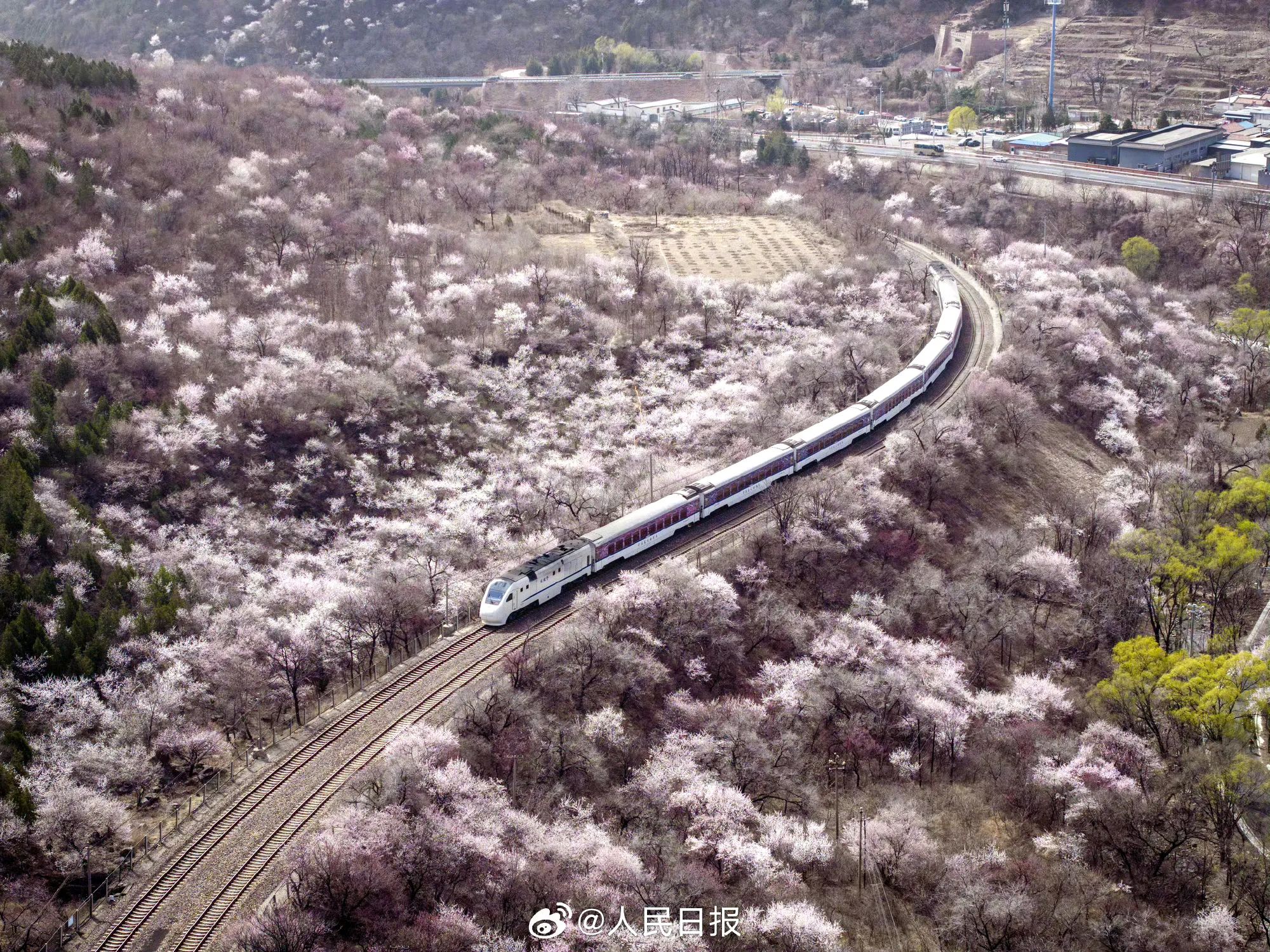 居庸关长城:S2线列车穿越粉色山桃花海,被誉为“开往春天的列车”。