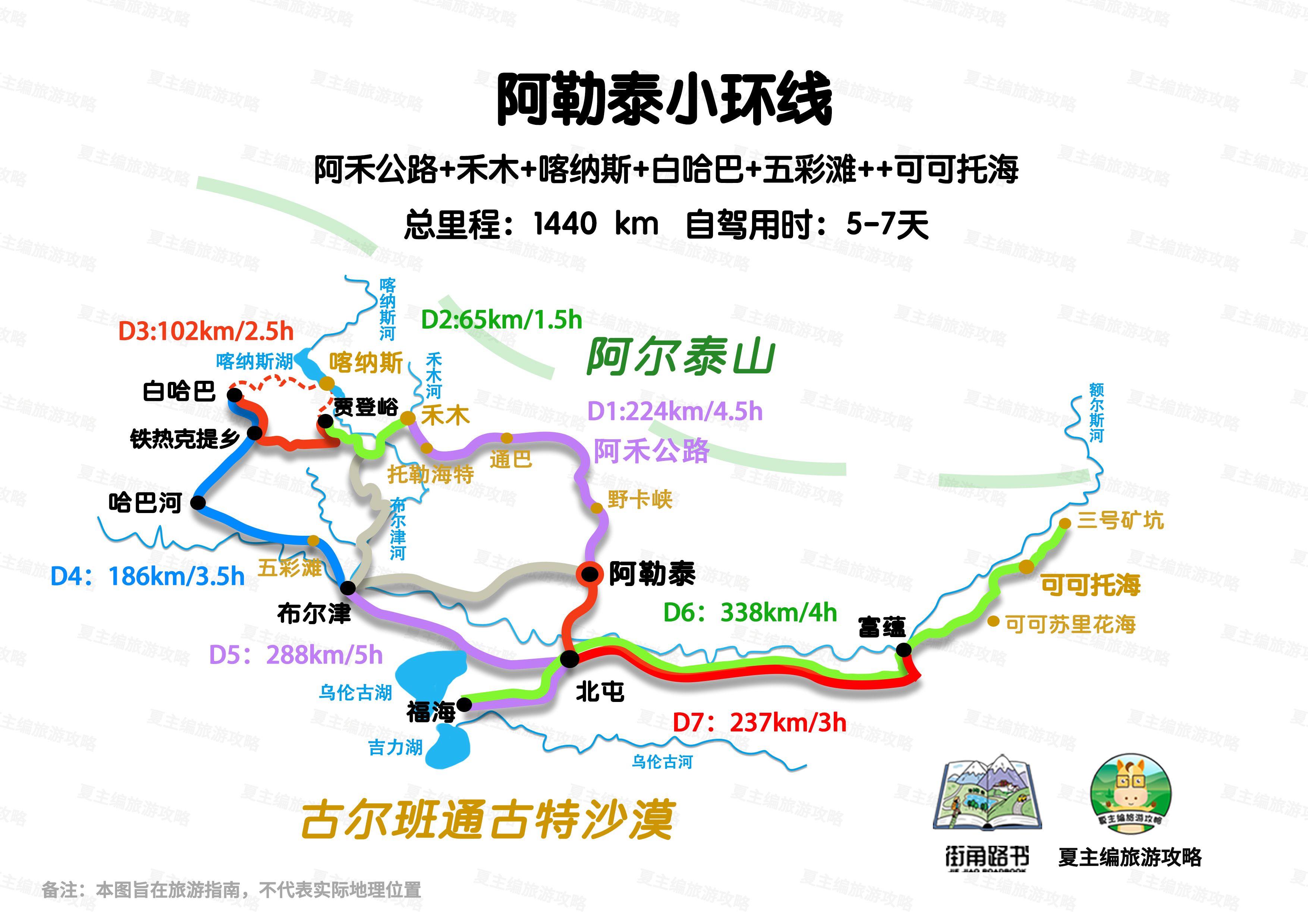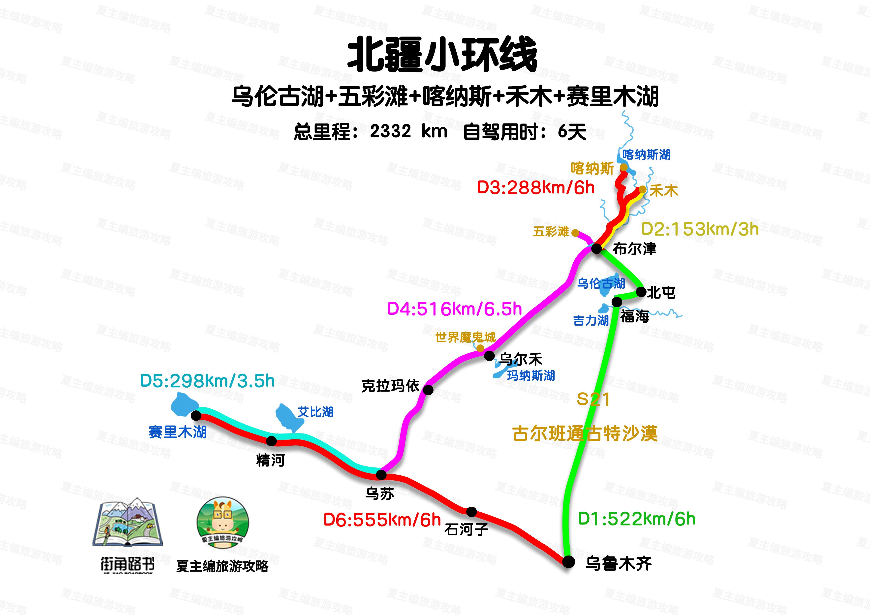 自驾线路:阿勒泰小环线、北疆小环线、喀纳斯环线、喀伊环线、北疆大大环线、全疆大环线。