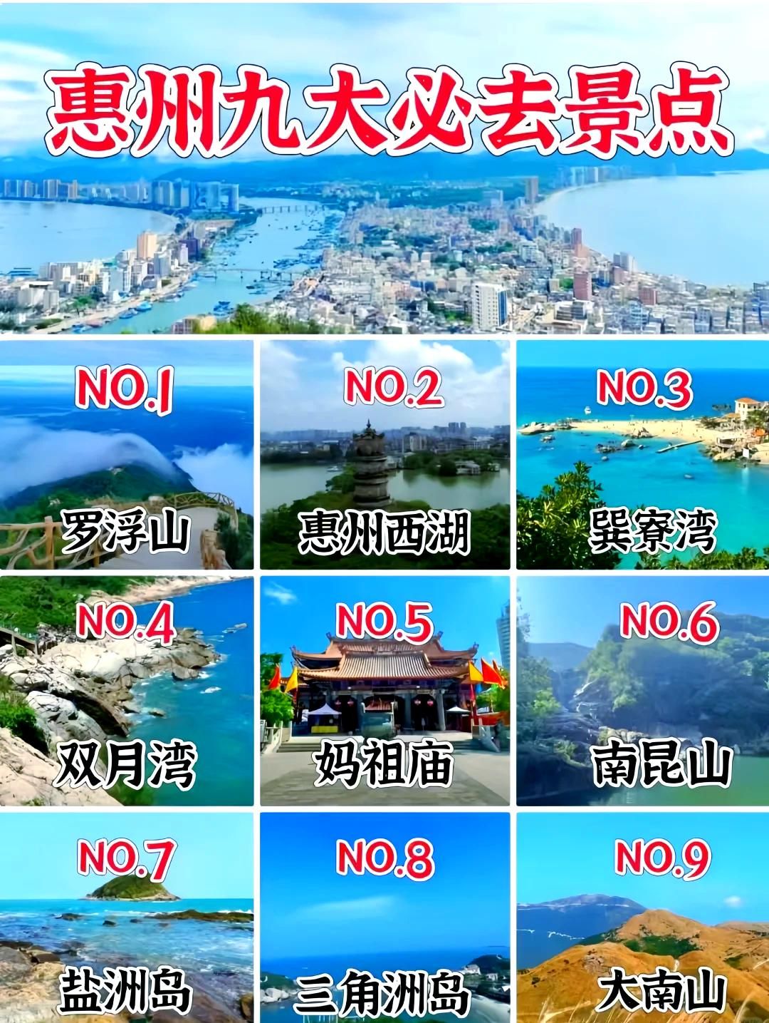 惠州旅行必打卡的九大景点!!#创作灵感 #惠州旅游攻略 如果你计划去广东惠州游玩,但不知道去哪里,这里有九个必打卡的景点推荐给你:惠州西湖、双月湾、南昆山国家森林公园、罗浮山、大南山、巽寮湾、三角洲岛、天后宫和盐洲岛。