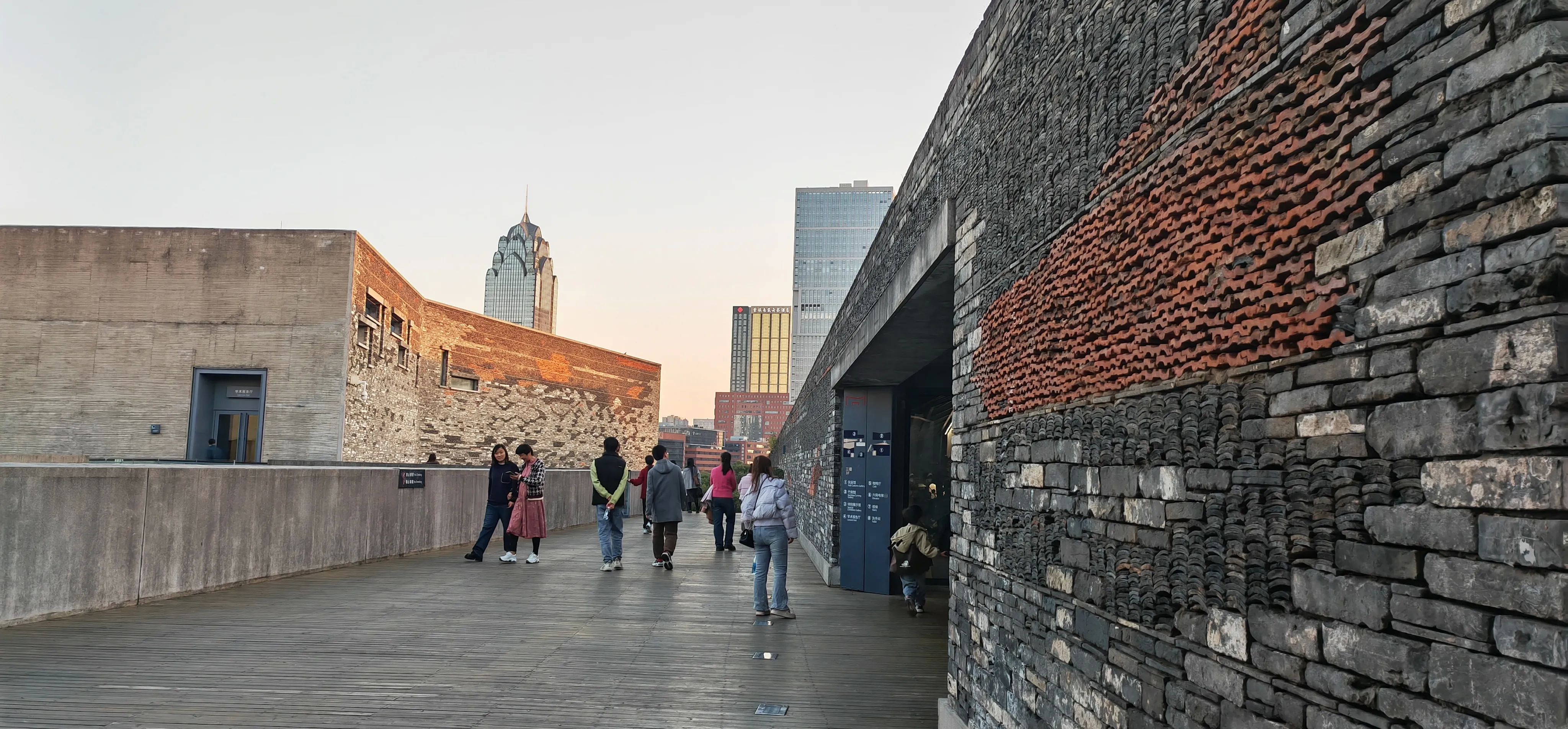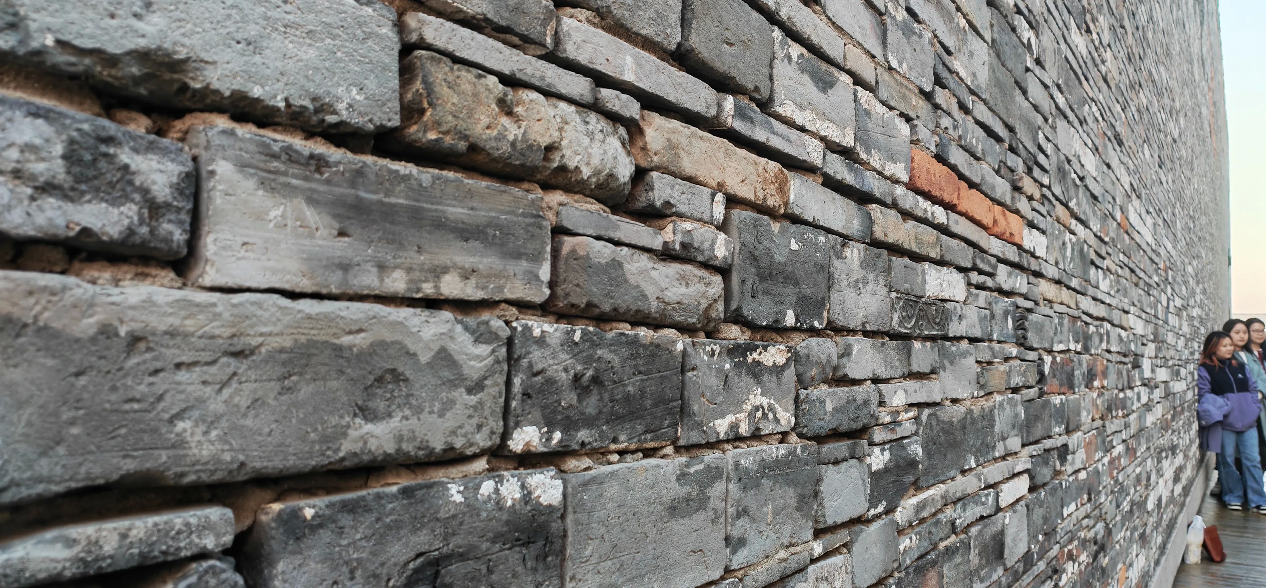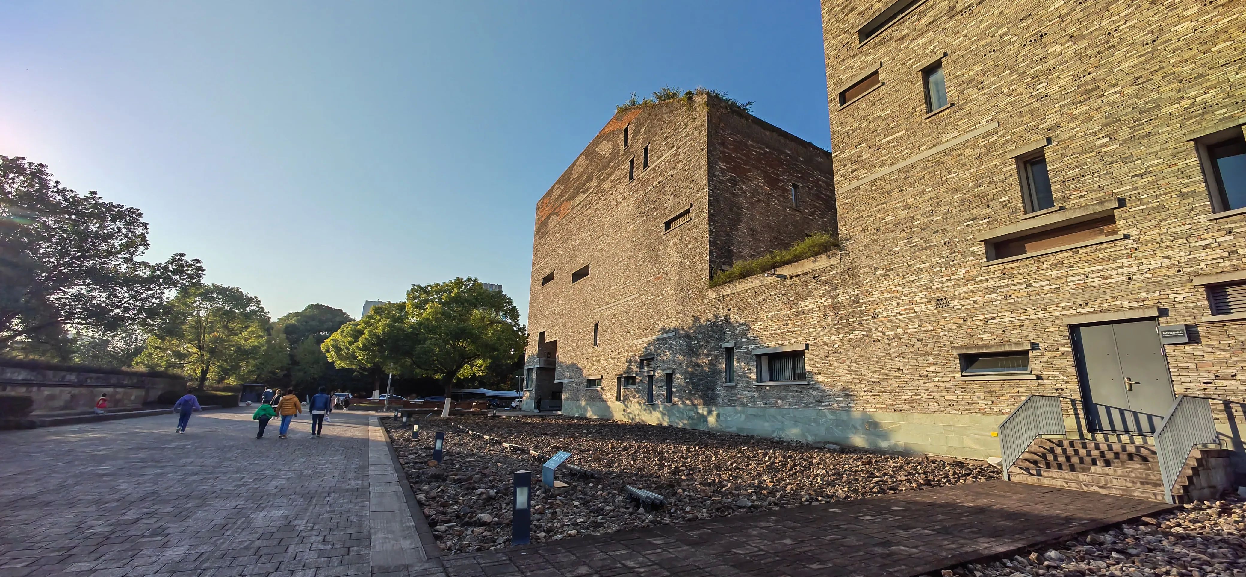 抬头仰望博物院建筑,每一块建筑砖块,都是来自曾经建筑用过的青灰砖,和少许红色的砖加以点缀。
