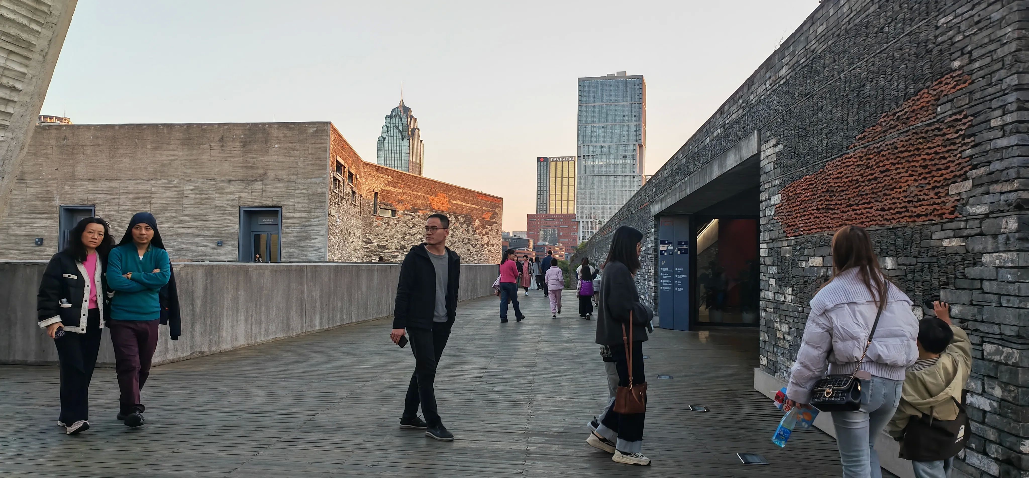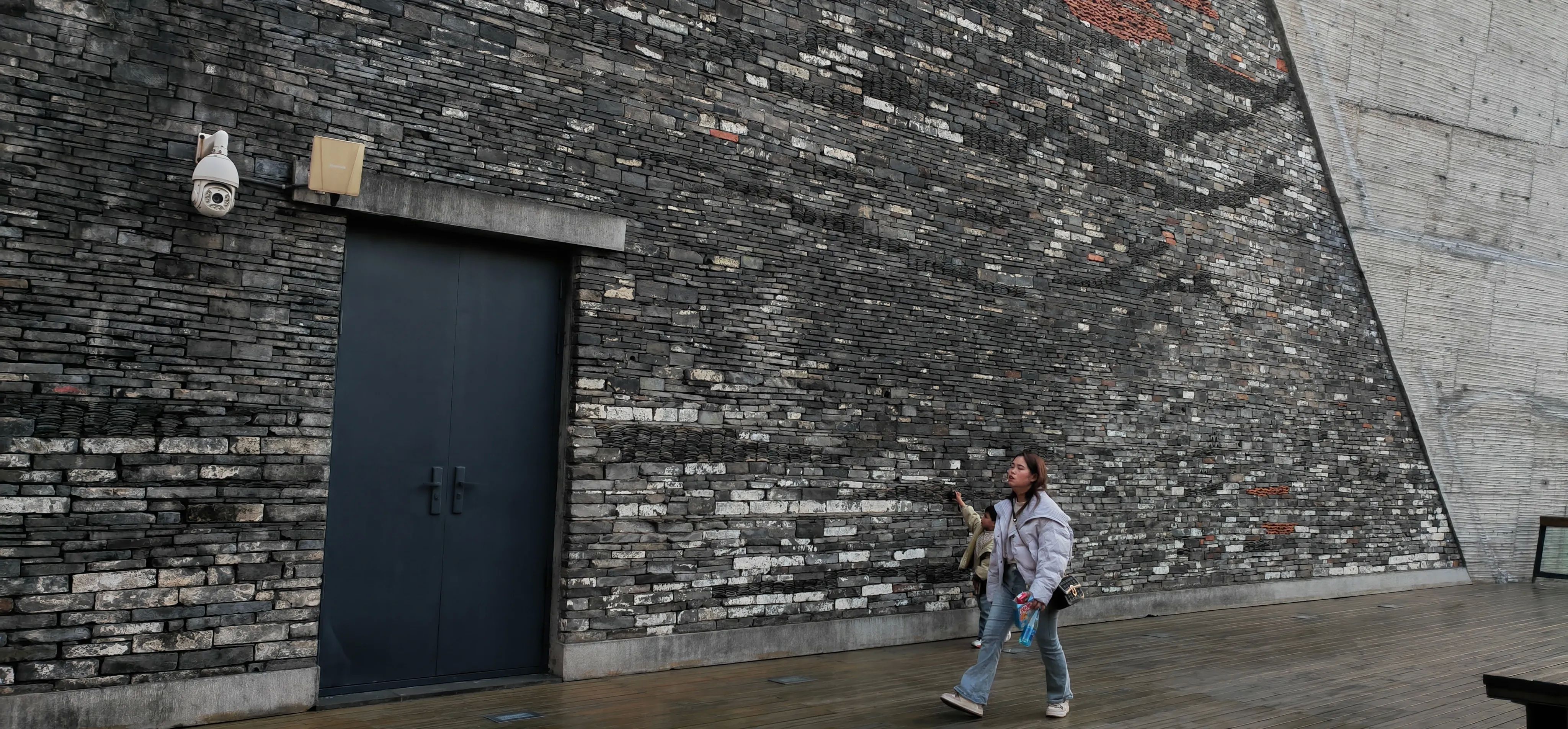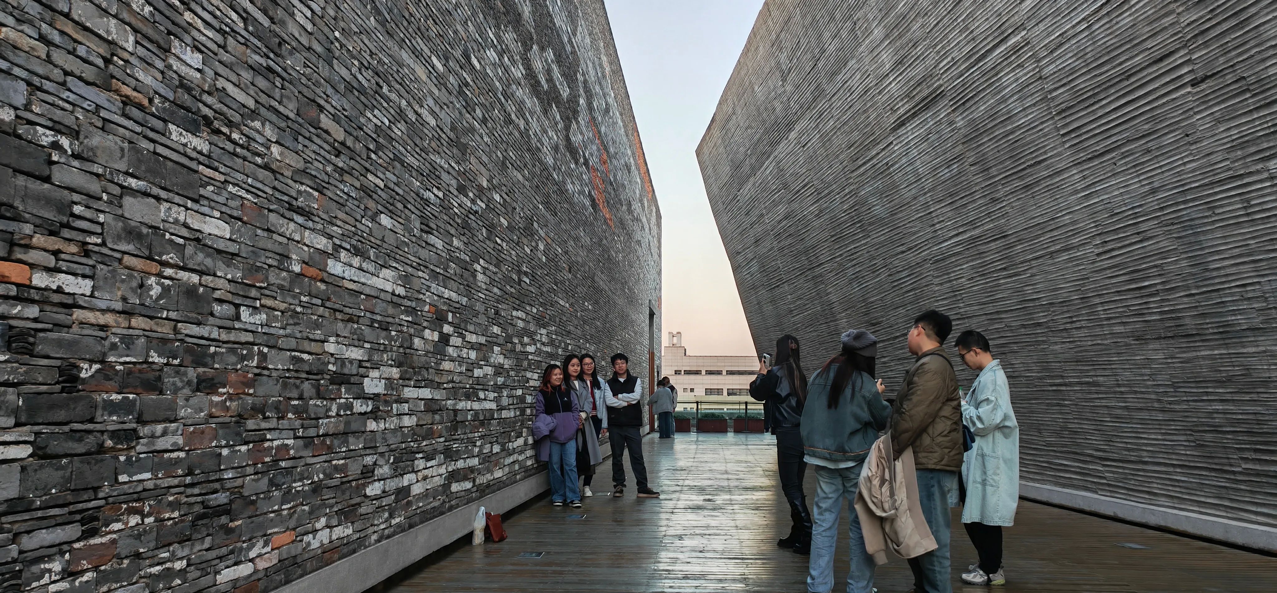 抬头仰望博物院建筑,每一块建筑砖块,都是来自曾经建筑用过的青灰砖,和少许红色的砖加以点缀。